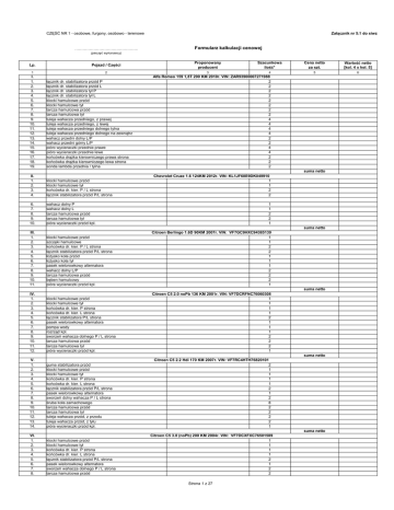 Załącznik nr 5.1 do siwz CZĘŚĆ NR 1 - osobowe, furgony, osobowo - terenowe ……………………………………….. Formularz kalkulacji cenowej (pieczęć wykonawcy) Lp. Pojazd / Części 1 2 I. 1. 2. 3. 4. 5. 6. 7. 8. 9. 10. 11. 12. 13. 14. 15. 16. 17. 18. 19. Proponowany producent Szacunkowa ilość* Cena netto za szt. Wartość netto [kol. 4 x kol. 5] 3 4 5 6 łącznik dr. stabilizatora przód P łącznik dr. stabilizatora przód L łącznik dr. stabilizatora tył P łącznik dr. stabilizatora tył L klocki hamulcowe przód klocki hamulcowe tył tarcza hamulcowa przód tarcza hamulcowa tył tuleja wahacza przedniego, z prawej tuleja wahacza przedniego, z lewej tuleja wahacza przedniego dolnego tylna tuleja wahacza przedniego dolnego na zewnątrz wahacz przedni dolny L/P wahacz przedni górny L/P pióro wycieraczki przednie prawe pióro wycieraczki przednie lewe końcówka drążka kierowniczego prawa strona końcówka drążka kierowniczego lewa strona sonda lambda przednia / tylna Alfa Romeo 159 1,8T 200 KM 2010r. VIN: ZAR93900007271988 2 2 2 2 2 2 2 2 4 4 4 4 2 2 4 4 2 2 2 II. 1. 2. 3. 4. klocki hamulcowe przód klocki hamulcowe tył końcówka dr. kier. P / L strona łącznik stabilizatora przód P/L strona Chevrolet Cruze 1.6 124KM 2012r. VIN: KL1JF68E9DK049910 1 1 2 2 6. 7. 8. 9. 10. wahacz dolny P wahacz dolny L tarcza hamulcowa przód tarcza hamulcowa tył pióra wycieraczki przód kpl. suma netto 1 1 2 2 1 suma netto III. 1. 2. 3. 4. 5. 6. 7. 8. 9. 10. 11. klocki hamulcowe przód szczęki hamulcowe końcówka dr. kier. P / L strona łącznik stabilizatora przód P/L strona łożysko koła przód łożysko koła tył pasek wielorowkowy alternatora wahacz dolny L/P tarcza hamulcowa przód bęben hamulcowy pióra wycieraczki przód kpl. Citroen Berlingo 1.6D 90KM 2007r. VIN: VF7GC9HXC94385139 1 1 2 2 1 1 1 2 2 2 1 klocki hamulcowe przód klocki hamulcowe tył końcówka dr. kier. P strona końcówka dr. kier. L strona łącznik stabilizatora P/L strona pasek wielorowkowy alternatora pompa wody rozrząd kpl. sworzeń wahacza dolnego P / L strona tarcza hamulcowa przód tarcza hamulcowa tył pióra wycieraczki przód kpl. Citroen C5 2.0 noPb 136 KM 2001r. VIN: VF7DCRFNC76060308 1 1 1 1 2 1 1 1 2 2 2 1 suma netto IV. 1. 2. 3. 4. 5. 6. 7. 8. 9. 10. 11. 12. suma netto V. 1. 2. 3. 4. 5. 6. 7. 8. 9. 10. 11. 12. 13. 14. guma stabilizatora przód klocki hamulcowe przód klocki hamulcowe tył końcówka dr. kier. P strona końcówka dr. kier. L strona łącznik stabilizatora przód P/L strona pasek wielorowkowy alternatora sworzeń dolny wahacza P / L strona śruba koła zamachowego tarcza hamulcowa przód tarcza hamulcowa tył tuleja wahacza przód, z przodu tuleja wahacza przód, z tyłu pióra wycieraczki przód kpl. Citroen C5 2.2 Hdi 170 KM 2007r. VIN: VF7RC4HTH76820101 2 1 1 1 1 2 1 2 8 2 2 2 2 1 suma netto VI. 1. 2. 3. 4. 5. 6. 7. 8. klocki hamulcowe przód klocki hamulcowe tył końcówka dr. kier. P strona końcówka dr. kier. L strona łącznik stabilizatora przód P/L strona pasek wielorowkowy alternatora sworzeń wahacza dolnego P / L strona tarcza hamulcowa przód Citroen C5 3.0 (noPb) 200 KM 2004r. VIN: VF7DCXFXC76501589 1 1 1 1 2 1 2 2 Strona 1 z 27 9. 10. 11. 12. tarcza hamulcowa tył tuleja wahacza przód, z przodu tuleja wahacza przód, z tyłu pióra wycieraczki przód kpl. 2 2 2 1 VII. 1. 2. 3. 4. 5. 6. 7. 8. 9. 10. 11. 12. 13. 14. Citroen Jumper 2.0 D 84KM 2003r. VIN: VF7ZBAMFB17320814 klocki hamulcowe przód 1 szczęki hamulcowe 1 końcówka dr. kier. P / L strona 2 łącznik stabilizatora przód P/L strona 2 łożysko koła przód 1 łożysko koła tył 1 pasek wielorowkowy alternatora 1 rolka napinacza, rolka napinająca paska wielorowkowego 1 rolka zwrotna (prowadząca) paska wielorowkowego 1 sworzeń dolny wahacza P / L strona 2 świeca żarowa 4 tarcza hamulcowa przód 2 bęben hamulcowy 2 pióra wycieraczki przód kpl. 1 VIII. 1. 2. 3. 4. 5. 6. 7. 8. 9. 10. 11. 12. 13. 14. 15. 16. 17. 18. 19. 20. 21. 22. 23. 24. Dacia Logan 1.6 87KM (noPb) 2006r. VIN: UU1LSDAFH36869582 cewka zapłonowa 1 cylinderek hamulca tył 4 klocki hamulcowe przód 1 szczęki hamulcowe 1 końcówka dr. kier. P strona 1 końcówka dr. kier. L strona 1 łącznik stabilizatora przód P/L strona 2 Łożysko koła przód 1 Łożysko koła tył 1 napinacz paska alternatora 2 osłona przegubu zewnętrznego 4 pasek alternatora 2 pompa wody 1 przewody zapłonowe - komplet 2 sworzeń wahacza P / L strona 2 szczęki hamulca – kompletne 2 świeca zapłonowa 8 tarcza hamulcowa przód (śred280mm,gr.12mm,osadzenie 33mm) 2 bęben hamulcowy 2 tuleja stabilizatora 2 tuleja wahacza przedniego dolnego tylna 8 tuleja wahacza przedniego dolnego przednia 8 pióra wycieraczki przód kpl. 1 zestaw rozrządu 1 suma netto suma netto suma netto IX. 1. 2. 3. 4. 5. 6. 7. 8. 9. 10. 11. 12. 13. 14. 15. klocki hamulcowe przód szczęki hamulcowe końcówka dr. kier. P strona końcówka dr. kier. L strona łącznik stabilizatora przód P/L strona Łożysko koła przód Łożysko koła tył pompa wody sworzeń wahacza P / L strona tarcza hamulcowa przód bęben hamulcowy uszczelniacz wału silnika tył włącznik światła cofania pióra wycieraczki przód kpl. zestaw rozrządu Daewoo Espero 1.5 90KM 1997r. VIN: KLALJF19V1VB221327 1 1 1 1 2 1 1 1 2 2 2 1 1 1 1 klocki hamulcowe przód końcówka dr. kier. P strona końcówka dr. kier. L strona korek wlewu oleju łożysko koła przód Łożysko koła tył pompa paliwa pompa wody przewód chłodnicy strzemię tłumika szczęki hamulcowe tarcza hamulcowa przód bęben hamulca tył uszczelka pompy paliwa uszczelka termostatu zawór nagrzewnicy Daewoo Lublin 2,4D 70KM 1998r. VIN: SUL338412W0035483 1 1 1 1 1 1 1 1 1 1 1 2 2 1 1 1 amortyzator przód amortyzator tył klocki hamulcowe przód klocki hamulcowe tył końcówka dr. kier. P / L strona łącznik stabilizatora przód P/L strona łącznik stabilizatora tył P/L strona łożysko kolumny McPherson łożysko koł