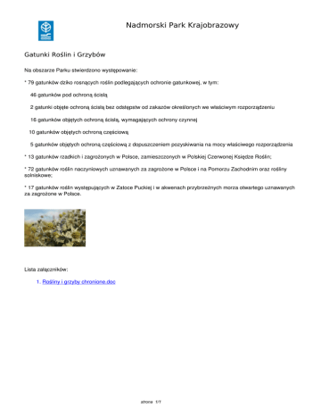 Nadmorski Park Krajobrazowy Gatunki Roślin i Grzybów Na obszarze Parku stwierdzono występowanie: * 79 gatunków dziko rosnących roślin podlegających ochronie gatunkowej, w tym: 46 gatunków pod ochroną ścisłą 2 gatunki objęte ochroną ścisłą bez odstępstw od zakazów określonych we właściwym rozporządzeniu 16 gatunków objętych ochroną ścisłą, wymagających ochrony czynnej 10 gatunków objętych ochroną częściową 5 gatunków objętych ochroną częściową z dopuszczeniem pozyskiwania na mocy właściwego rozporządzenia * 13 gatunków rzadkich i zagrożonych w Polsce, zamieszczonych w Polskiej Czerwonej Księdze Roślin; * 72 gatunków roślin naczyniowych uznawanych za zagrożone w Polsce i na Pomorzu Zachodnim oraz rośliny solniskowe; * 17 gatunków roślin występujących w Zatoce Puckiej i w akwenach przybrzeżnych morza otwartego uznawanych za zagrożone w Polsce. Lista załączników: 1. Rośliny i grzyby chronione.doc strona 1/1 Powered by TCPDF (www.tcpdf.org)