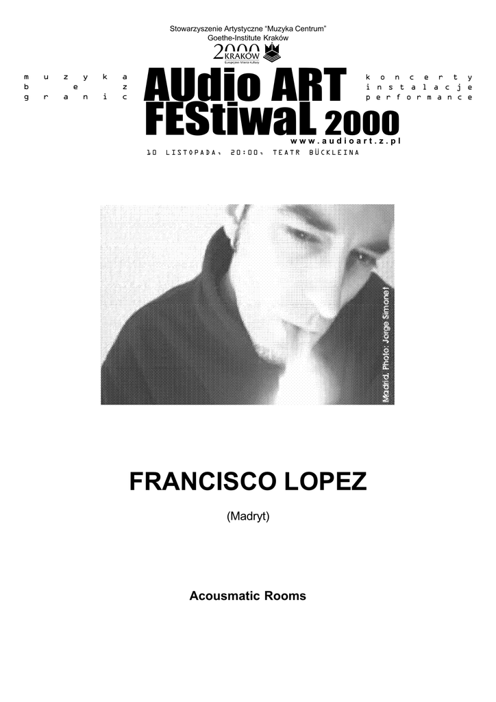 Stowarzyszenie Artystyczne Muzyka Centrum Goethe-Institute Kraków m b g u z r a e y k n i a z c AUdio ART FEStiwaL 2000 k o n c e r t y i n s t a l a c j e p e r f o r m a n c e www.audioart.z.pl 10 LISTOPADA, 20:00, TEATR BÜCKLEINA FRANCISCO LOPEZ (Madryt) Acousmatic Rooms Over the last twenty years Francisco Lopez has developed an astonishing sonic universe, absolutely personal and iconoclastic, based on a profound listening of the world. Destroying boundaries between industrial sounds and wilderness sound environments, shifting with passion from the limits of perception to the most dreadful abyss of sonic power, proposing a blind, profound and transcendental listening, freed from the imperatives of knowledge and open to sensory and spiritual expansion. One of the leading figures of the international experimental underground, he has realized concerts and sound installations all over Europe and the Americas, and his work has been released by more than fifty record companies throughout the world. Ponad ostatnim dwudziestu lat Francisco Lopez rozwija³ zadziwiaj¹cy dwiêkowy wszechwiat, absolutnie osobisty i obrazoburzcy, opierany na g³êbokim s³uchaniu wiata. Niszczenia granice miêdzy przemys³owymi dwiêkami i odludzia dwiêku otoczenia, przesuwaj¹c siê z namiêtnoci¹ od granic postrzegania do najbardziej strasznego otch³añ dwiêkowej potêgi, proponuj¹c lep¹, G³êboki i transcendentalny s³uchaj¹cy, uwalniany od trybów rozkazuj¹cych wiedzy i otwartego do czuciowy i duchowej rozszerzenie siê. Jeden z kierowniczych figur miêdzynarodowego dowiadczalnego metra, on realizowa³ zgody i dwiêku instalacje po Europie i Americas, i jego praca by³a wypuszczana przez wiêcej ni¿ piêædziesi¹t zapisu spó³ki przez wiat. The Acousmatic Rooms are a series of sound installations that try to forcefully express my purist approach to sound matter perception. Under this conception, any referential (relational, documentative, symbolic...) or complementary (visual, functional...) elements represent dissipative agents that drastically and unavoidably affect the experience and possibilities of pure profound listening. So far, I have created sound installations of this series, with different sound environments, in Madrid (*Acousmatic Room #1*, February 1998), Rotterdam (*A.R. #2*, April 1998) and Mexico City (*A. R. #3*, August 1998). The Acousmatic Room is typically an enclosed, empty, dark space with a multiple stereo sound projection system, where no sources of sounds (nor any other visual elements) can be seen. Digital sources of sounds (DATs and/or CDs) are played back through equipment placed in an adjacent room or in a hidden separated space within the room. Speakers and wires are also covered behind false "walls" of black fabric that re-define the empty space of the room. Depending on the characteristics of the installation, the room can be: (i) completely dark; the audience walk slowly or stand still; (ii) with a very dim light and matresses, where people lay on the floor blinfolded (this requires a bigger space). In either case, the entrance must necessarily have two/three successive thick black curtains, to minimize light interferences from the outside when people enter or leave the space. The room must obviously be as acoustically isolated as possible (windows covered with foam or similar, no noisy surroundings, etc.). Acousmatic Pokoje s¹ seria dwiêku instalacji który próbuj¹ silnie wyra¿aæ mój purysta nadchodzi brzmieæ materii postrzeganie. Pod tym koncepcj¹, jakiekolwiek referential (relational, documentative, symboliczny.) albo uzupe³niaj¹cy (wzrokowy, funkcjonalny.) elementy przedstawiaj¹ rozpraszaj¹cych agentów ¿e drastycznie i niechybnie udaj¹ dowiadczenie i mo¿liwoci czystego g³êbokiego s³uchania. Dotychczas, ja tworzy³em dwiêku instalacje tej serii, z ró¿nymi dwiêku otoczeniami, w Madrycie (*Acousmatic Pokoju #1*, luty 1998), Rotterdam (*A.R. #2*, kwiecieñ 1998) i Meksyk (*A.R. # 3*, sierpieñ 1998). Acousmatic Pokój typowy jest do³¹czony, pusta, ciemna przestrzeñ z wielorakim stereo dwiêku projektowanie systemem, gdzie ¿adne ród³a dwiêków (ani jakichkolwiek inny wzrokowych elementów) mog¹ byæ widziane. Cyfrowe ród³a dwiêków (DATs i / albo CDs) s¹ przegrywane przez wyposa¿enie umieszczane w granicz¹cym pokoju albo w ukrywanej rozdzielanej przestrzeni w granicach pokoju. Mówi¹ce i druty te¿ s¹ pokrywane za fa³szywymi "cianami" czarnego struktury którego przedefiniuj¹ pust¹ przestrzeñ pokoju. Zale¿enie od charakterystyki instalacji, pokoju mo¿e byæ: (i) zupe³nie ciemny; audiencji chód powoli albo stoi jeszcze; (ii) z bardzo przyæmiony lekkim i matresses, gdzie ludzie nak³adaj¹ pod³ogi blinfolded (tym wymaga wiêksz¹ przestrzeñ). W którymkolwiek przypadku, wejcie koniecznie musi mieæ dwa / trzy kolejne grube czarne zas³ony, pomniejszaæ lekkie ingerencje od zewn¹trz kiedy ludzie bêd¹ wchodziæ lub zostawiaj¹ przestrzeñ. Pokój oczywicie musi byæ tak akustycznie izolowa³o jak mo¿liwe (okna pokrywane z pian¹ albo podobny, ¿adne ha³aliwe otoczeñ, itd ). http://www.franciscolopez.net t³umaczenie algorytmiczne: English Translator