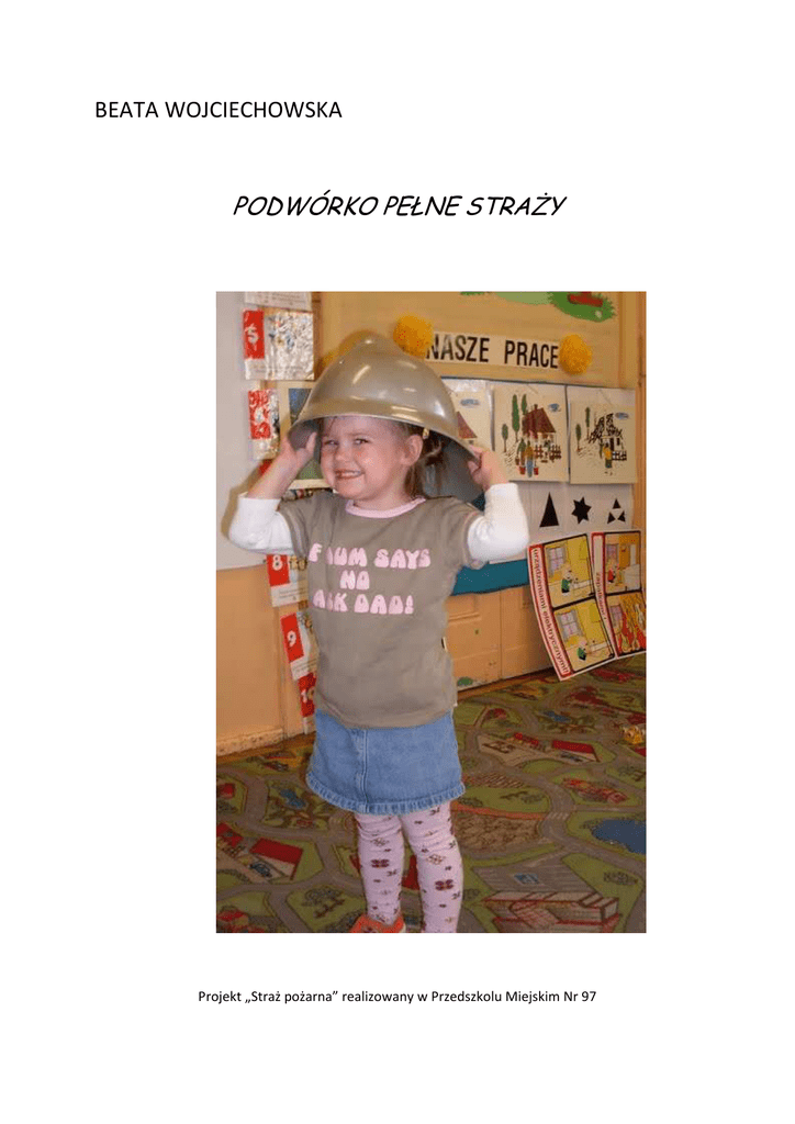 BEATA WOJCIECHOWSKA PODWÓRKO PEŁNE STRAśY Projekt „Straż pożarna” realizowany w Przedszkolu Miejskim Nr 97 Przedmiot i temat projektu: „StraŜ poŜarna”, to całodzienny projekt działań twórczych, którego tematem przewodnim był zawód straŜaka. Cele: • Budzenie zaciekawienia otaczającym światem poprzez prowokowanie pytań i dostarczanie radości odkrywania. • Dostrzegania i opisywania różnic, podobieństw i relacji między przedmiotami i zjawiskami. Stwarzanie okazji do porządkowania, klasyfikowania i liczenia. • Wspieranie samodzielnych działań dziecka. Pomaganie dziecku w dostrzeganiu problemów, planowaniu i realizacji zadań. • Tworzenie okazji do wspólnego podejmowania i realizowania różnych zadań, rozwiązywania problemów. Uczestnicy działania: Uczestnikami projektu były dzieci w wieku od 3 do 6 lat uczęszczające do Przedszkola Miejskiego Nr 97. Miejsce zajęć plenerowych: Zajęcia odbywały się na terenie Przedszkola Miejskiego w Łodzi. Znaczna ich cześć odbywała się w przedszkolnym ogrodzie. Nr 97 Fazy realizacji projektu, opis działania: 1. Powitanie, rozmowy indywidualne. 2. Zabawa ruchowa „Pali się” – zabawy z hula-hop i szarfami. 3. „Co ja mam na głowie?” – rozbudzenie dziecięcej ciekawości strojem nauczycielki (hełm straŜacki). Przedstawienie tematu zajęć. Stworzenie siatki projektu – „Co wiem o straŜakach? Jak wygląda wóz straŜacki? Jak wygląda strój straŜaka? O co spytałbym straŜaka?” – nadawanie roli i znaczenia straŜy poŜarnej, ustalenie numeru alarmowego. 4. „Alarm poŜarowy” – symulacja alarmu poŜarowego, zainicjowanie sztucznej sytuacji zagroŜenia, wyjście do przedszkolnego ogrodu. 5. Mini drama „Halo, straŜ?” – telefoniczne poinformowanie straŜy poŜarnej o poŜarze w przedszkolu. 6. Spotkanie ze straŜakami – spotkanie ze straŜakami, oglądanie wozu straŜackiego, stroju straŜaka, wywiad ze straŜakiem (poznanie jego zadań słuŜbowych). 7. „Zawody straŜackie” – sprawnościowy tor przeszkód z wykorzystaniem lin, ławeczek, drabinek, itp. 8. Praca plastyczno-konstrukcyjna – konstruowanie wozu straŜackiego z pudeł kartonowych oraz dostępnych materiałów i odpadków. 9. Zabawy ruchowe z chusta animacyjna w rytm piosenki „StraŜak, to bohater”. 10. „StraŜacka parada” – uroczyste wręczenie medali i odznaki straŜaka. 11. Podsumowanie projektu, ewaluacja. Środki dydaktyczne: Hula-hop, szarfy, hełm straŜacki, mazaki i duŜe kartony do sporządzenia siatki projektu, tablica z numerem alarmowym do straŜy poŜarnej, telefon komórkowy, liny, ławeczki, drabinki, pudła kartonowe, materiały wtórnego uŜytku, odtwarzacz CD i nagranie piosenki „StraŜak, to bohater”, medale i odznaki straŜaka. UWAGA: Przed realizacja projektu naleŜy umówić się z okolicznym Oddziałem StraŜy PoŜarnej. Wiele radości sprawiła dzieciom moŜliwość zasiadania w najprawdziwszym wozie straŜacki. Dzieci chętnie przeprowadzały wywiad ze strażakami, pytały miedzy innymi o to: • • • • • • • • • • • • Jak się podnosi drabinę? Jak się wyciąga wąż, żeby go nie zepsuć? Skąd się bierze woda w samochodzie?? Jak się zakłada butlę z tlenem? Czy strażacy zawsze muszą mieć hełmy? Ile drabina ma metrów, schodków? Co znajduje się w kabinie, jakie są przyciski? Ile kół ma wóz strażacki? Ile miejsc dla strażaków jest w wozie strażackim? Czym się gasi pożar? Czy wszystko gasi się wodą? Co by się stało, gdyby strażak zapomniał hełmu, pojedzie bez? Wszystko moŜna policzyć, dotknąć, o wszytsko zapytać… A tak powstawał nasz własny wóz straŜacki