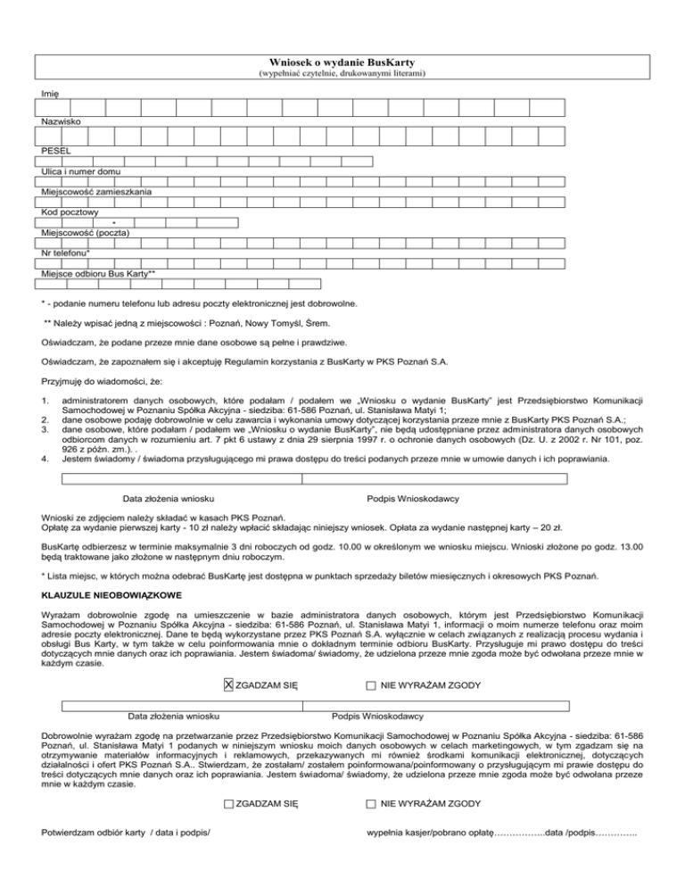 Wniosek o wydanie BusKarty (wypełniać czytelnie, drukowanymi literami) Imię Nazwisko PESEL Ulica i numer domu Miejscowość zamieszkania Kod pocztowy Miejscowość (poczta) Nr telefonu* Miejsce odbioru Bus Karty** * - podanie numeru telefonu lub adresu poczty elektronicznej jest dobrowolne. ** Należy wpisać jedną z miejscowości : Poznań, Nowy Tomyśl, Śrem. Oświadczam, że podane przeze mnie dane osobowe są pełne i prawdziwe. Oświadczam, że zapoznałem się i akceptuję Regulamin korzystania z BusKarty w PKS Poznań S.A. Przyjmuję do wiadomości, że: 1. 2. 3. 4. administratorem danych osobowych, które podałam / podałem we „Wniosku o wydanie BusKarty” jest Przedsiębiorstwo Komunikacji Samochodowej w Poznaniu Spółka Akcyjna - siedziba: 61-586 Poznań, ul. Stanisława Matyi 1; dane osobowe podaję dobrowolnie w celu zawarcia i wykonania umowy dotyczącej korzystania przeze mnie z BusKarty PKS Poznań S.A.; dane osobowe, które podałam / podałem we „Wniosku o wydanie BusKarty”, nie będą udostępniane przez administratora danych osobowych odbiorcom danych w rozumieniu art. 7 pkt 6 ustawy z dnia 29 sierpnia 1997 r. o ochronie danych osobowych (Dz. U. z 2002 r. Nr 101, poz. 926 z późn. zm.). . Jestem świadomy / świadoma przysługującego mi prawa dostępu do treści podanych przeze mnie w umowie danych i ich poprawiania. Data złożenia wniosku Podpis Wnioskodawcy Wnioski ze zdjęciem należy składać w kasach PKS Poznań. Opłatę za wydanie pierwszej karty - 10 zł należy wpłacić składając niniejszy wniosek. Opłata za wydanie następnej karty – 20 zł. BusKartę odbierzesz w terminie maksymalnie 3 dni roboczych od godz. 10.00 w określonym we wniosku miejscu. Wnioski złożone po godz. 13.00 będą traktowane jako złożone w następnym dniu roboczym. * Lista miejsc, w których można odebrać BusKartę jest dostępna w punktach sprzedaży biletów miesięcznych i okresowych PKS Poznań. KLAUZULE NIEOBOWIĄZKOWE Wyrażam dobrowolnie zgodę na umieszczenie w bazie administratora danych osobowych, którym jest Przedsiębiorstwo Komunikacji Samochodowej w Poznaniu Spółka Akcyjna - siedziba: 61-586 Poznań, ul. Stanisława Matyi 1, informacji o moim numerze telefonu oraz moim adresie poczty elektronicznej. Dane te będą wykorzystane przez PKS Poznań S.A. wyłącznie w celach związanych z realizacją procesu wydania i obsługi Bus Karty, w tym także w celu poinformowania mnie o dokładnym terminie odbioru BusKarty. Przysługuje mi prawo dostępu do treści dotyczących mnie danych oraz ich poprawiania. Jestem świadoma/ świadomy, że udzielona przeze mnie zgoda może być odwołana przeze mnie w każdym czasie. X ZGADZAM SIĘ Data złożenia wniosku NIE WYRAŻAM ZGODY Podpis Wnioskodawcy Dobrowolnie wyrażam zgodę na przetwarzanie przez Przedsiębiorstwo Komunikacji Samochodowej w Poznaniu Spółka Akcyjna - siedziba: 61-586 Poznań, ul. Stanisława Matyi 1 podanych w niniejszym wniosku moich danych osobowych w celach marketingowych, w tym zgadzam się na otrzymywanie materiałów informacyjnych i reklamowych, przekazywanych mi również środkami komunikacji elektronicznej, dotyczących działalności i ofert PKS Poznań S.A.. Stwierdzam, że zostałam/ zostałem poinformowana/poinformowany o przysługującym mi prawie dostępu do treści dotyczących mnie danych oraz ich poprawiania. Jestem świadoma/ świadomy, że udzielona przeze mnie zgoda może być odwołana przeze mnie w każdym czasie. ZGADZAM SIĘ Potwierdzam odbiór karty / data i podpis/ NIE WYRAŻAM ZGODY wypełnia kasjer/pobrano opłatę……………..data /podpis…………..