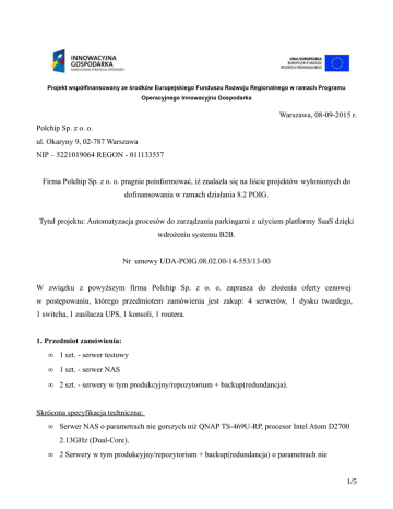 Projekt współfinansowany ze środków Europejskiego Funduszu Rozwoju Regionalnego w ramach Programu Operacyjnego Innowacyjna Gospodarka Warszawa, 08-09-2015 r. Polchip Sp. z o. o. ul. Okaryny 9, 02-787 Warszawa NIP – 5221019064 REGON - 011133557 Firma Polchip Sp. z o. o. pragnie poinformować, iż znalazła się na liście projektów wyłonionych do dofinansowania w ramach działania 8.2 POIG. Tytuł projektu: Automatyzacja procesów do zarządzania parkingami z użyciem platformy SaaS dzięki wdrożeniu systemu B2B. Nr umowy UDA-POIG.08.02.00-14-553/13-00 W związku z powyższym firma Polchip Sp. z o. o. zaprasza do złożenia oferty cenowej w postępowaniu, którego przedmiotem zamówienia jest zakup: 4 serwerów, 1 dysku twardego, 1 switcha, 1 zasilacza UPS, 1 konsoli, 1 routera. 1. Przedmiot zamówienia: • 1 szt. - serwer testowy • 1 szt. - serwer NAS • 2 szt. - serwery w tym produkcyjny/repozytorium + backup(redundancja). Skrócona specyfikacja techniczna: • Serwer NAS o parametrach nie gorszych niż QNAP TS-469U-RP, procesor Intel Atom D2700 2.13GHz (Dual-Core). • 2 Serwery w tym produkcyjny/repozytorium + backup(redundancja) o parametrach nie 1/5 Projekt współfinansowany ze środków Europejskiego Funduszu Rozwoju Regionalnego w ramach Programu Operacyjnego Innowacyjna Gospodarka gorszych niż: 1 x Procesor Intel Xeon E5620 (2,40GHz, 4C, 12MB pamięci podręcznej, 5,86 GT/s QPI, TDP 80W). • Serwer testowy o parametrach nie gorszych niz Intel Xeon E3-1220, 4C/4T, 3.10GHz, 8M Cache,80W TDP, Turbo. Przeznaczenie ogólne: Powyższe serwery posłużą do udostępnienia platformy w trybie HA (high availability) czyli o stałej dostępności. Procesy wymiany danych pomiędzy serwerami Partnerów a platformą Polchip Sp. z o. o. muszą być zautomatyzowane ponieważ najczęściej uruchamia się tego typu zadania w nocy, kiedy jest najmniejsze obciążenie całej infrastruktury. Szczególnie ważna będzie część platformy obsługująca transakcje płatności kartami zbliżeniowymi. Do tego celu należy wyznaczyć serwer redundantny - wymiana danych będzie się odbywać 24h na dobę. Ponadto platforma ma być skalowalna, dlatego też do serwera redundantnego potrzebny jest serwer produkcyjny, aby zagwarantować HA czyli działanie non stop aplikacji i przełączenie się na serwer zapasowy (NAS) w przypadku wystąpienia awarii. Firma zamierza zakupić powyższe serwery w celu prawidłowego działania platformy. Na serwerze testowym będą realizowane następujące funkcje: development i testowanie systemu, serwer jest konieczny do osadzenia na nich systemu B2B. 2. Przedmiot zamówienia: • Dysk twardy do NAS'a – 1 szt. Skrócona specyfikacja techniczna: Dysk twardy do NAS'a o parametrach nie gorszych niż WD RE,4TB WD4000FYYZ Przeznaczenie ogólne: Posłuży min. jako dysk systemowy do codziennej pracy. Umożliwi przechowywanie dużej ilości plików oraz posłuży jako ewentualne dodatkowe archiwum danych. 2/5 Projekt współfinansowany ze środków Europejskiego Funduszu Rozwoju Regionalnego w ramach Programu Operacyjnego Innowacyjna Gospodarka 3. Przedmiot zamówienia: • Switch – szt. 1 Skrócona specyfikacja techniczna: Switch o parametrach nie gorszych niż Zyxel GS1910-24HP Przeznaczenie ogólne: Zabezpieczenie zwiększonego przez system B2B ruchu w sieci internetowej. 4. Przedmiot zamówienia: • zasilacz UPS – szt 1. Skrócona specyfikacja techniczna: Zakup nowych środków trwałych: Zasilacz UPS o parametrach nie gorszych niż UPS SINLINE Pro 4000 19"3U Przeznaczenie ogólne: Odizolowanie serwera od zakłóceń w sieci zasilającej. 5. Przedmiot zamówienia: • konsola – szt. 1 Skrócona specyfikacja techniczna: Konsola o parametrach nie gorszych niż Konsola KVM LCD 3/5 Projekt współfinansowany ze środków Europejskiego Funduszu Rozwoju Regionalnego w ramach Programu Operacyjnego Innowacyjna Gospodarka Przeznaczenie ogólne: Konsola ta będzie służyła do administracji systemu B2B. 6. Przedmiot zamówienia: • 1 szt. - ROUTER Skrócona specyfikacja techniczna: Router o parametrach nie gorszych niż Supermicro X7SPE-HF_D52 5 + pfSense Przeznaczenie ogólne: Zarządzanie kierowania ruchem w sieci. Firma zamierza udostępniać usługę SaaS, co wiąże się z koniecznością stałego i dobrego łącza internetowego, a tym samym routera posiadającego najnowsze standardy do wykonywania tej czynności. Przy wyborze oferty firma będzie kładła główny nacisk na wydatkowanie środków w sposób celowy i oszczędny, z zachowaniem zasady uzyskiwania najlepszych efektów z danych nakładów. Wybór wykonawcy nastąpi w oparciu o następujące kryteria: • 50% cena, • 40% funkcjonalność • 10% serwis Oferty powinny zawierać numer, nazwę oferenta, datę, dane osoby kontaktowej, nazwę i opis oferowanego produktu wraz z parametrami technicznymi, wartość netto oraz brutto, warunki płatności, okres ważności oferty, termin i warunki dostawy. Oferty winny być zgłoszone w formie pisemnej w języku polskim lub angielskim. Zamawiający nie dopuszcza składania ofert częściowych. Przesłane 4/5 Projekt współfinansowany ze środków Europejskiego Funduszu Rozwoju Regionalnego w ramach Programu Operacyjnego Innowacyjna Gospodarka oferty muszą być podpisane. Termin wykonania zamówienia: do 25-09-2015 r. Beneficjent może zmienić warunki udzielenia zamówienia lub unieważnić postępowanie konkursowe. Oceny ofert dokona specjalnie powołana w tym celu komisja. Osobą do kontaktu ze strony Beneficjenta jest: Anna Hubner tel. 22 644 88 08 [email protected] Zapraszamy zainteresowane firmy do składania ofert na adres pocztowy: Polchip Sp. z o. o. ul. Okaryny 9, 02-787 Warszawa lub bezpośrednio w siedzibie firmy: Polchip Sp. z o. o. ul. Okaryny 9, 02-787 Warszawa Istnieje możliwość złożenia oferty w formie elektronicznej na adres Beneficjenta [email protected] z zastrzeżeniem, że w przypadku wyboru oferty Wykonawcy, Wykonawca w cią
