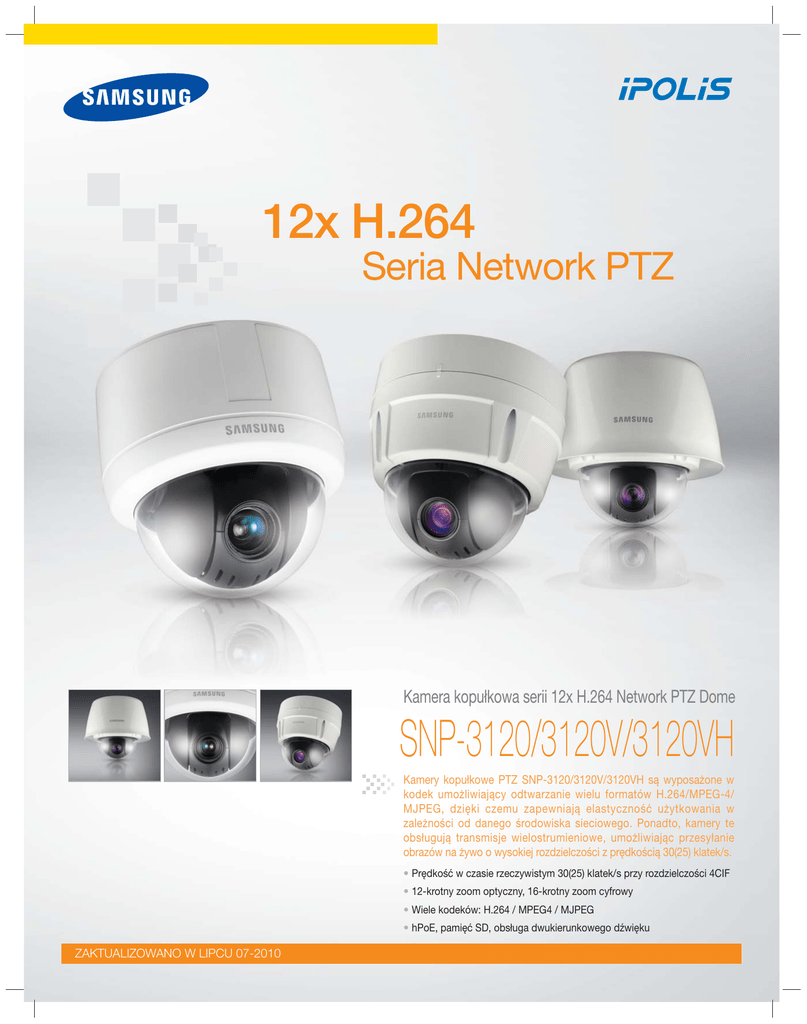 12x H.264 Seria Network PTZ Kamera kopułkowa serii 12x H.264 Network PTZ Dome SNP-3120/3120V/3120VH Kamery kopułkowe PTZ SNP-3120/3120V/3120VH są wyposażone w kodek umożliwiający odtwarzanie wielu formatów H.264/MPEG-4/ MJPEG, dzięki czemu zapewniają elastyczność użytkowania w zależności od danego środowiska sieciowego. Ponadto, kamery te obsługują transmisje wielostrumieniowe, umożliwiając przesyłanie obrazów na żywo o wysokiej rozdzielczości z prędkością 30(25) klatek/s. • Prędkość w czasie rzeczywistym 30(25) klatek/s przy rozdzielczości 4CIF • 12-krotny zoom optyczny, 16-krotny zoom cyfrowy • Wiele kodeków: H.264 / MPEG4 / MJPEG • hPoE, pamięć SD, obsługa dwukierunkowego dźwięku ZAKTUALIZOWANO W LIPCU 07-2010 Kamera kopułkowa serii 12x H.264 Network PTZ Dome SNP-3120/3120V/3120VH 4CIF 12x 128x 160x D&N ICR 24VAC Dane techniczne SNP-3120N/SNP-3120VN/SNP-3120VHN SNP-3120 SNP-3120V SNP-3120VH Wymiary 108108 (4.25") 168 168 (6.61") Jednostka: mm Ø174 (6.85") Ø174 Ø174 (6.85") Ø174 102.5 (4.04") 102.5 165165 (6.5") SNP-3120 Ø115 Ø115 (4.53") Ø165 Ø165 (6.5") 120 120 (4.72") 203 203 (7.99") 19 (0.75") SNP-3120V Ø115 Ø115 (4.53") Ø200 (7.87") Ø200 SNP-3120VH Znak Eco oznacza, że firma Samsung Techwin dba o to, aby jej produkty były przyjazne środowisku oraz, że dany produkt jest zgodny z dyrektywą EU RoHS. WIDEO Urządzenie obrazujące Całkowita liczba pikseli Efektywna liczba pikseli System skanowania Synchronizacja Częstotliwość Rozdzielczość pozioma Min. oświetlenie Współczynnik sygnał/szum Wyjście wideo OBIEKTYW SNP-3120P/SNP-3120VP/SNP-3120VHP 1/4-calowy przetwornik CCD Ex-view HAD PS 811(poz.) x 508(pion.) 795(poz.) x 596(pion.) 768(poz.) x 494(pion.) 752(poz.) x 582(pion.) Wybieranie kolejnoliniowe (VPS WŁ.) (Przy włączonej funkcji WDR, wybieranie międzyliniowe) Blokada wewnętrzna/linii poz. : 15.734KHz / pion. : 59.94Hz poz. : 15.625KHz / pion. : 50Hz Kolor : 600 linii TV Kolor : 0,7 Lux (F1.65, 50IRE), 0,001 Lux (Sens up 512x), B/W : 0,07Lux (F1.65, 50IRE), 0,0001 Lux (Sens up 512x) 50 dB CVBS: Zespolony sygnał wizyjny 1,0 Vp-p / 75Ω Odległość ogniskowa (współczynnik zoomu) 3.69~44.32mm (12x) F1.65(Panoramiczny) / F2.01(Tele) Maks. otwór przesłony H : 54.44˚(Panoramiczny) ~ 4.62˚(Tele) / V : 42.32˚(Panoramiczny) ~ 3.58˚(Tele) Kąt pola widzenia 0.2m (Panoramiczny) / 0.8m (Tele) Min. odległość obiektu AF / One-Shot AF / Ręczny Regulacja ostrości Autom. przysł. DC Rodzaj obiektywu PANORAM./ODCHYL./OBR. 360˚ Nieograniczone Zakres pan. Ustawienie wst. : 650˚/s, Ręczne : 0.05˚/s ~120˚/s (Turbo:200˚/s) Prędkość pan. -5˚~185˚ Zakres odchylenia Ustawienie wstępne: 650˚/s, Ręczny: 0,05˚/s -120˚/s Prędkość odchylania 255 ea Ustawienie wst. Dokładność ustawienia wstępnego ±0.1˚ Informacje dotyczące obsługi Wyświetlanie informacji na ekranie (OSD) angielski, francuski, niemiecki, hiszpański, włoski, koreański, portugalski angielski, francuski, niemiecki, hiszpański, włoski, chiński, portugalski Wył./wł. (wyświetlane do 12 znaków) Tytuł kamery Autom. (ICR) / kolorowy/ czarno-biały Dzień i noc Kompensacja podświetlenia Wył. / BLC / WDR 160x Funkcja szerokiego zakresu dynamiki 128x XDR (Funkcja rozszerzonego zakresu dynamicznegoi) (Wył./Niski/Średni/Wysoki) Zakres dynamiczny Redukcja szumów cyfrowych Filtr szumu 2D+3D z adaptacją do ruchu (Wył./Niski/Średni/Wysoki) Cyfrowa stabilizacja obrazu Wył./wł. Tak Wykrywanie ruchu Wył./wł. (12 wielokątnych programowalnych stref) Maska prywatności Nasycenie (Integracja obrazu) Wył./autom. (2x-512x) Wył./Niskie/średnie/wysokie/WYŁ. Regulacja wzmocnienia ATW (Wejście) / ATW (Wyjście) / AWC / Ręczna Balans bieli Prędkość elektronicznej migawki Wył. / A.FLK / Ręczna (1/120 ~ 1/10Ksec) 16x Cyfrowy zoom Cyfrowe odwrócenie Obrót/Lustro Wył./wł. VPS Moved / Fixed Inteligentna analiza wideo Wejście 2 / Wyjście 2 (przekaźnikowe) Wej./wyj. alarmu RS-485, CCVC(PELCO Coaxitron) Interfejs pilota SAMSUNG T/E, PELCO-P/D, Panasonic, Honeywell, AD, Vicon, GE, Bosch Protokół RS-485 SIEĆ RJ-45 (10/100BASE-T) Ethernet H.264, MPEG4, MJPEG Format kompresji wideo 704 x 480, 640 x 480, 352 x 240, 320 x 240 704 x 576, 640 x 480, 352 x 288, 320 x 240 Rozdzielczość 25 klatek/s Maks. prędkość odświeżania 30 klatek/s H.264/MPEG4: Poziom kompresji, sterowanie poziomem docelowej szybkości transmisji, MJPEG: Regulacja poziomu jakości Regulacja jakości wideo Metoda sterowania szybkością transmisji H.264/MPEG4: CBR lub VBR, MJPEG: VBR Możliwości transmisji strumieniowej Wiele kodeków (do 10 profili) We/Wy liniowe Wej./wyj. audio G.711 u-law Format kompresji audio 2-kierunkowa Komunikacja dźwiękowa IPv4, IPv6 IP TCP/IP, UDP/IP, RTP(UDP), RTP(TCP), RTSP, NTP, HTTP, HTTPS, SSL, DHCP, PPPoE Protokół FTP, SMTP, ICMP, IGMP, SNMPv1/v2c/v3(MIB-2), ARP, DNS, DDNS HTTPS(SSL) Autoryzacja logowania, Uwierzytelnienie logowania Digest, Filtrowanie adresu IP, Dziennik dostępu użytkownika Zabezpieczenia Metoda transmisji strumieniowej Unicast/Multicast Maks. dostęp użytkowników 10 użytkowników w trybie Unicast Gniazdo pamięci SD/SDHC Gniazdo blokady Tak Zgodność z ONVIF Obsługiwany system operacyjny: Windows XP / VISTA / 7, MAC OS Przeglądarka internetowa Obsługiwana przeglądarka: Internet Explorer 6.0 lub nowsza wersja, Firefox, Google Chrome, Apple Safari Oprogramowanie do centralnego Przeglądarka NET-i zarządzania DANE UŻYTKOWE SNP-3120 : Od -10°C do +50°C / Mniej niż 90% wilgotności względnej , SNP-3120V / SNP-3120VH : Od -50°C do +50°C / Mniej niż 90% wilgotności względnej Temperatura robocza/wilgotność IP66 (SNP-3120V, SNP-3120VH) * Brak obsługi przez SNP-3120 Stopień ochrony kamery DANE DOTYCZĄCE ZASILANIA 24V AC, hPoE(IEEE802.3at) Napięcie i prąd wejściowy SNP-3120 : Maks. 15W, SNP-3120V / SNP-3120VH : Maks. 15W (Nagrzewnica Wył.), Maks. 45W (Nagrzewnica Wł.) Pobór mocy D
