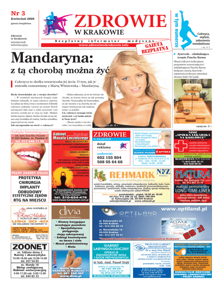 Kwiecieñ 2009 ISSN 1899-2161 gazeta bezp³atna W KRAKOWIE Nak³ad 20.000 egz. Zdrowie w Krakowie miesiêcznik informacyjny B e z p ³ a t n y i n f o r m a t o r m e d y c z n y www.zdrowiewkrakowie.info gazetana t bezp³a Mandaryna: w tym numerze ZDROWIE Nr 3 Cukrzyca, oty³oæ, zaburzenia metaboliczne » str. 4 - 7 Ayurveda - odm³adzaj¹ca terapia Pancha Karma Masa¿ cia³a jest tradycyjnym programem oczyszczaj¹cym i odm³adzaj¹cym Pancha Karma bêd¹cym czêci¹ Ayurvedy najstarszej medycyny naturalnej obszaru Indii i Sri Lanki. z t¹ chorob¹ mo¿na ¿yæ Cukrzyca to s³odka towarzyszka jej ¿ycia. O tym, jak je zmieni³a rozmawiamy z Mart¹ Winiewsk¹ Mandaryn¹. Kiedy dowiedzia³a siê o swojej chorobie? W ostatnich miesi¹cach drugiej ci¹¿y badania wykaza³y, ¿e mam cukrzycê ci¹¿ow¹. Leczy³am siê diet¹ i wraz z urodzeniem Fabieñki cukrzyca zniknê³a i potem po ponad dwóch miesi¹cach da³a znaæ o sobie ponownie i ju¿ niestety zosta³a ju¿ ze mn¹ na sta³e. Mia³am bardzo typowe objawy: bardzo chcia³o mi siê piæ, non stop chodzi³am do toalety, bardzo schud³am, pogorszy³ mi siê wzrok. Jak zareagowa³a na wieæ o cukrzycy? Praktyka Stomatologiczna Lek. stom. Ewa Milc- Paciorek 31-625 Kraków, os. Piastów 41 tel. 012 648 11 96 PE£NY ZAKRES US£UG PROTETYKA CHIRURGIA IMPLANTY ODBUDOWY ESTETYCZNE ZÊBÓW RTG NA MIEJSCU ZOONET os. Szklane domy 2 Karmy i akwarystyka 10.00-18.00 sob.10.00-14.00 tel. 357 54 65 os. Wandy 18 Sklep zoologiczny Gabinet weterynaryjny 9.00-17.00 sob. 9.00-13.00 tel. 644 82 33 By³am za³amana, a¿ mi siê wierzyæ nie chcia³o, ¿e jestem chora na tak powa¿n¹ chorobê. Na pocz¹tku siê buntowa³am, no ale niestety z t¹ chorob¹ siê nie wygra i trzeba j¹ nie tyle zaakceptowaæ, co polubiæ. Czy cukrzyca wymaga wielu wyrzeczeñ i czy bardzo zmieni³a Twoje ¿ycie? Muszê myleæ o tej chorobie i we wszystkim co robiê dokoñczenie str. 6 » Pawe³ Bergel Gabinet Masa¿u Leczniczego MASA¯ RELAKSACYJNY: - gor¹cymi kamieniami wulkanicznymi!!! - aromaterapeutyczny - stóp MASA¯ LECZNICZY: - klasyczny - segmentarny rwa kulszowa, lumbago (postrza³) zespó³ bolesnego barku, bóle krzy¿a - bañk¹ chiñsk¹ US£UGI SPECJALISTYCZNE: - masa¿ wspomagaj¹cy odchudzanie - woskowanie uszu ZDROWIE W KRAKOWIE dzia³ reklamy zadzwoñ: 602 155 804 508 55 64 68 czytaj str. 2 » NZOZ SPÓ£KA LEKARSKA NA KOZ£ÓWCE @ Bardzo bogata asortyment leków bez recepty @ Pe³na dostêpnoæ leków na receptê @ Dermokosmetyki z konsultacjami @ Rewolucyjne ceny perfum W RAMACH NFZ: - poradnia okulistyczna - poradnia diabetologiczna - poradnia psychologiczna - poradnia logopedyczna Kraków, Galeria Kazimierz ul. Podgórska 34 tel. (012) 619 22 82 Pon. - Sob.: 10.00 - 22.00; Niedz: 10.00 - 20.00 REHMARK US£UGI MEDYCZNE ODP£ATNE: kardiolog, psychiatra REJESTRACJA PN-PT. 8.00-18.00 TEL.O12 658 16 11 012 658 89 01 Refundacja zaopatrzenie rehabilitacyjno medyczne ul. Krowoderskich Zuchów 4/34 31-272 Kraków (Krowodrza) (róg ul. Wybickiego i Krowoderskich Zuchów przy Urzêdzie Skarbowym) tel. 510-654-476 www.masaz-kamieniami.com.pl Klamry koryguj¹ce wrastaj¹ce paznokcie Specjalistyczna pielêgnacja stopy cukrzycowej Zabiegi kosmetyczne na twarz i cia³o Masa¿ podcinieniowy Dieta wózki inwalidzkie, ortezy, sznurówki ortopedyczne, balkoniki, kule i laski, ko³nierze, gorsety, wk³adki, materace i poduszki przeciwodle¿ynowe, pionizatory i podnoniki, ³ó¿ka ortopedyczne, drobny sprzêt medyczny, wózki elektryczne udzia³ PFRON Salon czynny: poniedzia³ek - pi¹tek 10.00 do 18.00 tel./fax: 012 296 33 22, 0602 196 004 ul. Kalwaryjska 26, 30-504 Kraków [email protected] www.rehmark.pl PRYWATNY GABINET OKULISTYCZNY Dr n. med. Ewa Wójcik specjalista chorób oczu LECZENIE ZEZA, OCZOPL¥SU U DZIECI I DOROS£YCH - OPERACYJNIE I ZACHOWAWCZO Przyjmuje: poniedzia³ek, wtorek, czwartek 15.00 - 19.00 Kraków ul. Lea 19 m.1 tel. 012 633 00 41 gabinet tel. kom. 0 601 40 92 34 e-mail: [email protected] www.gabinetzeza.pl GABINET TRYCHOLOGICZNY PRZYCHODNIA LEKARSKA HORMON MED 30-019 Kraków ul. Mazowiecka 25 tel.: 012 6330915 www.trichocenter.com analiza, diagnoza, leczenie chorób skóry g³owy i w³osów, ³ysienia, ³upie¿e, ³ojotok, ciemieniucha dzieciêca-starcza, zabiegi, eksfoliacja skóry, mezoterapia, profilaktyka ogólna w okresie dojrzewania, menopauzy, przed i po porodzie tkankowa analiza w³osów, KONSULTACJE MEDYCZNE BADANIA LABORATORYJNE PE£NY ZAKRES! 2 Zdrowie w Krakowie Nr 3 www.zdrowiewkrakowie.info WARTO WIEDZIEÆ Ayurveda - odm³adzaj¹ca terapia Pancha Karma Masa¿ cia³a jest tradycyjnym programem oczyszczaj¹cym i odm³adzaj¹cym Pancha Karma bêd¹cym czêci¹ Ayurvedy najstarszej medycyny naturalnej obszaru Indii i Sri Lanki. M asa¿ wykonywany jest przy u¿yciu ciep³ego oleju z rolin tropikalnych. Pozwala usun¹æ z organizmu toksyny i z³ogi, które s¹ przyczyn¹ pogorszenia samopoczucia, nadwagi, z³ego wygl¹du skóry, a w przysz³oci mog¹ doprowadziæ do rozwoju powa¿nych chorób. Niezdrowy tryb ¿ycia, t³umienie emocji, z³e trawienie, stres przyczyniaj¹ siê do odk³adania toksyn w naszym organizmie. Toksyny zaburzaj¹ procesy psychofizjologiczne jakie zachodz¹ w organizmie. Spada odpornoæ. Pogarsza siê nasza kondycja psychofizyczna. Usuniêcie toksyn i z³ogów z naszego cia³a sprawia, ¿e czujemy siê zdrowsi, rzadziej chorujemy, poprawie ulega nasz wygl¹d. Reguluje siê przemiana materii, a to sprawia, ¿e tracimy na wadze. Nasza skóra jest bardziej jêdrna i elastyczna. Poprawia siê owal twarzy. Ucisk odpowiednich punktów akupresury, miejsc, gdzie przecinaj¹ siê naczynia krwionone i nerwy, powoduje lepsze ukrwienie i unerwienie. Krew zaczyna dostarczaæ substancje od¿ywcze do tkanek, miênie rozpoczynaj¹ pracê. Podstawowym masa¿em jest ABHYANGA. Jest to masa¿ ca³ego cia³a. Poprawia kr¹¿enie krwi i wzmacnia system naczyñ krwiononych, aktywizuje system immunologiczny, dzia³a koj¹co na system nerwowy i 