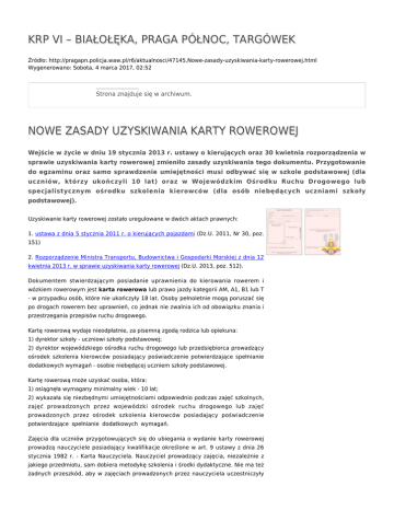 KRP VI – BIAŁOŁĘKA, PRAGA PÓŁNOC, TARGÓWEK Źródło: http://pragapn.policja.waw.pl/r6/aktualnosci/47145,Nowe-zasady-uzyskiwania-karty-rowerowej.html Wygenerowano: Sobota, 4 marca 2017, 02:52 Strona znajduje się w archiwum. NOWE ZASADY UZYSKIWANIA KARTY ROWEROWEJ Wejście w życie w dniu 19 stycznia 2013 r. ustawy o kierujących oraz 30 kwietnia rozporządzenia w sprawie uzyskiwania karty rowerowej zmieniło zasady uzyskiwania tego dokumentu. Przygotowanie do egzaminu oraz samo sprawdzenie umiejętności musi odbywać się w szkole podstawowej (dla uczniów, którzy ukończyli 10 lat) oraz w Wojewódzkim Ośrodku Ruchu Drogowego lub specjalistycznym ośrodku szkolenia kierowców (dla osób niebędących uczniami szkoły podstawowej). Uzyskiwanie karty rowerowej zostało uregulowane w dwóch aktach prawnych: 1. ustawa z dnia 5 stycznia 2011 r. o kierujących pojazdami (Dz.U. 2011, Nr 30, poz. 151) 2. Rozporządzenie Ministra Transportu, Budownictwa i Gospodarki Morskiej z dnia 12 kwietnia 2013 r. w sprawie uzyskiwania karty rowerowej (Dz.U. 2013, poz. 512). Dokumentem stwierdzającym posiadanie uprawnienia do kierowania rowerem i wózkiem rowerowym jest karta rowerowa lub prawo jazdy kategorii AM, A1, B1 lub T - w przypadku osób, które nie ukończyły 18 lat. Osoby pełnoletnie mogą poruszać się po drogach rowerem bez uprawnień, co jednak nie zwalnia ich od obowiązku znania i przestrzegania przepisów ruchu drogowego. Kartę rowerową wydaje nieodpłatnie, za pisemną zgodą rodzica lub opiekuna: 1) dyrektor szkoły - uczniowi szkoły podstawowej; 2) dyrektor wojewódzkiego ośrodka ruchu drogowego lub przedsiębiorca prowadzący ośrodek szkolenia kierowców posiadający poświadczenie potwierdzające spełnianie dodatkowych wymagań - osobie niebędącej uczniem szkoły podstawowej. Kartę rowerową może uzyskać osoba, która: 1) osiągnęła wymagany minimalny wiek - 10 lat; 2) wykazała się niezbędnymi umiejętnościami odpowiednio podczas zajęć szkolnych, zajęć prowadzonych przez wojewódzki ośrodek ruchu drogowego lub zajęć prowadzonych przez ośrodek szkolenia kierowców posiadający poświadczenie potwierdzające spełnianie dodatkowych wymagań. Zajęcia dla uczniów przygotowujących się do ubiegania o wydanie karty rowerowej prowadzą nauczyciele posiadający kwalifikacje określone w art. 9 ustawy z dnia 26 stycznia 1982 r. - Karta Nauczyciela. Nauczyciel prowadzący zajęcia, niezależnie z jakiego przedmiotu, sam dobiera metodykę szkolenia i środki dydaktyczne. Nie ma też żadnych przeszkód, aby w zajęciach prowadzonych przez nauczyciela uczestniczyły również inne osoby, które (z racji swojej wiedzy, funkcji, doświadczenia etc.) mogą wspomóc proces dydaktyczny. A więc w zajęciach przygotowujących uczniów do uzyskania karty rowerowej mogą uczestniczyć również policjanci mający odpowiednią wiedzę i potrafiący ją wykorzystać w kontaktach z dziećmi. Nie może to mieć jednak charakteru wyręczania nauczyciela w prowadzeniu zajęć. Zajęcia mogą być również prowadzone w wojewódzkim ośrodku ruchu drogowego lub ośrodku szkolenia kierowców posiadającym spełnienie dodatkowych wymagań, o ile dyrektor szkoły zawarł porozumienie z danym ośrodkiem o nieodpłatnym uczestnictwie uczniów w zajęciach organizowanych przez ten ośrodek. Zajęcia dla osób ubiegających się o wydanie karty rowerowej, a nie będących uczniami szkoły podstawowej, są prowadzone w wojewódzkim ośrodku ruchu drogowego lub w ośrodku szkolenia kierowców posiadającym poświadczenie potwierdzające spełnienie dodatkowych wymagań. Sprawdzenia niezbędnych umiejętności osoby ubiegającej się o kartę rowerową dokonuje: 1) nauczyciel posiadający specjalistyczne przeszkolenie z zakresu ruchu drogowego organizowane nieodpłatnie w wojewódzkim ośrodku ruchu drogowego; 2) policjant lub policjant w stanie spoczynku, posiadający specjalistyczne przeszkolenie z zakresu ruchu drogowego; 3) egzaminator; 4) instruktor. Sprawdzenie tych umiejętności odbywa się w jednostce prowadzącej zajęcia w obecności nauczyciela, rodzica lub opiekuna. Egzamin na kartę rowerową składa się z dwóch części: 1. teoretycznej; 2. praktycznej. Egzamin teoretyczny dla uczniów szkół podstawowych uznaje się za pozytywny, jeżeli osoba zdająca uzyskała co najmniej 80% punktów możliwych do uzyskania. Dopiero po zaliczeniu części teoretycznej można przystąpić do części praktycznej egzaminu, który dla uczniów szkół podstawowych przeprowadzany jest w miejscu wyznaczonym przez dyrektora szkoły, umożliwiającym sprawdzenie niezbędnych umiejętności praktycznych. Wynik części praktycznej będzie uznany za pozytywny, jeżeli osoba zdająca prawidłowo wykonała co najmniej 90% manewrów i nie stwarza zagrożenia dla ruchu drogowego. Policjanci Sekcji Profilaktyki Społecznej Wydziału Ruchu Drogowego Komendy Stołecznej Policji wspomagają dyrektorów szkół podstawowych w przygotowaniu dzieci do egzaminu na kartę rowerową i przeprowadzeniu takiego egzaminu. W celu podjęcia współpracy należy zwrócić się pisemnie do Naczelnika Wydziału Ruchu Drogowego Komendy Stołecznej Policji podinsp. Krzysztofa Bujnowskiego z podaniem liczby dzieci przewidzianych do egzaminowania oraz telefonem kontaktowym w celu umówienia terminów spotkań. Każde dziecko przystępujące do egzaminu musi mieć przy sobie legitymację szkolną oraz wypełniony "ARKUSZ ZALICZEŃ UCZNIA UBIEGAJĄCEGO SIĘ O KARTĘ ROWEROWĄ". Jest to druk MEN-VI/28, który powinien być dostępny w szkole. Można go również pobrać http://wrd.policja.waw.pl/download.php?s=20&id=84553. Po uzyskaniu pozytywnego egzaminu wydawana jest karta rowerowa. klikając tu: ms/WRD KSP Ocena: 0/5 (0) Tweetnij