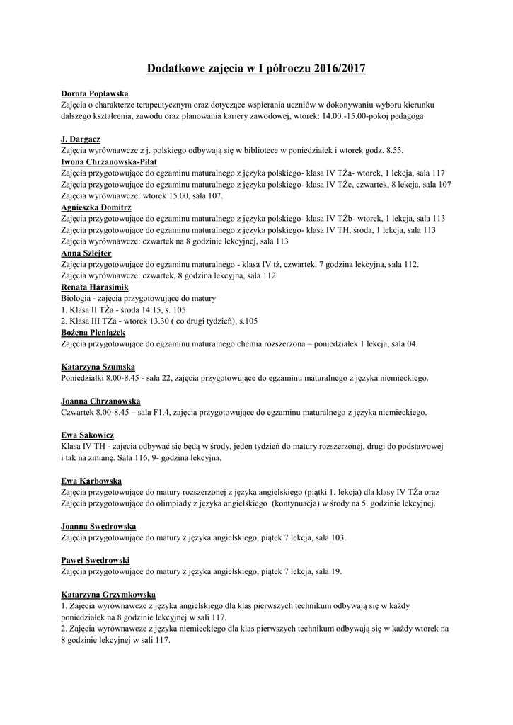 Dodatkowe zajęcia w I półroczu 2016/2017 Dorota Popławska Zajęcia o charakterze terapeutycznym oraz dotyczące wspierania uczniów w dokonywaniu wyboru kierunku dalszego kształcenia, zawodu oraz planowania kariery zawodowej, wtorek: 14.00.-15.00-pokój pedagoga J. Dargacz Zajęcia wyrównawcze z j. polskiego odbywają się w bibliotece w poniedziałek i wtorek godz. 8.55. Iwona Chrzanowska-Piłat Zajęcia przygotowujące do egzaminu maturalnego z języka polskiego- klasa IV TŻa- wtorek, 1 lekcja, sala 117 Zajęcia przygotowujące do egzaminu maturalnego z języka polskiego- klasa IV TŻc, czwartek, 8 lekcja, sala 107 Zajęcia wyrównawcze: wtorek 15.00, sala 107. Agnieszka Domitrz Zajęcia przygotowujące do egzaminu maturalnego z języka polskiego- klasa IV TŻb- wtorek, 1 lekcja, sala 113 Zajęcia przygotowujące do egzaminu maturalnego z języka polskiego- klasa IV TH, środa, 1 lekcja, sala 113 Zajęcia wyrównawcze: czwartek na 8 godzinie lekcyjnej, sala 113 Anna Szlejter Zajęcia przygotowujące do egzaminu maturalnego - klasa IV tż, czwartek, 7 godzina lekcyjna, sala 112. Zajęcia wyrównawcze: czwartek, 8 godzina lekcyjna, sala 112. Renata Harasimik Biologia - zajęcia przygotowujące do matury 1. Klasa II TŻa - środa 14.15, s. 105 2. Klasa III TŻa - wtorek 13.30 ( co drugi tydzień), s.105 Bożena Pieniążek Zajęcia przygotowujące do egzaminu maturalnego chemia rozszerzona – poniedziałek 1 lekcja, sala 04. Katarzyna Szumska Poniedziałki 8.00-8.45 - sala 22, zajęcia przygotowujące do egzaminu maturalnego z języka niemieckiego. Joanna Chrzanowska Czwartek 8.00-8.45 – sala F1.4, zajęcia przygotowujące do egzaminu maturalnego z języka niemieckiego. Ewa Sakowicz Klasa IV TH - zajęcia odbywać się będą w środy, jeden tydzień do matury rozszerzonej, drugi do podstawowej i tak na zmianę. Sala 116, 9- godzina lekcyjna. Ewa Karbowska Zajęcia przygotowujące do matury rozszerzonej z języka angielskiego (piątki 1. lekcja) dla klasy IV TŻa oraz Zajęcia przygotowujące do olimpiady z języka angielskiego (kontynuacja) w środy na 5. godzinie lekcyjnej. Joanna Swędrowska Zajęcia przygotowujące do matury z języka angielskiego, piątek 7 lekcja, sala 103. Paweł Swędrowski Zajęcia przygotowujące do matury z języka angielskiego, piątek 7 lekcja, sala 19. Katarzyna Grzymkowska 1. Zajęcia wyrównawcze z języka angielskiego dla klas pierwszych technikum odbywają się w każdy poniedziałek na 8 godzinie lekcyjnej w sali 117. 2. Zajęcia wyrównawcze z języka niemieckiego dla klas pierwszych technikum odbywają się w każdy wtorek na 8 godzinie lekcyjnej w sali 117. Agnieszka Rybałko Zajęcia przygotowujące do matury z matematyki (IVTŻb,c), poniedziałek 8 lekcja, sala 111. Lilianna Malinowska Zajęcia przygotowujące do matury z matematyki (IVTH,TŻ), piątek 7 lekcja, sala 114. Arkadiusz Bobrowski Zajęcia wyrównawcze z matematyki, poniedziałek od 15.40, sala 114: Bogumiła Przyborowska Zajęcia przygotowujące do matury z matematyki (IVTH,TŻ), piątek 7 lekcja, sala 114 Zajęcia wyrównawcze: Klasy I: wtorek, godz. 15.00, sala 21 Klasy II,III czwartek, godz. 15.00, sala F1.11 Justyna Radaszewska Zajęcia dodatkowe dla kl. IVTH z geografii rozszerzonej we wtorki o godzinie 8.00 w sali 14. Beata Dębska Zajęcia uzupełniające z przedmiotów hotelarskich i PP dla chętnych, oraz dla osób, które nie zdały kwalifikacji T.12. Będą odbywały się według potrzeby uczniów we wtorek o 14.10 w pracowni E2.8 Elżbieta Kurzynowska Zajęcia dodatkowe czwartek godz. 14.10 w sali E.2.17. Program zajęć jest przeznaczony dla uczniów klas II IV, Technikum Hotelarstwa chcących lepiej przygotować się do zewnętrznego egzaminu zawodowego potwierdzającego kwalifikacje zawodowe oraz dla oraz uczniów przystępujących do OWH i chcących poszerzyć wiedzę w zakresie ekonomii i hotelarstwa oraz uczniów mających problemy z opanowaniem podstawy programowej w zakresie nauczanych przedmiotów. Urszula Miklosz Młodzieżowe Miniprzedsiębiorstwo – kontakt z nauczycielem E 2.7 Dorota Kozłowska Profesjonalna obsługa kelnerska (klasy III kelner), spotkania będą odbywały się raz w tygodniu po jednej godzinie lekcyjnej lub co dwa tygodnie po dwie godziny lekcyjne (w czwartki na 8 lekcji lub na 8 i 9). Elżbieta Mazurek ZAJĘCIA ROZWIJAJĄCE WIEDZĘ I UMIEJĘTNOŚCI ZAWODOWE GASTRONOMICZNE UCZNIÓW: - Przygotowanie imprez okolicznościowych zgodnie z potrzebami, - współorganizacja konkursów kulinarnych , pomoc w przygotowaniu uczniów do OWiUR, - zajęcia uzupełniające wiedzę dla uczniów. Barbara Zielińska Przygotowanie, organizacja i obsługa kelnerska przyjęć okolicznościowych. Liczba osób; około 10, Klasa 2tża Liczba godzin i czas realizacji: w zależności od potrzeb. Renata Bielecka Miejsce spotkań : pracownia hotelarska E2.8 Czas trwania zajęć: 2 godziny 2 razy w miesiącu w czwartki (13,30-15,00) Pierwsze zajęcia 29.09.2016r. Spotkania indywidualne w zależności od potrzeb. Zajęcia kierowane są do klasy III, I, IV TH. Elwira Frydrych Zajęcia przygotowujące do egzaminu z kwalifikacji T.15 w kl IVTŻ (pierwsza i trzecia sobota miesiąca w wymiarze 4 godzin, Wolontariat -2godz/tydzień Anna Czyż Program zajęć dodatkowych 1. Przygotowanie i obsługa imprez organizowanych przy współudziale i na terenie Szkoły 2. " Przysmaki kuchni regionalnych" - zajęcia rozwijające zainteresowania uczniów kuchniami innych rejonów Polski Miejsce realizacji - pracownie gastronomiczne ZS nr 6 Adresat: chętni uczniowie kl. IIZc, IIITżb Zajęcia prowadzone będą: 1. Udział i forma aktywności uczniów w zależności od potrzeb 2. Raz w miesiącu - 4godz. Urszula Walas PROGRAM zajęć pozalekcyjnych na temat: Współorganizacja imprez, uroczystości i konkursów od strony gastronomicznej w Zespole Szkół Nr 6 oraz prowadzenie zajęć z młodzieżą mającą problemy z nauką zawodu w pracowni gastronomicznej. Miejsce realizacji - Ze