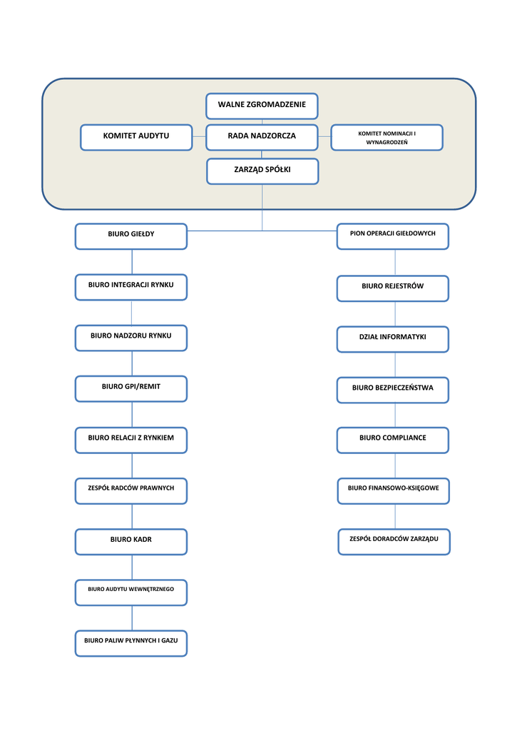 WALNE ZGROMADZENIE KOMITET AUDYTU RADA NADZORCZA KOMITET NOMINACJI I WYNAGRODZEŃ ZARZĄD SPÓŁKI BIURO GIEŁDY PION OPERACJI GIEŁDOWYCH BIURO INTEGRACJI RYNKU BIURO REJESTRÓW BIURO NADZORU RYNKU DZIAŁ INFORMATYKI BIURO GPI/REMIT BIURO BEZPIECZEŃSTWA BIURO RELACJI Z RYNKIEM BIURO COMPLIANCE ZESPÓŁ RADCÓW PRAWNYCH BIURO FINANSOWO-KSIĘGOWE BIURO KADR ZESPÓŁ DORADCÓW ZARZĄDU BIURO AUDYTU WEWNĘTRZNEGO BIURO PALIW PŁYNNYCH I GAZU