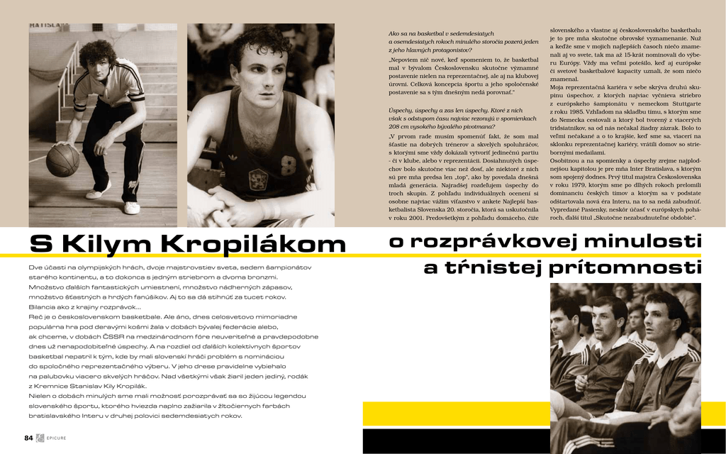 Ako sa na basketbal v sedemdesiatych a osemdesiatych rokoch minulého storočia pozerá jeden z jeho hlavných protagonistov? „Nepoviem nič nové, keď spomeniem to, že basketbal mal v bývalom Československu skutočne významné postavenie nielen na reprezentačnej, ale aj na klubovej úrovni. Celková koncepcia športu a jeho spoločenské postavenie sa s tým dnešným nedá porovnať.“ Úspechy, úspechy a zas len úspechy. Ktoré z nich však s odstupom času najviac rezonujú v spomienkach 208 cm vysokého bývalého pivotmana? „V prvom rade musím spomenúť fakt, že som mal šťastie na dobrých trénerov a skvelých spoluhráčov, s ktorými sme vždy dokázali vytvoriť jedinečnú partiu - či v klube, alebo v reprezentácii. Dosiahnutých úspechov bolo skutočne viac než dosť, ale niektoré z nich sú pre mňa predsa len „top“, ako by povedala dnešná mladá generácia. Najradšej rozdeľujem úspechy do troch skupín. Z pohľadu individuálnych ocenení si osobne najviac vážim víťazstvo v ankete Najlepší basketbalista Slovenska 20. storočia, ktorá sa uskutočnila v roku 2001. Predovšetkým z pohľadu domáceho, čiže S Kilym Kropilákom Dve účasti na olympijských hrách, dvoje majstrovstiev sveta, sedem šampionátov starého kontinentu, a to dokonca s jedným striebrom a dvoma bronzmi. slovenského a vlastne aj československého basketbalu je to pre mňa skutočne obrovské vyznamenanie. Nuž a keďže sme v mojich najlepších časoch niečo znamenali aj vo svete, tak ma až 15-krát nominovali do výberu Európy. Vždy ma veľmi potešilo, keď aj európske či svetové basketbalové kapacity uznali, že som niečo znamenal. Moja reprezentačná kariéra v sebe skrýva druhú skupinu úspechov, z ktorých najviac vyčnieva striebro z európskeho šampionátu v nemeckom Stuttgarte z roku 1985. Vzhľadom na skladbu tímu, s ktorým sme do Nemecka cestovali a ktorý bol tvorený z viacerých tridsiatnikov, sa od nás nečakal žiadny zázrak. Bolo to veľmi nečakané a o to krajšie, keď sme sa, viacerí na sklonku reprezentačnej kariéry, vrátili domov so striebornými medailami. Osobitnou a na spomienky a úspechy zrejme najplodnejšou kapitolou je pre mňa Inter Bratislava, s ktorým som spojený dodnes. Prvý titul majstra Československa v roku 1979, ktorým sme po dlhých rokoch prelomili dominanciu českých tímov a ktorým sa v podstate odštartovala nová éra Interu, na to sa nedá zabudnúť. Vypredané Pasienky, neskôr účasť v európskych pohároch, ďalší titul „Skutočne nezabudnuteľné obdobie“. o rozprávkovej minulosti a tŕnistej prítomnosti Množstvo ďalších fantastických umiestnení, množstvo nádherných zápasov, množstvo šťastných a hrdých fanúšikov. Aj to sa dá stihnúť za tucet rokov. Bilancia ako z krajiny rozprávok... Reč je o československom basketbale. Ale áno, dnes celosvetovo mimoriadne populárna hra pod deravými košmi žala v dobách bývalej federácie alebo, ak chceme, v dobách ČSSR na medzinárodnom fóre neuveriteľné a pravdepodobne dnes už nenapodobiteľné úspechy. A na rozdiel od ďalších kolektívnych športov basketbal nepatril k tým, kde by mali slovenskí hráči problém s nomináciou do spoločného reprezentačného výberu. V jeho drese pravidelne vybiehalo na palubovku viacero skvelých hráčov. Nad všetkými však žiaril jeden jediný, rodák z Kremnice Stanislav Kily Kropilák. Nielen o dobách minulých sme mali možnosť porozprávať sa so žijúcou legendou slovenského športu, ktorého hviezda naplno zažiarila v žltočiernych farbách bratislavského Interu v druhej polovici sedemdesiatych rokov. 84 EPICURE EPICURE 85 Hneď v úvode si spomenul šťastie na skvelých spoluhráčov. „Zoznam mojich bývalých spoluhráčov, skvelých basketbalistov a výborných priateľov, je naozaj veľmi dlhý. Za všetkých musím na prvom mieste spomenúť už nebohého Petra Rajniaka, ktorý nás opustil pred dvanástimi rokmi. S „Pedrom“ som začínal v Slávii SVŠT Bratislava, neskôr sme spolu hrávali v Interi, dlhé roky v reprezentácii a v podstate sme spolu končili kariéru v Luxembursku, kde som ja hrával a on trénoval.“ 86 EPICURE „Oficiálne som skončil až vo veku 41 rokov, čo je naozaj dosť. Basketbal ma naozaj veľmi bavil a darilo sa mi aj v pokročilejšom štádiu kariéry. Táto dlhoročná vášeň si však vybrala svoju daň a dlhej a úspešnej hráčskej kariére vďačím za zničené zdravie. Predovšetkým problémy s kĺbmi ma prenasledujú dodnes. Len nedávno som podstúpil operačný zákrok, počas ktorého mi vymenili kolenný kĺb. Ďalšia operácia ma možno čaká už v neďalekej budúcnosti.“ Po návrate na Slovensko v roku 1996 si sa samozrejme vrátil do Bratislavy. Krátko si ešte hral, neskôr trénoval, stal si sa manažérom „svojho“ Interu a od roku 2000 si jeho prezidentom. Čo so sebou prináša prezidentovanie v dnešnom basketbalovom klube? „Okrem nášho seniorského družstva, ktoré má verejnosť na očiach, sa snažíme udržiavať kompletnú mládežnícku pyramídu. Práve mládež a práca s ňou je najväčším kameňom úrazu súčasného slovenského basketbalu. Príliš úzka základňa, nedostatok hráčov, absencia vzorov, kvalita trénerov a v neposlednom rade nie najlepšie vzťahy škodia nášmu basketbalu a škodia hlavne tým, ktorí sa v ňom aj napriek mnohým prekážkam vidia. Nájdu sa však aj svetlé miesta, ktoré pomáhajú ozdravovať celkovo nedobrú klímu. Dva zápasy v úvode sezóny odohral v žltočiernom drese Interu Radoslav Rančík, trojnásobný najlepší hráč Slovenska, ktorý má za sebou úspešné sezóny vo Francúzsku, Česku, Taliansku, Francúzsku a na Ukrajine. V rovnakej situácii sa možno zakrátko ocitne aj starší z bratov Rančíkovcov Martin. Ten by si vo veku 34 rokov ako jeden z najlepších slovenských basketbali