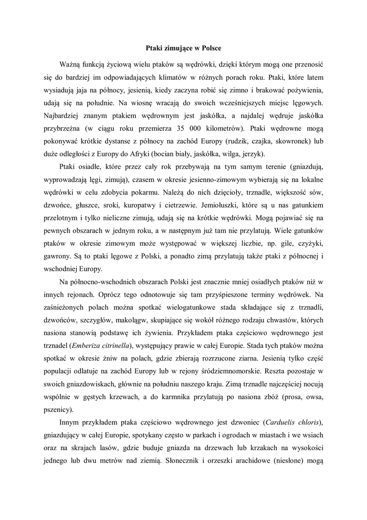 Ptaki zimujące w Polsce Ważną funkcją życiową wielu ptaków są wędrówki, dzięki którym mogą one przenosić się do bardziej im odpowiadających klimatów w różnych porach roku. Ptaki, które latem wysiadują jaja na północy, jesienią, kiedy zaczyna robić się zimno i brakować pożywienia, udają się na południe. Na wiosnę wracają do swoich wcześniejszych miejsc lęgowych. Najbardziej znanym ptakiem wędrownym jest jaskółka, a najdalej wędruje jaskółka przybrzeżna (w ciągu roku przemierza 35 000 kilometrów). Ptaki wędrowne mogą pokonywać krótkie dystanse z północy na zachód Europy (rudzik, czajka, skowronek) lub duże odległości z Europy do Afryki (bocian biały, jaskółka, wilga, jerzyk). Ptaki osiadłe, które przez cały rok przebywają na tym samym terenie (gniazdują, wyprowadzają lęgi, zimują), czasem w okresie jesienno-zimowym wybierają się na lokalne wędrówki w celu zdobycia pokarmu. Należą do nich dzięcioły, trznadle, większość sów, dzwońce, głuszce, sroki, kuropatwy i cietrzewie. Jemiołuszki, które są u nas gatunkiem przelotnym i tylko nieliczne zimują, udają się na krótkie wędrówki. Mogą pojawiać się na pewnych obszarach w jednym roku, a w następnym już tam nie przylatują. Wiele gatunków ptaków w okresie zimowym może występować w większej liczbie, np. gile, czyżyki, gawrony. Są to ptaki lęgowe z Polski, a ponadto zimą przylatują także ptaki z północnej i wschodniej Europy. Na północno-wschodnich obszarach Polski jest znacznie mniej osiadłych ptaków niż w innych rejonach. Oprócz tego odnotowuje się tam przyśpieszone terminy wędrówek. Na zaśnieżonych polach można spotkać wielogatunkowe stada składające się z trznadli, dzwońców, szczygłów, makolągw, skupiające się wokół różnego rodzaju chwastów, których nasiona stanowią podstawę ich żywienia. Przykładem ptaka częściowo wędrownego jest trznadel (Emberiza citrinella), występujący prawie w całej Europie. Stada tych ptaków można spotkać w okresie żniw na polach, gdzie zbierają rozrzucone ziarna. Jesienią tylko część populacji odlatuje na zachód Europy lub w rejony śródziemnomorskie. Reszta pozostaje w swoich gniazdowiskach, głównie na południu naszego kraju. Zimą trznadle najczęściej nocują wspólnie w gęstych krzewach, a do karmnika przylatują po nasiona zbóż (prosa, owsa, pszenicy). Innym przykładem ptaka częściowo wędrownego jest dzwoniec (Carduelis chloris), gniazdujący w całej Europie, spotykany często w parkach i ogrodach w miastach i we wsiach oraz na skrajach lasów, gdzie buduje gniazda na drzewach lub krzakach na wysokości jednego lub dwu metrów nad ziemią. Słonecznik i orzeszki arachidowe (niesłone) mogą zwabić dzwońca do karmnika. Dzwońce zachowują się w karmniku dość agresywnie i odganiają wróble oraz sikorki. Tylko stada z rejonów północnych i północno-wschodnich przenoszą się na zimę do Europy środkowej i południowej. Jesienią i zimą w parkach miejskich i na opuszczonych parcelach można spotkać szczygła (Carduelis carduelis) wydziobującego nasiona z chwastów. Ulubionym przysmakiem tego ptaka są nasiona łopianu i ostów. Dzięki długiemu spiczastemu dziobowi, przypominającemu pęsetę, ma on dostęp do nasion, których nie mogą wydziobać inne ptaki. Część szczygłów odlatuje na zimę do zachodniej Europy, gdzie panuje łagodniejszy klimat. Te, które zostają, chętnie przylatują do karmników z wyłożoną mieszanką mniejszych nasion. Kwiczoł (Turdus pilaris) to ptak również częściowo wędrowny (w Europie Środkowej). Gniazduje w koloniach, ale nie buduje gniazd blisko siebie. Na terenie Polski można go spotkać częściej w porze wędrówek (głównie we wrześniu i październiku) niż w okresie lęgowym. Całe stada tych ptaków przylatują do nas jesienią ze Skandynawii. Zimą kwiczoły często łączą się w grupy z droździkami i z głośnym krzykiem żerują na polach i łąkach. Spotkać je można na krzewach jarzębiny, głogu i dzikiej róży. Kiedy brakuje owoców, przenoszą się do ogrodów i parków, gdzie jest cieplej i można znaleźć pożywienie w karmniku. W okresie zimowym można zobaczyć w niektórych regionach Polski jemiołuszki (Bombycilla garrulus). Jest to gatunek przelotny. Europejskie populacje wędrują w kierunku południowo-zachodnim (do Francji i na Bałkany), gdy jednak znajdą wystarczającą ilość pokarmu, zatrzymują się na dłużej. W trakcie wędrówek jemiołuszki zjadają w dużych ilościach jagody głogu, tarniny, jemioły, dzikiej róży, cisu, jarzębiny i jałowca. W Polsce są objęte ścisłą ochroną. Częstym bywalcem karmników jest rozpowszechniona w całym naszym kraju sikorka bogatka (Parus major), należąca do gatunków osiadłych. W lecie żyje w lasach i parkach, a zimą przylatuje w pobliże siedzib ludzkich. Żywi się głównie owadami (motylami we wszystkich stadiach rozwoju, chrząszczami) oraz nasionami roślin oleistych. Można ją spotkać w małych stadach, składających się z innych gatunków sikor, raniuszków i pełzaczy. Stałe dokarmianie sprawia, że często zamieszkuje ogrody. W temperaturze powyżej zera większość ptaków nie ma problemów ze znalezieniem pożywienia. Jedynie sierpówki, wróble i miejskie gołębie muszą liczyć na pokarm podawany przez ludzi. W ostatnich latach człowiek wywierając wpływ na środowisko, znacznie ograniczył bazę pokarmową dla wielu zwierząt. Dokarmiając ptaki, można złagodzić skutki niekorzystnych zmian w przyrodzie. autor tekstu: dr nauk biologicznych Maria Turoń źródło zdjęcia: <a href = "http://www.fotoptak.vot.pl">Zdjęcia ptaków- Puszczy Niepołomickiej</a>