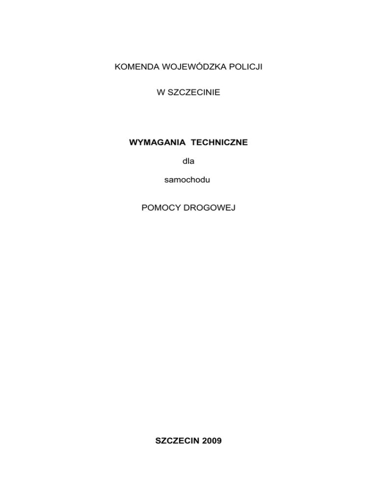 KOMENDA WOJEWÓDZKA POLICJI W SZCZECINIE WYMAGANIA TECHNICZNE dla samochodu POMOCY DROGOWEJ SZCZECIN 2009 I. WYMAGANIA OGÓLNE. 1.Przedmiot opracowania. Przedmiotem opracowania są wymagania techniczne pojazdu pomocy drogowej wyposażonego w platformę do przewozu pojazdów o DMC do 3,0 ton. 2.Kryptonim pojazdu. Przyjmuje się robocze oznaczenie pojazdu „Laweta” 3.Przeznaczenie pojazdu Laweta. Laweta przeznaczona będzie do transportu: - pojazdów samochodowych, przyczep, łodzi na przyczepach podłodziowych lub na stojakach magazynowych o DMC do 3,0 ton, - ciągnięcia za tym pojazdem przyczepy o DMC do 3,0 ton z zaczepem kulowym, - motocykli. 4.Warunki eksploatacji pojazdu Laweta. Laweta będzie: - użytkowana we wszystkich porach roku i doby w warunkach klimatycznych spotykanych w polskiej strefie klimatycznej, - jeździć po drogach twardych, gruntowych zarówno na długich trasach, jak i na krótkich odcinkach (np. na obszarze miasta) oraz po utwardzonych nabrzeżach akwenów wodnych, - garażowana głównie na wolnym powietrzu, - naprawiana w resortowych stacjach obsługi pojazdów lub w ASO dostawcy; (producenta podwozia lub zabudowy). 5.Wymagania formalne. 1) Pojazd musi spełniać wymagania określone w Rozporządzeniu Ministrów Spraw Wewnętrznych i Administracji, Obrony Narodowej, Finansów oraz Sprawiedliwości z dnia 24 listopada 2004 r. w sprawie warunków technicznych pojazdów specjalnych i pojazdów używanych do celów specjalnych Policji, Agencji Bezpieczeństwa Wewnętrznego, Agencji Wywiadu, Straży Granicznej, Kontroli Skarbowej, Służby Celnej, Służby Więziennej i Straży Pożarnej (Dz. U. z 2004 r., Nr 262, poz. 2615). 2) Pojazd musi spełniać wymagania określone w Rozporządzeniu Ministra Infrastruktury z dnia 31.12.2002 r. w sprawie warunków technicznych pojazdów oraz zakresu ich niezbędnego wyposażenia (Dz. U. z 2003r., Nr 32, poz.. 262 ze zmianami). 3) Pojazd bazowy, na którym zostanie dokonana zabudowa musi posiadać świadectwo homologacji wystawione zgodnie z art. 68 Ustawy z dnia 20 czerwca 1997 Prawo o ruchu drogowym (Dz. U. z 2005 Nr 108, poz.908. ze zm.). 4) Laweta musi posiadać zaświadczenia wystawione przez stację kontroli pojazdów upoważnioną do przeprowadzania badań technicznych pojazdów w zakresie zmian jego dopuszczalnej ładowności, dopuszczalnej masy całkowitej, liczby miejsc i montażu haka holowniczego oraz o przeprowadzeniu badań technicznych przed dopuszczeniem do ruchu pojazdu specjalnego zgodnie z ustawą o ruchu drogowym. 5) Zmiany adaptacyjne pojazdu, dotyczące montażu policyjnego wyposażenia specjalnego dokonane przez Zamawiającego w trakcie jego eksploatacji nie mogą powodować utraty ani ograniczenia uprawnień wynikających z fabrycznej gwarancji producenta samochodu bazowego. Stosowny zapis w tej kwestii musi znaleźć się w książce gwarancyjnej pojazdu i musi być respektowany przez wszystkie ASO oferowanej marki pojazdu na terenie całego kraju. 6) Wykonawca lub jego lokalny przedstawiciel zobowiązuje się do udzielania bezpłatnych konsultacji technicznych w zakresie możliwości zabudowania oraz zaleceń dotyczących montażu w pojeździe: a.instalacji antenowych, b.instalacji zasilania urządzeń łączności radiowej, c.innego sprzętu służbowego. 7) Pojazd musi być wolny od wad fizycznych i prawnych oraz spełniać warunki, o których mowa w ustawie Prawo o ruchu drogowym i przepisach wykonawczych wydanych na podstawie tej ustawy. 6. Dodatkowe wyposażenie pojazdu Laweta. 1) Przyczepa do przewozu pojazdów o dopuszczalnej masie całkowitej do 2.500 kg 2) Przyczepa musi posiadać świadectwo homologacji wystawione zgodnie z art. 68 Ustawy z dnia 20 czerwca 1997 Prawo o ruchu drogowym (Dz. U. z 2005 Nr 108, poz.908. ze zm.). 3) Przyczepa musi być wolna od wad fizycznych i prawnych oraz spełniać warunki, o których mowa w ustawie Prawo o ruchu drogowym i przepisach wykonawczych wydanych na podstawie tej ustawy.