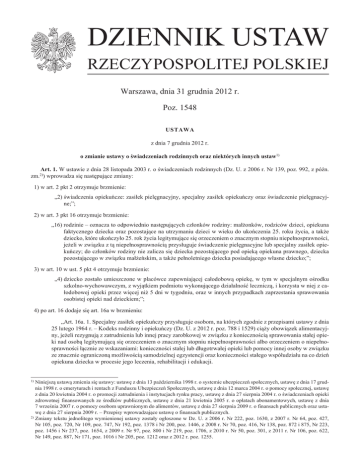 DZIENNIK USTAW RZECZYPOSPOLITEJ POLSKIEJ Warszawa, dnia 31 grudnia 2012 r. Poz. 1548 USTAWA z dnia 7 grudnia 2012 r. o zmianie ustawy o świadczeniach rodzinnych oraz niektórych innych ustaw1) Art. 1. W ustawie z dnia 28 listopada 2003 r. o świadczeniach rodzinnych (Dz. U. z 2006 r. Nr 139, poz. 992, z późn. zm.2)) wprowadza się następujące zmiany: 1) w art. 2 pkt 2 otrzymuje brzmienie: „2) świadczenia opiekuńcze: zasiłek pielęgnacyjny, specjalny zasiłek opiekuńczy oraz świadczenie pielęgnacyjne;”; 2) w art. 3 pkt 16 otrzymuje brzmienie: „16) rodzinie – oznacza to odpowiednio następujących członków rodziny: małżonków, rodziców dzieci, opiekuna faktycznego dziecka oraz pozostające na utrzymaniu dzieci w wieku do ukończenia 25. roku życia, a także dziecko, które ukończyło 25. rok życia legitymujące się orzeczeniem o znacznym stopniu niepełnosprawności, jeżeli w związku z tą niepełnosprawnością przysługuje świadczenie pielęgnacyjne lub specjalny zasiłek opiekuńczy; do członków rodziny nie zalicza się dziecka pozostającego pod opieką opiekuna prawnego, dziecka pozostającego w związku małżeńskim, a także pełnoletniego dziecka posiadającego własne dziecko;”; 3) w art. 10 w ust. 5 pkt 4 otrzymuje brzmienie: „4) dziecko zostało umieszczone w placówce zapewniającej całodobową opiekę, w tym w specjalnym ośrodku szkolno-wychowawczym, z wyjątkiem podmiotu wykonującego działalność leczniczą, i korzysta w niej z całodobowej opieki przez więcej niż 5 dni w tygodniu, oraz w innych przypadkach zaprzestania sprawowania osobistej opieki nad dzieckiem;”; 4) po art. 16 dodaje się art. 16a w brzmieniu: „Art. 16a. 1. Specjalny zasiłek opiekuńczy przysługuje osobom, na których zgodnie z przepisami ustawy z dnia 25 lutego 1964 r. – Kodeks rodzinny i opiekuńczy (Dz. U. z 2012 r. poz. 788 i 1529) ciąży obowiązek alimentacyjny, jeżeli rezygnują z zatrudnienia lub innej pracy zarobkowej w związku z koniecznością sprawowania stałej opieki nad osobą legitymującą się orzeczeniem o znacznym stopniu niepełnosprawności albo orzeczeniem o niepełno sprawności łącznie ze wskazaniami: konieczności stałej lub długotrwałej opieki lub pomocy innej osoby w związku ze znacznie ograniczoną możliwością samodzielnej egzystencji oraz konieczności stałego współudziału na co dzień opiekuna dziecka w procesie jego leczenia, rehabilitacji i edukacji. Niniejszą ustawą zmienia się ustawy: ustawę z dnia 13 października 1998 r. o systemie ubezpieczeń społecznych, ustawę z dnia 17 grudnia 1998 r. o emeryturach i rentach z Funduszu Ubezpieczeń Społecznych, ustawę z dnia 12 marca 2004 r. o pomocy społecznej, ustawę z dnia 20 kwietnia 2004 r. o promocji zatrudnienia i instytucjach rynku pracy, ustawę z dnia 27 sierpnia 2004 r. o świadczeniach opieki zdrowotnej finansowanych ze środków publicznych, ustawę z dnia 21 kwietnia 2005 r. o opłatach abonamentowych, ustawę z dnia 7 września 2007 r. o pomocy osobom uprawnionym do alimentów, ustawę z dnia 27 sierpnia 2009 r. o finansach publicznych oraz ustawę z dnia 27 sierpnia 2009 r. – Przepisy wprowadzające ustawę o finansach publicznych. 2) Zmiany tekstu jednolitego wymienionej ustawy zostały ogłoszone w Dz. U. z 2006 r. Nr 222, poz. 1630, z 2007 r. Nr 64, poz. 427, Nr 105, poz. 720, Nr 109, poz. 747, Nr 192, poz. 1378 i Nr 200, poz. 1446, z 2008 r. Nr 70, poz. 416, Nr 138, poz. 872 i 875, Nr 223, poz. 1456 i Nr 237, poz. 1654, z 2009 r. Nr 97, poz. 800 i Nr 219, poz. 1706, z 2010 r. Nr 50, poz. 301, z 2011 r. Nr 106, poz. 622, Nr 149, poz. 887, Nr 171, poz. 1016 i Nr 205, poz. 1212 oraz z 2012 r. poz. 1255. 1) Dziennik Ustaw – 2 – Poz. 1548 2. Specjalny zasiłek opiekuńczy przysługuje, jeżeli łączny dochód rodziny osoby sprawującej opiekę oraz rodziny osoby wymagającej opieki w przeliczeniu na osobę nie przekracza kwoty, o której mowa w art. 5 ust. 2. Przepisy art. 5 ust. 4–9 stosuje się odpowiednio. 3. W przypadku gdy łączny dochód rodziny osoby sprawującej opiekę oraz rodziny osoby wymagającej opieki w przeliczeniu na osobę przekracza kwotę uprawniającą daną osobę do specjalnego zasiłku opiekuńczego o kwotę niższą lub równą kwocie odpowiadającej najniższemu zasiłkowi rodzinnemu przysługującemu w okresie, na który jest ustalany, specjalny zasiłek opiekuńczy przysługuje, jeżeli przysługiwał w poprzednim okresie zasiłkowym. W przypadku przekroczenia dochodu w kolejnym roku kalendarzowym specjalny zasiłek opiekuńczy nie przysługuje. 4. Za dochód rodziny osoby wymagającej opieki, o którym mowa w ust. 2, uważa się dochód następujących członków rodziny: 1) w przypadku gdy osoba wymagająca opieki jest małoletnia: a) osoby wymagającej opieki, b) rodziców osoby wymagającej opieki, c) małżonka rodzica osoby wymagającej opieki, d) osoby, z którą rodzic osoby wymagającej opieki wychowuje wspólne dziecko, e) pozostających na utrzymaniu osób, o których mowa w lit. a–d, dzieci w wieku do ukończenia 25. roku życia – z tym że do członków rodziny nie zalicza się dziecka pozostającego pod opieką opiekuna prawnego, dziecka pozostającego w związku małżeńskim, pełnoletniego dziecka posiadającego własne dziecko, a także rodzica osoby wymagającej opieki zobowiązanego tytułem wykonawczym pochodzącym lub zatwierdzonym przez sąd do alimentów na jej rzecz; 2) w przypadku gdy osoba wymagająca opieki jest pełnoletnia: a) osoby wymagającej opieki, b) małżonka osoby wymagającej opieki, c) osoby, z którą osoba wymagająca opieki wychowuje wspólne dziecko, d) pozostających na utrzymaniu osób, o których mowa w lit. a–c, dzieci w wieku do ukończenia 25. roku życia – z tym że do członków rodziny nie zalicza się dziecka pozostającego pod opieką opiekuna prawnego, dziecka pozostającego w związku małżeńskim, a także pełnoletniego dziecka posiada