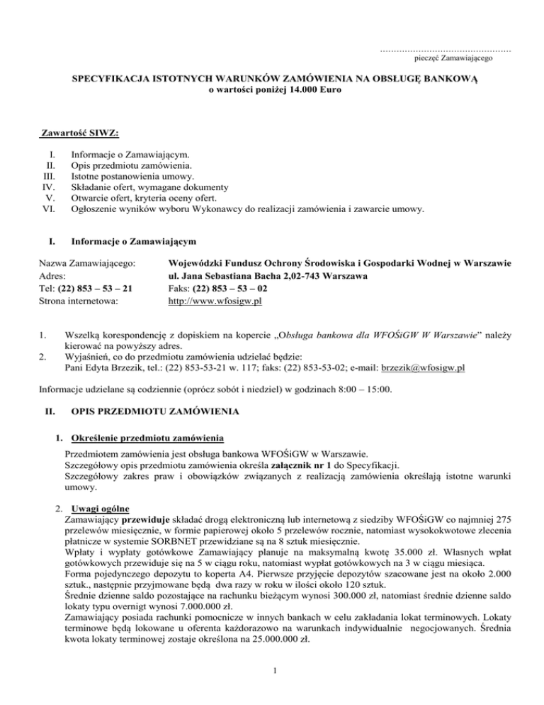………………………………………… pieczęć Zamawiającego SPECYFIKACJA ISTOTNYCH WARUNKÓW ZAMÓWIENIA NA OBSŁUGĘ BANKOWĄ o wartości poniżej 14.000 Euro Zawartość SIWZ: I. II. III. IV. V. VI. I. Informacje o Zamawiającym. Opis przedmiotu zamówienia. Istotne postanowienia umowy. Składanie ofert, wymagane dokumenty Otwarcie ofert, kryteria oceny ofert. Ogłoszenie wyników wyboru Wykonawcy do realizacji zamówienia i zawarcie umowy. Informacje o Zamawiającym Nazwa Zamawiającego: Adres: Tel: (22) 853 – 53 – 21 Strona internetowa: 1. 2. Wojewódzki Fundusz Ochrony Środowiska i Gospodarki Wodnej w Warszawie ul. Jana Sebastiana Bacha 2,02-743 Warszawa Faks: (22) 853 – 53 – 02 http://www.wfosigw.pl Wszelką korespondencję z dopiskiem na kopercie „Obsługa bankowa dla WFOŚiGW W Warszawie” należy kierować na powyższy adres. Wyjaśnień, co do przedmiotu zamówienia udzielać będzie: Pani Edyta Brzezik, tel.: (22) 853-53-21 w. 117; faks: (22) 853-53-02; e-mail: [email protected] Informacje udzielane są codziennie (oprócz sobót i niedziel) w godzinach 8:00 – 15:00. II. OPIS PRZEDMIOTU ZAMÓWIENIA 1. Określenie przedmiotu zamówienia Przedmiotem zamówienia jest obsługa bankowa WFOŚiGW w Warszawie. Szczegółowy opis przedmiotu zamówienia określa załącznik nr 1 do Specyfikacji. Szczegółowy zakres praw i obowiązków związanych z realizacją zamówienia określają istotne warunki umowy. 2. Uwagi ogólne Zamawiający przewiduje składać drogą elektroniczną lub internetową z siedziby WFOŚiGW co najmniej 275 przelewów miesięcznie, w formie papierowej około 5 przelewów rocznie, natomiast wysokokwotowe zlecenia płatnicze w systemie SORBNET przewidziane są na 8 sztuk miesięcznie. Wpłaty i wypłaty gotówkowe Zamawiający planuje na maksymalną kwotę 35.000 zł. Własnych wpłat gotówkowych przewiduje się na 5 w ciągu roku, natomiast wypłat gotówkowych na 3 w ciągu miesiąca. Forma pojedynczego depozytu to koperta A4. Pierwsze przyjęcie depozytów szacowane jest na około 2.000 sztuk., następnie przyjmowane będą dwa razy w roku w ilości około 120 sztuk. Średnie dzienne saldo pozostające na rachunku bieżącym wynosi 300.000 zł, natomiast średnie dzienne saldo lokaty typu overnigt wynosi 7.000.000 zł. Zamawiający posiada rachunki pomocnicze w innych bankach w celu zakładania lokat terminowych. Lokaty terminowe będą lokowane u oferenta każdorazowo na warunkach indywidualnie negocjowanych. Średnia kwota lokaty terminowej zostaje określona na 25.000.000 zł. 1 3. Termin realizacji zamówienia Zamawiający wymaga, by zamówienie było realizowane przez okres od 1 września 2011 roku do 31 sierpnia 2016 roku. III. 1. 2. 3. 4. 5. 6. 7. 8. 9. 10. 11. 12. 13. 14. IV. Istotne postanowienia umowy Bank zobowiązuje się do otwarcia i prowadzenia rachunku bankowego w złotych polskich służącego do bieżących rozliczeń oraz rachunków pomocniczych w ilości określonej w załączniku nr 1 do Specyfikacji, Termin realizacji zamówienia: od 1 września 2011 r do 31 sierpnia 2016 r. Bank posiada nie mniej niż jedną placówkę obsługi klienta w jednej z centralnych dzielnic Warszawy tj. Śródmieście, Mokotów, przy czym odległość od siedziby WFOŚIGW w Warszawie (ul. Jana Sebastiana Bacha 2) nie może przekraczać 8 km. Przyjmowanie depozytów na przechowywanie w skarbcu znajdujących się w siedzibie Banku. Odbiór depozytów z siedziby WFOŚiGW w Warszawie dwa razy w roku, przy czym zakończenie procesu odbioru depozytów powinno zamknąć się w terminie do dwóch tygodni od daty zgłoszenia drogą elektroniczną. Dostarczanie przez Bank do siedziby Funduszu depozytów raz w miesiącu, przy czym zakończenie procesu dostarczania powinno zamknąć się w terminie siedmiu dni od daty zgłoszenia drogą elektroniczną. Bank zapewnia niezmienność opłat, prowizji i oprocentowania, z wyjątkiem korzystniejszych dla Zamawiającego, w czasie obowiązywania umowy, Zamawiający zastrzega sobie możliwość naliczania kar umownych za: a. rozwiązanie umowy z przyczyn niezależnych od Zamawiającego, Wykonawca zapłaci karę w wysokości 20 000 zł, b. za niezgodną z postanowieniami opisu przedmiotu zamówienia i postanowieniami umowy, realizację zalecanej operacji bankowej, w tym opóźnienie – 0,1% kwoty będącej przedmiotem operacji. Pomocnicze rachunki bankowe są oprocentowane od dnia zawarcia umowy w wysokości ..........% w stosunku rocznym. Odsetki są dopisywane do salda na koniec miesiąca. Jeżeli następuje likwidacja rachunku odsetki stawiane są do dyspozycji Posiadacza w dniu likwidacji. Przelewy zwykłe zatwierdzone w systemie elektronicznym minimum do godziny 14:30 Bank zrealizuje w dniu złożenia, przelewy złożone później zostaną zrealizowane w następnym dniu roboczym. Przelewy wysokokwotowe złożone minimum do godziny 14:30 Bank zrealizuje w dniu złożenia, przelewy złożone później zostaną zrealizowane w następnym dniu roboczym. Odpowiedzialność odszkodowawcza Banku za opóźnienia w realizacji zlecenia płatniczego płatna jest w wysokości rzeczywistych strat poniesionych przez Posiadacza rachunku bankowego. Cena oferty i poszczególnych jej składników nie może ulec zwiększeniu w całym okresie trwania umowy. Wszystkie zmiany warunków umowy wymagają formy pisemnej. Składanie ofert, wymagane dokumenty 1. Oferty należy składać w zamkniętych kopertach w siedzibie WFOŚiGW w Warszawie, przy ul. J. S. Bacha 2 w Kancelarii na III piętrze w terminie do dnia 20.07.2011 r. do godz. 10:00. 2. Sporządzoną ofertę należy opakować w kopertę oznaczoną dokładną nazwą i adresem Wykonawcy oraz napisem „Obsługa bankowa WFOŚiGW, nie otwierać przed 20.07.2011 r.” 3. Ofertę należy złożyć z wykorzystaniem formularza ofertowego stanowiącego załącznik nr 2 do siwz 4. Zamawiający zastrzega, że wyłączne ryzyko nieterminowego dostarczenia oferty oraz pomyłkowego 
