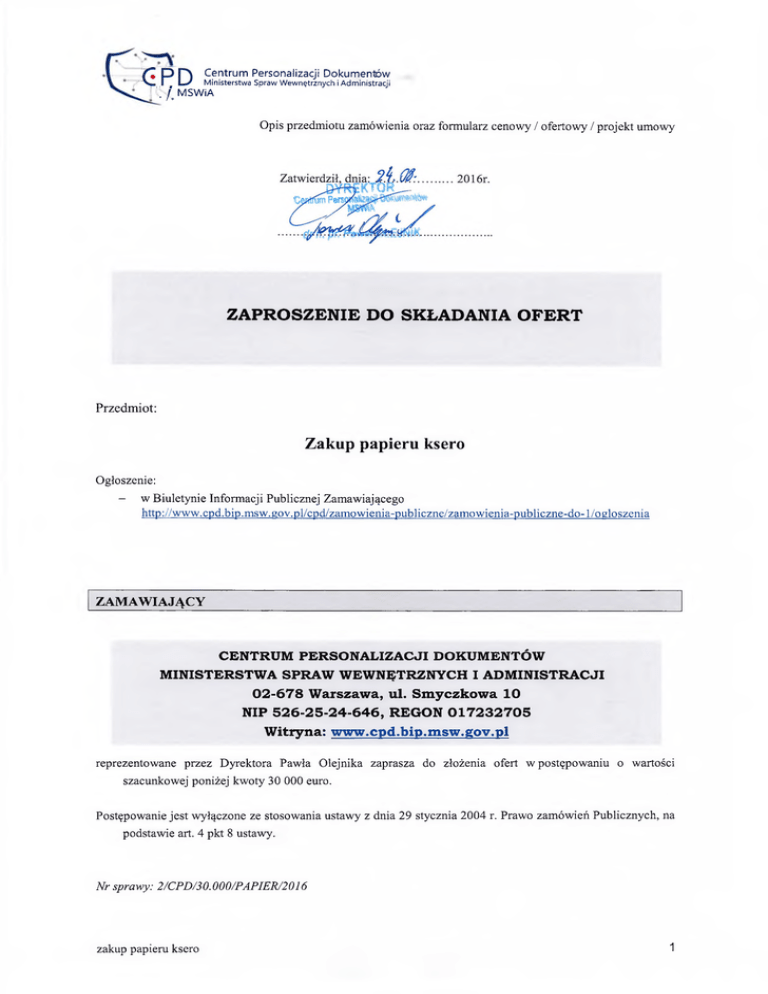 Centrum Personalizacji Dokumentów Ministerstwa Spraw Wewnętrznych i Administracji . f %MSWiA Opis przedmiotu zamówienia oraz formularz cenowy / ofertowy / projekt umowy ZAPROSZENIE DO SKŁADANIA OFERT Przedmiot: Zakup papieru ksero Ogłoszenie: - w Biuletynie Informacji Publicznej Zamawiającego http://www.cpd.bip.msw.gov.pl/cpd/zamowienia-publiczne/zamowienia-publiczne-do-l/ogloszenia ZAMAWIAJĄCY CENTRUM PERSONALIZACJI DOKUMENTÓW MINISTERSTWA SPRAW WEWNĘTRZNYCH I ADMINISTRACJI 0 2 -6 7 8 W arszawa, ul. S m y czk o w a 10 NIP 5 2 6 -2 5 -2 4 -6 4 6 , REGON 0 1 7 2 3 2 7 0 5 W itryna: w w w .cp d .b ip .m sw .gov.p l reprezentowane przez Dyrektora Pawła Olejnika zaprasza do złożenia ofert w postępowaniu o wartości szacunkowej poniżej kwoty 30 000 euro. Postępowanie jest wyłączone ze stosowania ustawy z dnia 29 stycznia 2004 r. Prawo zamówień Publicznych, na podstawie art. 4 pkt 8 ustawy. Nr sprawy: 2/CPD/30.000/PAPIER/2016 zakup papieru ksero 1 (Z P PS Centrum Personalizacji Dokumentów V . I Ministerstwa Spraw Wewnętrznych i Administracji L✓ . I MSWiA Opis przedmiotu zamówienia oraz formularz cenowy / ofertowy / projekt umowy l OPIS PRZEDMIOTU ZAMÓWIENIA Przedmiotem umowy jest zakup oraz dostawa do siedziby Zamawiającego papieru kserograficznego o wymaganiach jakościowych i ilościach określonych poniżej w tabeli: Nazwa Papier kserograficzny: - bielony, - bezchlorkowy, - bezpyłowy, - przeznaczony do drukarek atramentowych i laserowych do druku jedno i dwustronnego oraz kopiowania na kserokopiarkach Specyfikacja techniczna • • • • • • Format A-4, Gramatura: 80±2g/m123, Kolor-biały; białość min. 161 CIE wg ISOl 1475, Nieprzezroczystość: min. 94% wg IS02471, Grubość min.l08pm wg IS0534, Ilość arkuszy w ryzie-500 szt. Jednostka miary ryza Ilość Termin dostawy 5 000 Dostawy realizowane będą, w terminie 10 dni licząc od daty podpisania umowy oraz 10 dni, licząc od pisemnego złożenia przez Zamawiającego zamówienia, jednak nie później niż do 1 grudnia 2016r. TERMIN WYKONANIA ZAMÓWIENIA 1. Termin realizacji dostaw do siedziby Zamawiającego: 1) I dostawa w ilości 2 500 ryz - do 10 dni od podpisania umowy, 2) II dostawa, w ilości 2 500 ryz - do 10 dni, licząc od pisemnego złożenia przez Zamawiającego zamówienia, jednak nie później niż do 1 grudnia 2016r., w ilości 2 500 ryz. INFORMACJE O Z WYKONAWCAMI 1. 2. SPOSOBIE POROZUMIEWANIA SIĘ ZAMAWIAJĄCEGO Wszelkie zapytania powinny być kierowane faksem, na numer: (22) 60-17-898 lub przesłane pisemnie na adres: ul. Smyczkowa 10, 02-678 Warszawa. Informacje i wyjaśnienia uzyskać można od poniedziałku do piątku w godz. 8.00 - 15.00. MIEJSCE ORAZ TERMIN SKŁADANIA I OTWARCIA OFERT 1. 2. 3. V. Termin składania ofert upływa w dniu 2 września 2016r. (za termin złożenia oferty przyjmuje się termin wpłynięcia oferty do Zamawiającego, bezpośrednio do Kancelarii w godz. 8.15-16,15 -pok. 0,02 (parter), lub faksem na numer: (22) 60-17-898. W celu uzyskania przepustki uprawniającej do wejścia, do budynku Centrum Personalizacji Dokumentów MSWiA prosimy o kontakt telefoniczny - tel. (22) 60-17-838 lub 60-17-839 - podanie imienia i nazwiska osoby wchodzącej oraz nazwy reprezentowanej przez nią firmy. Warunkiem uzyskania przepustki jest posiadanie dowodu osobistego. Badanie ofert nastąpi w dniu otwarcia ofert, a jego wyniki zostaną opublikowane na stronie Biuletynu informacji Publicznej (link) http://www.cpd.bip.msw.gov.pl/cpd/zamowienia-publiczne/zamowienia-publiczne-do-l/ogloszenia. OPIS SPOSOBU OBLICZENIA CENY 1. 2. 3. Wykonawca poda cenę oferty w formularzu ofertowym zgodnie ze wzorem. Cenę za cały przedmiot zamówienia należy podać w złotych polskich. Cena musi być ostateczną, sumaryczną ceną obejmującą wszystkie koszty związane z realizacją przedmiotu zamówienia. zakup papieru ksero 2 TZ D P \ Centrum Personalizacji Dokumentów % Ministerstwa Spraw Wewnętrznych i Administracji I ł—Z . / MSWiA 4. 5. 6. Opis przedmiotu zamówienia oraz formularz cenowy / ofertowy / projekt umowy Cena winna być podana z zaokrągleniem do dwóch miejsc po przecinku. Wykonawca zobowiązany jest stosować matematyczne reguły zaokrąglania. Rozliczenia pomiędzy Wykonawcą, a Zamawiającym będą prowadzone tylko w złotych polskich. Zamawiający nie przewiduje rozliczeń w innej walucie. Wykonawca wypełni w formularzu ofertowym kwotę oferowanego papieru oraz jego parametry techniczne według specyfikacji a także określi producenta oraz nazwę oferowanego papieru. OPIS KRYTERIÓW, KTÓRYMI ZAMAWIAJĄCY BĘDZIE SIĘ KIEROWAŁ PRZY WYBORZE OFERTY, WRAZ Z PODANIEM ZNACZENIA TYCH KRYTERIÓW I SPOSOBU OCENY OFERT Zamawiający będzie oceniał oferty według następujących kryteriów dla przedmiotu zamówienia: 2. Nr: Nazwa Kryterium Waga kryterium 1 Cena brutto zaoferowana za wykonanie przedmiotu zamówienia - C 100% Punkty przyznawane za podane kryteria będą liczone, z zaokrągleniem do jednego miejsca po przecinku, według następującego wzorów:___________________________________________________________ Nr kryterium: Wzór: Cena brutto za realizację przedmiotu zamówienia Liczba punktów = (Cmin/C„f) X waga 1 3. 4. 5. 6. gdzie: - Cmin- oznacza najniższą cenę brutto (z VAT) w PLN spośród ważnych ofert (niepodlegających odrzuceniu lub wykluczeniu) - C„f - oznacza cenę brutto (z VAT) podaną w ofercie w PLN Oceniane będą wyłącznie oferty złożone w wyznaczonym terminie. Zamawiający odrzuci ofertę, jeżeli zostanie złożona po upływie wyznaczonego terminu. Zamawiający odrzuci ofertę, jeżeli w wyniku weryfikacji zostanie stwierdzone, iż oferowany papier ksero odbiega od wymagań określonych przez Zamawiającego. Za najkorzystniejszą ofertę zostanie uznana ta oferta, która otrzyma najwyższą ilość punktów za w/w. kryteria dla przedmiotu zamówienia. WYMAGANIA DOTYCZĄCE ZABEZPIECZENIA NALEŻYTEGO WYKONANIA UMOWY Zamawiający nie żąda 