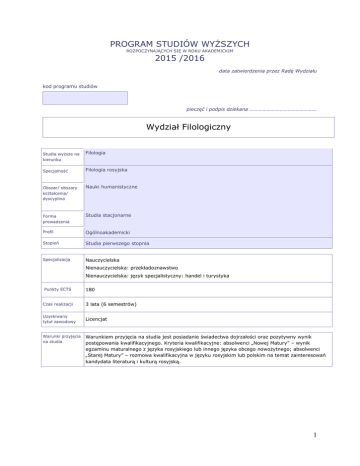 PROGRAM STUDIÓW WYŻSZYCH ROZPOCZYNAJĄCYCH SIĘ W ROKU AKADEMICKIM 2015 /2016 data zatwierdzenia przez Radę Wydziału kod programu studiów pieczęć i podpis dziekana …………………………………………… Wydział Filologiczny Studia wyższe na kierunku Filologia Specjalność Filologia rosyjska Obszar/ obszary kształcenia/ dyscyplina Nauki humanistyczne Forma prowadzenia Studia stacjonarne Profil Ogólnoakademicki Stopień Studia pierwszego stopnia Specjalizacja Nauczycielska Nienauczycielska: przekładoznawstwo Nienauczycielska: język specjalistyczny: handel i turystyka Punkty ECTS 180 Czas realizacji 3 lata (6 semestrów) Uzyskiwany tytuł zawodowy Licencjat Warunki przyjęcia na studia Warunkiem przyjęcia na studia jest posiadanie świadectwa dojrzałości oraz pozytywny wynik postępowania kwalifikacyjnego. Kryteria kwalifikacyjne: absolwenci „Nowej Matury” – wynik egzaminu maturalnego z języka rosyjskiego lub innego języka obcego nowożytnego; absolwenci „Starej Matury” – rozmowa kwalifikacyjna w języku rosyjskim lub polskim na temat zainteresowań kandydata literaturą i kulturą rosyjską. 1 Efekty kształcenia Symbol Kierunkowe efekty kształcenia K1_W01 WIEDZA ma podstawową wiedzę o miejscu i znaczeniu filologii, w systemie nauk oraz ich H1A_W01 specyfice przedmiotowej i metodologicznej K1_W02 zna podstawową terminologię z zakresu filologii K1_W03 ma uporządkowaną wiedzę ogólną obejmującą terminologię, teorie i metodologię H1A_W03 z zakresu filologii K1_W04 ma uporządkowaną wiedzę szczegółową z zakresu filologii K1_W05 ma podstawową wiedzę o powiązaniach dziedzin nauki i dyscyplin naukowych H1A_W05 właściwych dla filologii z innymi dziedzinami i dyscyplinami obszaru nauk humanistycznych K1_W06 ma podstawową wiedzę o głównych kierunkach rozwoju i najważniejszych H1A_W06 nowych osiągnięciach w zakresie filologii K1_W07 zna i rozumie podstawowe metody analizy i interpretacji różnych wytworów H1A_W07 kultury właściwe dla wybranych tradycji, teorii lub szkół badawczych w zakresie filologii K1_W08 zna i rozumie podstawowe pojęcia i zasady z zakresu prawa autorskiego K1_W09 ma świadomość kompleksowej natury języka oraz jego złożoności i historycznej H1A_W09 zmienności jego znaczeń K1_W010 ma podstawową wiedzę o instytucjach kultury i orientację we współczesnym H1A_W010 życiu kulturalnym K1_U01 Odniesienie do efektów kształcenia dla obszaru nauk humanistycznych H1A_W02 H1A_W04 H1A_W08 UMIEJĘTNOŚCI potrafi wyszukiwać, analizować, oceniać, selekcjonować i użytkować informacje z H1A_U01 zakresu filologii z wykorzystaniem różnych źródeł i sposobów K1_U02 posiada podstawowe umiejętności badawcze, obejmujące formułowanie i analizę H1A_U02 problemów badawczych w zakresie językoznawstwa i literaturoznawstwa oraz kultury i historii krajów danego obszaru językowego K1_U03 umie samodzielnie zdobywać wiedzę i rozwijać umiejętności badawcze w zakresie H1A_U03 filologii kierując się wskazówkami opiekuna naukowego K1_U04 w typowych sytuacjach zawodowych, potrafi posługiwać się podstawowymi H1A_U04 ujęciami teoretycznymi i pojęciami właściwymi dla filologii K1_U05 potrafi rozpoznać różne rodzaje wytworów kultury oraz przeprowadzić ich H1A_U05 krytyczną analizę i interpretację z zastosowania typowych metod, w celu określenia ich znaczeń, oddziaływania społecznego, miejsca w procesie historyczno-kulturowym K1_U06 posiada umiejętność argumentowania, z wykorzystaniem poglądów innych H1A_U06 autorów, oraz formułowania wniosków K1_U07 na płaszczyźnie naukowej, potrafi porozumiewać się z innymi filologami, z H1A_U07 wykorzystaniem różnych kanałów i technik komunikacyjnych w języku polskim i języku obcym podstawowym dla swojej specjalności K1_U08 posiada umiejętność przygotowania i zredagowania prac pisemnych w języku H1A_U08 obcym podstawowym dla swojej specjalności z wykorzystaniem podstawowych ujęć teoretycznych K1_U09 posiada umiejętność przygotowania wystąpień ustnych i prezentacji w języku H1A_U09 obcym podstawowym dla swojej specjalności 2 K1_U10 zna język obcy podstawowy dla swojej specjalności na poziomie C1 oraz drugi H1A_U010 język obcy na poziomie B2, zgodnie z wymaganiami określonymi przez Europejski System Opisu Kształcenia Językowego K1_K01 rozumie potrzebę uczenia się przez całe życie H1A_K01 K1_K02 rozumie potrzebę uczenia się języków obcych H1A_K01 K1_K03 potrafi współdziałać i pracować w grupie, przyjmując w niej różne role H1A_K02 K1_K04 potrafi współdziałać i pracować w wielokulturowej grupie H1A_K02 K1_05 potrafi odpowiednio określić priorytety służące realizacji określonego przez siebie H1A_K03 lub innych zadania K1_06 prawidłowo identyfikuje i rozstrzyga dylematy związane z wykonywaniem H1A_K04 zawodu K1_K07 ma świadomość odpowiedzialności za zachowanie dziedzictwa kulturowego K1_08 uczestniczy w życiu kulturalnym, korzystając z różnych mediów i różnych jego H1A_K06 form KOMPETENCJE SPOŁECZNE Sylwetka absolwenta H1A_K05 Sylwetka absolwenta kierunku Filologia jest zgodna z uregulowaniami przyjętymi w ramach Procesu Bolońskiego, tzw. deskryptorami efektów kształcenia. Absolwent studiów posiada ogólną wiedzę o języku, literaturze i kulturze z zakresu wybranego języka oraz umiejętności wykorzystania jej w pracy zawodowej i życiu. Legitymuje się zbliżoną do rodzimej znajomością języka obcego na poziomie biegłości C1 (wg ESOKJ Rady Europy) oraz posiada znajomość drugiego języka obcego na poziomie biegłości B2. Posiada interdyscyplinarne kompetencje pozwalające na wykorzystanie wiedzy o języku i jego znajomości w różnorodnych dziedzinach nauki i życia społecznego. Absolwent umie rozwiązywać problemy zawodowe, gromadzić, przetwarzać oraz przekazywać (pisemnie i ustnie) informacje ogólne, a także uczestniczyć w pracy zespołowej. Jest p