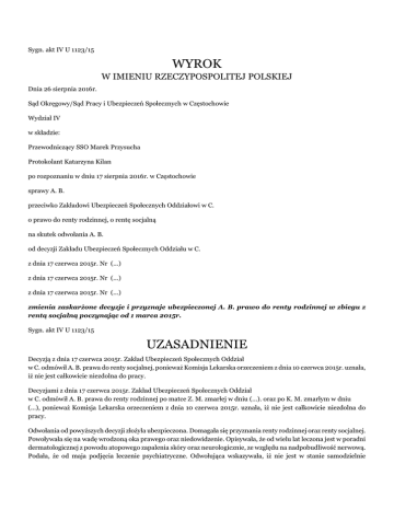 Sygn. akt IV U 1123/15 WYROK W IMIENIU RZECZYPOSPOLITEJ POLSKIEJ Dnia 26 sierpnia 2016r. Sąd Okręgowy/Sąd Pracy i Ubezpieczeń Społecznych w Częstochowie Wydział IV w składzie: Przewodniczący SSO Marek Przysucha Protokolant Katarzyna Kilan po rozpoznaniu w dniu 17 sierpnia 2016r. w Częstochowie sprawy A. B. przeciwko Zakładowi Ubezpieczeń Społecznych Oddziałowi w C. o prawo do renty rodzinnej, o rentę socjalną na skutek odwołania A. B. od decyzji Zakładu Ubezpieczeń Społecznych Oddziału w C. z dnia 17 czerwca 2015r. Nr (...) z dnia 17 czerwca 2015r. Nr (...) z dnia 17 czerwca 2015r. Nr (...) zmienia zaskarżone decyzje i przyznaje ubezpieczonej A. B. prawo do renty rodzinnej w zbiegu z rentą socjalną poczynając od 1 marca 2015r. Sygn. akt IV U 1123/15 UZASADNIENIE Decyzją z dnia 17 czerwca 2015r. Zakład Ubezpieczeń Społecznych Oddział w C. odmówił A. B. prawa do renty socjalnej, ponieważ Komisja Lekarska orzeczeniem z dnia 10 czerwca 2015r. uznała, iż nie jest całkowicie niezdolna do pracy. Decyzjami z dnia 17 czerwca 2015r. Zakład Ubezpieczeń Społecznych Oddział w C. odmówił A. B. prawa do renty rodzinnej po matce Z. M. zmarłej w dniu (...). oraz po K. M. zmarłym w dniu (...), ponieważ Komisja Lekarska orzeczeniem z dnia 10 czerwca 2015r. uznała, iż nie jest całkowicie niezdolna do pracy. Odwołania od powyższych decyzji złożyła ubezpieczona. Domagała się przyznania renty rodzinnej oraz renty socjalnej. Powoływała się na wadę wrodzoną oka prawego oraz niedowidzenie. Opisywała, że od wielu lat leczona jest w poradni dermatologicznej z powodu atopowego zapalenia skóry oraz neurologicznie, ze względu na nadpobudliwość nerwową. Podała, że od maja podjęcia leczenie psychiatryczne. Odwołująca wskazywała, iż nie jest w stanie samodzielnie funkcjonować. Nie daje sobie rady w codziennym życiu. Wskazywała, iż rodzice opiekowali się nią, dbali o nią, zapewniali byt, chodzili z nią do lekarzy. Ubezpieczona wyjaśniała, że w obecnej rzeczywistości nie potrafi się odnaleźć, nie potrafi przygotować obiadu, dysponować pieniędzmi otrzymanymi z pomocy społecznej, włączyć pralki. Podawała, iż w adaptacji do sytuacji pomagają jej pracownicy socjalni MOPS. Organ rentowy wniósł o oddalenie odwołania, wywodząc jak w zaskarżonych decyzjach. Sąd Okręgowy ustalił i zważył, co następuje: A. B. urodziła się (...) Ukończyła szkołę zawodową, do czerwca 2005r. uczyła się w liceum (...) (k. 37-39 dok. orzeczniczo-lekarskiej tom I). W dniu 12 marca 2015r. odwołująca złożyła wniosek o rentę socjalną. W dniu 16 marca 2015r. ubezpieczona złożyła wniosek o rentę po uprawnionej do emerytury matce Z. M. zmarłej w dniu (...). W dniu 17 marca 2015r. ubezpieczona złożyła wniosek o rentę po uprawnionym do emerytury ojcu K. M. zmarłym (...) Lekarz Orzecznik orzeczeniem z dnia 8 kwietnia 2015r. uznał, że wnioskodawczyni nie jest całkowicie niezdolna do pracy. W związku z powyższym orzeczeniem organ rentowy decyzją z dnia 23 kwietnia 2015r. odmówił ubezpieczonej prawa do renty socjalnej oraz decyzjami z dnia 23 i 24 kwietnia 2015r. odmówił jej prawa do renty rodzinnej po zmarłych rodzicach. Odwołanie od powyższych decyzji złożyła ubezpieczona. Prawomocnym postanowieniem z dnia 18 maja 2015r. wydanym w sprawie sygn. (...) Sąd Okręgowy w C. odrzucił odwołanie ubezpieczonej na podstawie art. 477( 9) § 3( 1) k.p.c. W dniu 21 maja 2015r. ubezpieczona złożyła wniosek o przywrócenie terminu do wniesienia sprzeciwu od orzeczenia Lekarza Orzecznika. Postanowieniem z dnia 27 maja 2015r. organ rentowy przywrócił ubezpieczonej termin na wniesienie sprzeciwu do Komisji Lekarskiej ZUS i przekazał sprawę tej Komisji do rozpoznania. Komisja Lekarska, rozpatrując sprzeciw od orzeczenia Lekarza Orzecznika, wydała w dniu 10 czerwca 2015r. orzeczenie, że wnioskodawczyni nie jest całkowicie niezdolna do pracy. W związku z powyższym orzeczeniem organ rentowy wydał zaskarżone decyzje. dowód: akta ZUS, akta sprawy (...) U ubezpieczonej rozpoznaje się upośledzenie umysłowe w stopniu umiarkowanym, głębokie zaburzenia osobowości z przeważającymi cechami osobowości zależnej i infantylnej, zeza zbieżnego oka prawego, stan po zabiegu operacyjnym usunięcia zaćmy wrodzonej, wylewie krwi do ciała szklistego, leczeniu jaskry wtórnej oka prawego, ślepotę oka prawego, niezborność nadwzroczną złożoną oka lewego, praktyczną jednooczność. Ubezpieczona nie jest całkowicie niezdolna do pracy z przyczyn okulistycznych i neurologicznych. Z przyczyn psychiatrycznych odwołująca jest całkowicie niezdolna do pracy na okres dwóch lat, a niezdolność do pracy wystąpiła u niej przed ukończeniem 16 roku życia. dowód: opinia biegłego z zakresu okulistyki lek. M. S. (1) (k. 51-99 akt), opinia biegłego z zakresu neurologii lek. K. J. (k. 111-112 akt), opinia biegłego z zakresu psychiatrii dr med. M. S. (2) (k. 145-150 akt), opinia uzupełniająca tego biegłego (k. 180 akt). Na podstawie art. 65 ust. 1 ustawy z dnia 17 grudnia 1998r. o emeryturach i rentach z Funduszu Ubezpieczeń Społecznych (Dz. U. z 2016r. poz. 887) renta rodzinna przysługuje uprawnionym członkom rodziny osoby, która w chwili śmierci miała ustalone prawo do emerytury lub renty z tytułu niezdolności do pracy lub spełniała warunki wymagane do uzyskania jednego z tych świadczeń. Rodzice ubezpieczonej byli uprawnieni do emerytury. Wedle art. 68 ust. 1 ustawy dzieci własne, dzieci drugiego małżonka i dzieci przysposobione mają prawo do renty rodzinnej: 1) do ukończenia 16 lat; 2) do ukończenia nauki w szkole, jeżeli przekroczyły 16 lat życia, nie dłużej jednak niż do osiągnięcia 25 lat życia, albo 3) bez względu na wiek, jeżeli stały się całkowicie niezdolne do pracy oraz do samodzielnej egzystencji lub całkowicie niezdolne do pracy w okresie, o którym mowa w pkt 1 lub 2. Zgodnie 