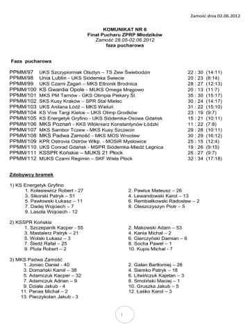 Zamość dnia 02.06.2012 KOMUNIKAT NR 6 Finał Pucharu ZPRP Młodzików Zamość 28.05-02.06.2012 faza pucharowa Faza pucharowa PPMM/97 PPMM/98 PPMM/99 PPMM/100 PPMM/101 PPMM/102 PPMM/103 PPMM/104 PPMM/105 PPMM/106 PPMM/107 PPMM/108 PPMM/109 PPMM/110 PPMM/111 PPMM/112 UKS Szczypiorniak Olsztyn – TS Zew Świebodzin Unia Lublin - UKS Siódemka Świecie UKS Czarni Żagań – MKS Eltronik Brodnica KS Gwardia Opole - MUKS Omega Mrągowo MKS PM Tarnów - GKS Olimpia Piekary Śl. SKS Kusy Kraków – SPR Stal Mielec UKS Anilana Łódź – MKS Wieluń KS Vive Targi Kielce – UKS Olimp Grodków KS Energetyk Gryfino - UKS Siódemka-Osowa Gdańsk MKS Poznań - KKS Włókniarz Konstantynów Łódzki MKS Sambor Tczew - MKS Kusy Szczecin MKS Padwa Zamość - MKS MOS Wrocław KPR Ostrovia Ostrów Wlkp. - MOSiR Mysłowice UKS Conrad Gdańsk - MSPR Siódemka-Miedź Legnica KSSPR Końskie – MUKS 21 Płock MUKS Czarni Regimin – SKF Wisła Płock 22 : 30 20 : 23 28 : 27 20 : 13 35 : 30 30 : 24 31 : 22 23 : 19 15 : 21 11 : 22 29 : 28 30 : 29 25 : 15 19 : 26 25 : 27 32 : 34 Zdobywcy bramek 1) KS Energetyk Gryfino 1. Kołasiewicz Robert - 27 3. Sikorski Patryk – 51 5. Pawłowski Łukasz – 11 7. Dadej Wojciech – 7 9. Lasota Wojciech - 12 2. Pawlus Mateusz – 26 4. Lewandowski Karol – 13 6. Rembiałkowski Radosław – 2 8. Oleszczyszyn Piotr – 5 2) KSSPR Końskie 1. Szczepanik Kacper - 55 3. Mastalerz Patryk – 21 5. Wolski Łukasz – 3 7. Śledź Rafał – 25 9. Pluta Robert – 2 2. Makowski Adam – 53 4. Kania Michał – 2 6. Gierczyński Damian – 6 8. Socha Paweł – 1 10. Kupis Michał - 7 3) MKS Padwa Zamość 1. Joniec Daniel - 40 3. Domański Kamil – 38 5. Adamczuk Kacper – 32 7. Adamczuk Adrian – 9 9. Działa Jakub - 4 11. Panas Michał – 2 13. Pieczykolan Jakub - 3 2. Gałan Bartłomiej – 26 4. Siemko Patryk – 18 6. Litwińczuk Kajetan – 3 8. Smoliński Maciej – 1 10. Gruszka Jakub – 5 12. Łaśko Karol – 3 1 (14:11) (8:14) (12:13) (11:7) (15:17) (14:17) (15:10) (9:7) (10:11) (7:8) (10:11) (16:12) (12:4) (9:15) (9:7) (17:18) 4) KPR Ostrovia Ostrów Wlkp. 1. Gajek Ksawery - 16 3. Kaczmarek Matusz – 25 5. Pietrzak Adrian – 21 7. Siemaniak Dawid – 9 9. Kryjom Mateusz – 1 11. Olszyna Adam – 1 2. Stepniak Dawid – 28 4. Pszyszlak Marcin – 17 6. Brychcy Artur – 13 8. Dołubizno Patryk – 9 10. Barczyński Mateusz – 1 12. Janasik Marcin - 1 5) MSPR Siódemka - Miedź Legnica 1. Siwak Karol - 23 3. Duda Kacper – 26 5. Łyczko Bartłomiej – 25 7. Kehle Szymon – 7 9. Zembrzycki Janusz – 1 11. Wysoczański Marcin – 5 13. Pawlicki Paweł – 1 2. Szaynowski Piotr – 25 4. Niewadzi Tomasz – 7 6. Dobrasiak Mateusz – 8 8. Stańko Maciej – 3 10. Holewski Marcel – 1 12. Witkowski Mateusz – 1 6) MKS Poznań 1. Maćkowiak Patryk - 28 3. Słupski Mateusz – 11 5. Szamajda Maciej – 12 7. Tasarek Wiktor – 5 9. Styczyński Patryk – 27 11.Szałamacha Piotr – 3 2. Tyliński Kamil – 30 4. Zajma Krystian – 8 6. Zieliński Mikołaj – 10 8. Dziegciar Dawid – 7 10. Wojniewicz Damian – 3 7) MUKS Czarni Regimin 1. Dębiec Patryk - 101 3. Malinowski Kacper – 37 5. Margiel Arkadiusz – 15 7. Szymczak Bartosz – 1 9. Dobrzeniecki Dawid – 1 2. Szymański Kamil – 20 4. Morawski Mateusz – 23 6. Daszczyński Jakub – 12 8. Ścisłowski Kamil – 1 9. Najder Patryk - 2 8) MKS Sambor Tczew 1. Saczuk Patryk - 26 3. Słowik Maciej – 32 5. Świtała Mateusz – 24 7. Huebner Jakub – 10 9. Szostak Patryk – 5 11. Grzelak Robert – 9 2. Czudek Sebastian – 27 4. Piekarski Oskar – 7 6. Kasprzak Michał – 24 8. Waruszewski Rafał – 6 10. Sadowski Kacper – 2 12. Woźniak Paweł - 3 9) UKS Conrad Gdańsk 1. Łukasiewicz Dominik - 53 3. Zieliński Bartosz – 23 5. Leszczyński Bartosz – 17 7. Skierawski Rafał – 5 9. Wejner Dominik – 4 2. Kaniowski Damian – 30 4. Strahl Bartosz – 26 6. Golanowski Sebastian - 11 8. Dworaczek Sergiusz - 3 10. Piórkowski Patryk - 1 10) UKS Siódemka - Osowa Gdańsk 1. Kudełka Przemysław - 34 3. Myszk Maciej – 23 5. Pawlak Łukasz – 9 7. Czapran Michał - 9 9. Kierat Mateusz – 1 2. Grzywaczewski Michał – 13 4. Piastowski Artur – 21 6. Siemaszko Dawid – 6 8. Wierzbicki Dominik – 22 10 .Lewandowski Tomasz - 1 2 11) SKF Wisła Płock 1.Turkowski Adrian – 62 3. Rybicki Dominik – 46 5. Brzeziński Konrad – 8 7. Skrocki Dominik – 10 9. Smolarek Mariusz – 16 11. Guralski Mateusz – 1 13. Nowak Szymon – 2 2. Smolarek Marcin – 34 4. Lemaniak Michał – 20 6. Goliszewski Daniel – 14 8. Dutkowski Michał – 5 10. Trojanowicz Konrad – 1 12. Kołowrocki Damian – 1 14. Janiszewski Tadeusz - 1 12) MKS MOS Wrocław 1. Tkaczuk Daniel - 41 3. Lewalski Piotr – 25 5. Rajewski Jędrzej – 6 7. Burzyński Piotr – 13 9 . Jacykowski Mateusz – 1 11. Winiarski Arkadiusz – 1 13. Putyło Patryk – 2 2. Palica Łukasz – 12 4. Misiurka Wiktor - 3 6. Sadowski Maciej – 13 8. Szafrański Dominik – 14 10. Duda Jakub – 5 12. Mieszawski Patryk – 4 14. Narbutowicz Łukasz - 1 13) KKS Włókniarz Konstantynów Ł. 1. Dolik Mateusz - 39 3. Zajc Bartosz – 27 5. Magdziak Bartosz – 8 7. Jencz Bartosz – 2 9. Bąkała Dawid – 5 11. Kunc Adrian – 1 13. Pitala Jakub - 1 2. Karga Kamil – 24 4. Borsiak Bartosz – 22 6. Kliber Witold – 10 8. Kubryn Łukasz – 14 10. Szymczyk Bartosz - 9 12. Bakała Dawid – 2 14) MOSiR Mysłowice 1.Korczyk Jacek - 50 3. Dembicz Dominik – 35 5. Krzak Artur – 12 7. Myszor Maciej – 6 9. Misiek Radosław – 2 11. Kosman Mateusz - 2 2. Mauer Jakub – 23 4. Lampa Szymon – 17 6. Gnyp Filip – 1 8. Pytel Maciej – 1 10. Balicki Piotr – 3 15) MKS Kusy Szczecin 1. Lasek Adam - 32 3. Łutowicz Dawid – 9 5. Wasowski Adam – 2 7. Rudnikowicz Sławomir – 1 9. Krysiak Dawid – 4 11. Nosowski Adam – 2 13. Piskorzyński Oskar – 7 16) MUKS 21 Płock 1. Wypych Patryk - 55 3. Waluch Mikołaj – 39 5. Żaglewski Dam