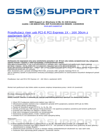 GSM-Support ul. Bitschana 2/38, 31-420 Kraków mobile +48 608107455, NIP PL9451852164 REGON: 120203925 www.gsm-support.pl Przedłużacz riser usb PCI-E PCI Express 1X - 16X 30cm z zasilaniem SATA Zachęcamy do negocjacji ceny przy zamówieniu powyżej 1 szt. W tym celu należy zarejestrować się, zalogować, zapisać koszyk i zapytać o rabat korzystając z funkcjonalności sklepu. Płyty główne komputerów PC nie są przystosowane do montażu wielu najnowszych kart graficznych. Często zajmują szerokość 2 slotów i nie ma możliwości wykorzystania wszystkich gniazd na płycie komputera. Dzięki specjalnemu przedłużaczowi - kablowi riser możesz podpiąć dowolną kartę, gdyż jest to jedyny sposób na zapewnienie odpowiedniej przestrzeni do montażu. Riser zbudowany jest z gniazda żeńskiego PCI-E 16X, przewodu USB i gniazda męskiego PCI-E 1X. Jest to najtańszy sposób na poprawienie wentylacji pozwalający jednocześnie na wykorzystanie wszystkich dostępnych gniazd PCI-E 1X. Przedłużacz riser usb PCI-E PCI Express 1X - 16X 30cm z zasilaniem SATA Montaż kart graficznych zbyt blisko siebie na pewno zwiększy temperaturę pracy i skróci ich żywotność. Przykłady zastosowania riserów PCI-E Zalety nowych riserów w stosunku do riserów poprzedniej generacji opartych na elastycznej taśmie: Wtyki PCI-E połączone elektrycznie kablem typu USB 3.0 Wbudowane gniazdo zasilania wraz z adapterem gniazda SATA (podpinamy zasilanie SATA jak do HDD) 2 wysokiej jakości kondensatory Pasuje do wszystkich gniazd PCI-E tj. 1x, 4x, 8x, 16x Smukły przewód typu USB zajmuje mniej przestrzeni i nie ogranicza przepływu powietrza pod kartami graficznymi Przewód typu USB łatwy do odpięcia z obydwu stron Brak luźno zwisających przewodów czy kondensatorów Wykonanie wysokiej jakości, trwałe i stabilne porty Gniazdo PCI-E x16 zaizolowane od strony lutów specjalną taśmą Właściwości: Riser zapewnia przedłużenie 1 gniazda PCI-E 1x, 4x, 8x, 16x (max przepustowość jak w gnieździe 1X) Zastosowanie przewodu typu USB w Riserze PCI-E 1X - 16X pozwala na odsunięcie karty graficznej od płyty głównej i zamontowanie w zasięgu długości Wielofunkcyjność pozwala na użycie w różnego rodzaju niestandardowych obudowach np. typu open-case. Pozłacane styki poprawiają jakość połączeń i żywotność riserów. Nie wymaga jakiejkolwiek konfiguracji Pasuje do slotów i gniazd PCI-Express 1X Zgodne ze specyfikacją PCI Express Version 1.0, 2.0 Zastosowanie również w obudowach rackowych 1U/2U Długość przewodu USB: 230mm (samego kabla bez wtyków USB) Całkowita długość wraz z wtykami PCI-E: 300mm ©2012 www.gsm-support.pl Opis ten nie stanowi oferty w rozumieniu Kodeksu Cywilnego. GSM-Support zastrzega sobie prawo do możliwych błędów w opisie produktu. Prosimy o weryfikację z Państwa strony, a w razie wątpliwości o kontakt. GSM-Support ul. Bitschana 2/38 31-420 Kraków POLSKA tel. 608107455 e-mail: [email protected] Powered by TCPDF (www.tcpdf.org)