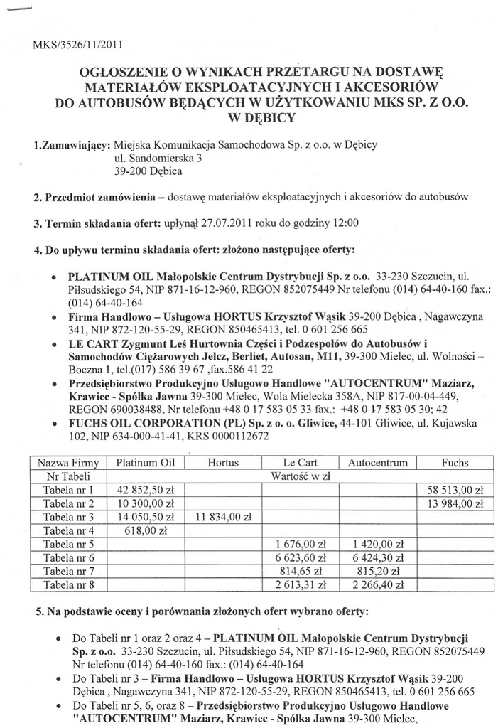 5 MKS/3526/11/2011 OGLOSZENIE O WYNIKACH PRZETARGU NA DOSTAWE MATERIALÓW EKSPLOATACYJNYCH I AKCESORIÓW DO AUTOBUSÓW BEDACYCH W UZYTKOWANIU MKS SP. Z 0.0. W DEBICY l.Zamawiajacy: Z.Przedmiot Miejska Komunikacja Samochodowa Sp. z 0.0. w Debicy ul. Sandomierska 3 39-200 Debica zamówienia - dostawe materialów eksploatacyjnych i akcesoriów do autobusów 3. Termin skladania ofert: uplynal 27.07.2011 roku do godziny 12:00 4. Do uplywu terminu skladania • ofert: zlozono nastepujace oferty: PLATINUM OIL Malopolskie Centrum Dystrybucji Sp. z 0.0. 33-230 Szczucin, ul. Pilsudskiego 54, NIP 871-16-12-960, REGON 852075449 Nr telefonu (014) 64-40-160 fax.: (014) 64-40-164 Firma Handlowo - Uslugowa HORTUS Krzysztof Wasik 39-200 Debica, Nagawczyna 341, NIP 872-120-55-29, REGON 850465413, tel. 0601 256665 LE CART Zygmunt Les Hurtownia Czesci i Podzespolów do Autobusów i Samochodów Ciezarowych Jelcz, Berliet, Autosan, MU, 39-300 Mielec, ul. WolnosciBoczna 1, tel.(017) 586 39 67 ,fax.586 41 22 Przedsiebiorstwo Produkcyjno Uslugowo Handlowe "AUTOCENTRUM" Maziarz, Krawiec - Spólka Jawna 39-300 Mielec, Wola Mielecka 358A, NIP 817-00-04-449, REGON 690038488, Nr telefonu +48 O 17 583 05 33 fax.: +48 O 17 583 05 30; 42 FUCHS OIL CORPORATION (PL) Sp. z o. o. Gliwice, 44-101 Gliwice, ul. Kujawska 102, NIP 634-000-41-41, KRS 0000112672 • • • • Le Platinum Cart Hortus Fuchs Oil 14050,50 16424,30 815,20 2266,40 11 618,00 420,00 834,00 zlzlzlzl zl 10 300,00 42852,50 Nazwa FirmyAutocentrum 5. Na podstawie oceny i porównania • • • Wartosc zl 1814,65 676,00wzlzl 6623,60 2613,31 13 984,00 zl 58513,00 zl zlozonych ofert wybrano oferty: Do Tabeli nr 1 oraz 2 oraz 4 - PLATINUM OIL Malopolskie Centrum Dystrybucji Sp. z 0.0. 33-230 Szczucin, ul. Pilsudskiego 54, NIP 871-16-12-960, REGON 852075449 Nr telefonu (014) 64-40-160 fax.: (014) 64-40-164 Do Tabeli nr 3 - Firma Handlowo - Uslugowa HORTUS Krzysztof Wasik 39-200 Debica, Nagawczyna 341, NIP 872-120-55-29, REGON 850465413, tel. O 601 256665 Do Tabeli nr 5, 6, oraz 8 - Przedsiebiorstwo Produkcyjno Uslugowo Handlowe "AUTOCENTRUM" Maziarz, Krawiec - Spólka Jawna 39-300 Mielec, • Wola Mielecka 358A, NIP 817-00-04-449, REGON 690038488 Nr telefonu +48 O 17583 05 33 fax.: +48 O 1758,30530; 42 Do Tabeli nr 7 - LE CART Zygmunt Les Hurtownia Czesci i Podzespolów do Autobusów i Samochodów Ciezarowych Jelcz, Berliet, Autosan, Mll, 39-300 Mielec, ul. Wolnosci - Boczna l, tel.(017) 586 39 67 ,fax0586 41 22 6. Uzasadnienie wyboru: Oferty najkorzystniejsze cenowo. Otrzymuja: lo Oferenci 20 Ala