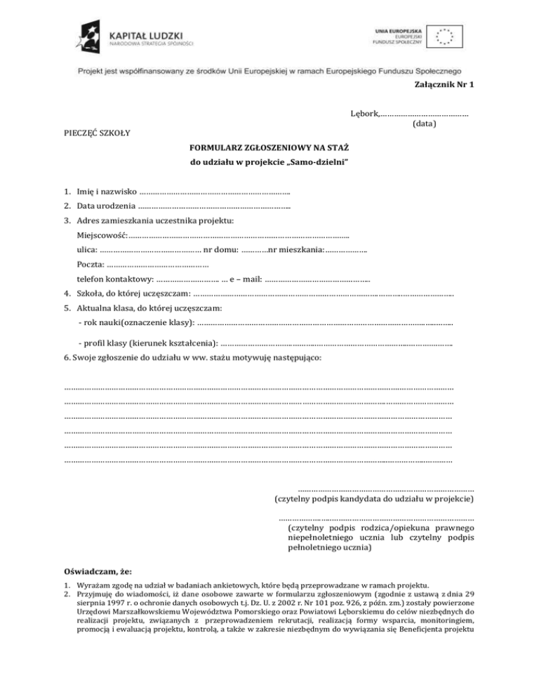 Załącznik Nr 1 Lębork,………………………………… (data) PIECZĘĆ SZKOŁY FORMULARZ ZGŁOSZENIOWY NA STAŻ do udziału w projekcie „Samo-dzielni” 1. Imię i nazwisko …………………………………………………………. 2. Data urodzenia ………………………………………………………….. 3. Adres zamieszkania uczestnika projektu: Miejscowość:…………………………………………………………………………………….. ulica: ……………………………………… nr domu: …………nr mieszkania:………………. Poczta: ……………………………………… telefon kontaktowy: ………………………. … e – mail: ……………………………………….. 4. Szkoła, do której uczęszczam: ……………………………………………………………………….………..………………….. 5. Aktualna klasa, do której uczęszczam: - rok nauki(oznaczenie klasy): ………………………………………………………………………………………..…..…….. - profil klasy (kierunek kształcenia): …………………………..………..…………………………………..………….……. 6. Swoje zgłoszenie do udziału w ww. stażu motywuję następująco: ………………………………………………………………………………………………………………………………….…………………… …………………………………………………………………………………………………………………………….………………………… ……………………………………………………………………………………………………………………………………………………… ……………………………………………………………………………………………………………………………………………………… ……………………………………………………………………………………………………………………………………………………… ……………………………………………………………………………………………………………………………..……………..………… …………………………………………………………………… (czytelny podpis kandydata do udziału w projekcie) ……………….…..……………………………………………………… (czytelny podpis rodzica/opiekuna prawnego niepełnoletniego ucznia lub czytelny podpis pełnoletniego ucznia) Oświadczam, że: 1. Wyrażam zgodę na udział w badaniach ankietowych, które będą przeprowadzane w ramach projektu. 2. Przyjmuję do wiadomości, iż dane osobowe zawarte w formularzu zgłoszeniowym (zgodnie z ustawą z dnia 29 sierpnia 1997 r. o ochronie danych osobowych t.j. Dz. U. z 2002 r. Nr 101 poz. 926, z późn. zm.) zostały powierzone Urzędowi Marszałkowskiemu Województwa Pomorskiego oraz Powiatowi Lęborskiemu do celów niezbędnych do realizacji projektu, związanych z przeprowadzeniem rekrutacji, realizacją formy wsparcia, monitoringiem, promocją i ewaluacją projektu, kontrolą, a także w zakresie niezbędnym do wywiązania się Beneficjenta projektu 3. 4. 5. 6. z obowiązków sprawozdawczych wobec Instytucji Pośredniczącej. Jednocześnie oświadczam, iż zostałem(am) poinformowany(a) o: - celu zbierania danych, prawie dostępu do treści swoich danych osobowych, a także ich poprawiania, przetwarzanych przez Beneficjenta projektu oraz Instytucję Pośredniczącą, - możliwości ich przetwarzania w przyszłości pod warunkiem, że nie zostanie zmieniony cel przetwarzania. Wyrażam zgodę na nieodpłatne wykorzystanie mojego wizerunku/wizerunku mojego dziecka przez Powiat Lęborski i Urząd Marszałkowski Województwa Pomorskiego w Gdańsku (w całości i we fragmentach) dla potrzeb monitoringu, ewaluacji i promocji projektu zgodnie z przepisami Ustawy z dnia 04.02.1994 r. o prawie autorskim i prawach pokrewnych (t.j. Dz. U. z 2006 r., Nr 90, poz. 631 z późn. zm.). Jednocześnie oświadczam, iż zostałem(am) poinformowany(a) o celu wykorzystania mojego/mojego dziecka wizerunku. Zostałem/am poinformowany/a o tym, że projekt „Samo-dzielni” jest współfinansowany ze środków Unii Europejskiej w ramach Europejskiego Funduszu Społecznego. Zapoznałem/am się z Regulaminem staży zawodowych oraz jestem przedstawicielem grupy docelowej wymienionej § 3 niniejszego regulaminu (spełniam kryteria kwalifikowalności uprawniające mnie do udziału w projekcie). Zostałem pouczony/a o odpowiedzialności za składanie oświadczeń niezgodnych z prawdą. Podane przeze mnie dane są zgodne z prawdą, co zaświadczam swoim podpisem. ………………………..…………………………………………………………………………………… (czytelny podpis rodzica/opiekuna prawnego niepełnoletniego ucznia lub czytelny podpis pełnoletniego ucznia*) *niepotrzebne skreślić OPINIA ZAKŁADU PRACY: Opiniuję pozytywnie*) / negatywnie*) kandydaturę (proszę podać imię i nazwisko ucznia): ………………………………………………………………………………………..……………………….. do odbycia stażu w zakładzie pracy (proszę podać nazwę zakładu pracy): …………………………………………………………..…………………………………………………….. na stanowisku (proszę podać nazwę stanowiska pracy): …………………………………………………………..…………………………………………………….. W przypadku zakwalifikowania ww. ucznia do udziału w stażu w ramach projektu „Samo-dzielni” zobowiązuję się do podpisania z Powiatem Lęborskim umowy o organizację stażu oraz do realizacji staż