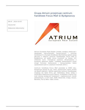 Grupa Atrium przejmuje centrum handlowe Focus Mall w Bydgoszczy 08:42 2014-10-07 CIJ Journal Załączone dokumenty: Atrium European Real Estate Limited, wiodący właściciel i deweloper nieruchomości komercyjnych i centrów handlowych w Europie Środkowo-Wschodniej ogłosił swoją decyzję o nabyciu centrum handlowego Focus Mall w Bydgoszczy od spółki Aviva Investors za kwotę 122 milionów euro. Transakcja zostanie sfinansowana z funduszy własnych spółki i podlega zatwierdzeniu przez Urząd Ochrony Konkurencji i Konsumentów, które spodziewane jest w czwartym kwartale 2014 r. Centrum handlowe Focus Mall powstało w 2008 roku. Dysponuje ponad 41 tys. mkw. powierzchni najmu brutto na dwóch piętrach. Wśród najemców centrum handlowego znajdują się takie firmy jak: Delikatesy Alma, sklep z artykułami elektronicznymi Saturn, multipleks Cinema City oraz szereg wiodących krajowych i zagranicznych marek odzieżowych, w tym C&A, H&M, Reserved, Cropp, House, Bershka, Pull & Bear i New Yorker. 1/1