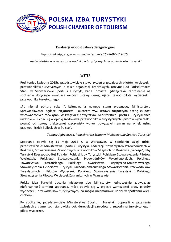 Polska Izba Turystyki, wychodząc z założenia, że kwestia deregulacji zawodu przewodnika