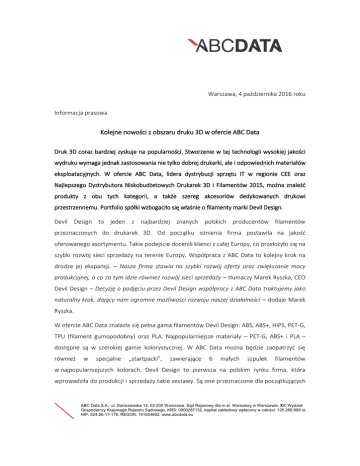 Warszawa, 4 października 2016 roku Informacja prasowa Kolejne nowości z obszaru druku 3D w ofercie ABC Data Druk 3D coraz bardziej zyskuje na popularności. Stworzenie w tej technologii wysokiej jakości wydruku wymaga jednak zastosowania nie tylko dobrej drukarki, ale i odpowiednich materiałów eksploatacyjnych. W ofercie ABC Data, lidera dystrybucji sprzętu IT w regionie CEE oraz Najlepszego Dystrybutora Niskobudżetowych Drukarek 3D i Filamentów 2015, można znaleźć produkty z obu tych kategorii, a także szereg akcesoriów dedykowanych drukowi przestrzennemu. Portfolio spółki wzbogaciło się właśnie o filamenty marki Devil Design. Devil Design to jeden z najbardziej znanych polskich producentów filamentów przeznaczonych do drukarek 3D. Od początku istnienia firma postawiła na jakość oferowanego asortymentu. Takie podejście docenili klienci z całej Europy, co przełożyło się na szybki rozwój sieci sprzedaży na terenie Europy. Współpraca z ABC Data to kolejny krok na drodze jej ekspansji. – Nasza firma stawia na szybki rozwój oferty oraz zwiększanie mocy produkcyjnej, a co za tym idzie również rozwój sieci sprzedaży – tłumaczy Marek Ryszka, CEO Devil Design – Decyzję o podjęciu przez Devil Design współpracy z ABC Data traktujemy jako naturalny krok, dający nam ogromne możliwości rozwoju naszej działalności – dodaje Marek Ryszka. W ofercie ABC Data znalazła się pełna gama filamentów Devil Design: ABS, ABS+, HIPS, PET-G, TPU (filament gumopodobny) oraz PLA. Najpopularniejsze materiały – PET-G, ABS+ i PLA – dostępne są w szerokiej gamie kolorystycznej. W ABC Data można będzie zaopatrzyć się również w specjalne „startpacki”, zawierające 6 małych szpulek filamentów w najpopularniejszych kolorach. Devil Design to pierwsza na polskim rynku firma, która wprowadziła do produkcji i sprzedaży takie zestawy. Są one przeznaczone dla początkujących ABC Data S.A., ul. Daniszewska 14, 03-230 Warszawa, Sąd Rejonowy dla m.st. Warszawy w Warszawie, XIII Wydział Gospodarczy Krajowego Rejestru Sądowego, KRS: 0000287132, kapitał zakładowy wpłacony w całości: 125.266.899 zł, NIP: 524-26-17-178, REGON: 141054682, www.abcdata.eu użytkowników oraz osób i firm, które niewielkim kosztem chcą rozszerzyć swoją kolekcję materiałów o nowe kolory. – Filamenty Devil Design stanowią cenne uzupełnienie wciąż rozbudowywanej oferty ABC Data – wyjaśnia Adam Suchenek, Kierownik Grupy KAM w ABC Data – Produkty tej marki słyną z dobrej jakości, którą potwierdziliśmy podczas wewnętrznych testów poprzedzających ich wprowadzenie do naszego portfolio. Zależy nam na tym, aby znajdowały się w nim wyłącznie rozwiązania 3D wysokiej klasy, a nowe filamenty spełniają ten warunek – dodaje Adam Suchenek. Wysoka jakość produktów Devil Design sprawia, że z powodzeniem korzystają z nich nie tylko hobbyści, lecz także firmy i przedsiębiorstwa produkcyjne. Klienci ABC Data mogą zaopatrzyć się w nie już teraz, m.in. poprzez platformę InterLink. Są na niej dostępne również inne produkty dedykowane drukowi 3D, w tym nowości, które w ostatnim czasie dołączyły do portfolio ABC Data, jak skanery 3D Pixelio. O ABC Data S.A. ABC Data S.A., ul. Daniszewska 14, 03-230 Warszawa, Sąd Rejonowy dla m.st. Warszawy w Warszawie, XIII Wydział Gospodarczy Krajowego Rejestru Sądowego, KRS: 0000287132, kapitał zakładowy wpłacony w całości: 125.266.899 zł, NIP: 524-26-17-178, REGON: 141054682, www.abcdata.eu ABC Data S.A. jest liderem rynku dystrybucji sprzętu IT i elektroniki użytkowej w Polsce oraz jedynym podmiotem działającym bezpośrednio w ośmiu państwach Europy Środkowej i Wschodniej (należących do UE). Firma od ponad 25 lat oferuje sprzęt komputerowy, oprogramowanie i elektronikę użytkową. ABC Data dysponuje największą na rynku ofertą 220 tys. produktów przeszło 1 000 renomowanych marek. W ubiegłym roku do portfolio produktowego włączone zostały nowe kategorie takie jak produkty smart, artykuły papiernicze i biurowe, zabawki oraz narzędzia i elektronarzędzia. Dzięki systematycznemu rozwojowi i wieloletnim inwestycjom w internetowe platformy obsługi klientów, firma zajmuje czołową pozycję w zakresie sprzedaży on-line. W latach 2009 – 2016 ABC Data została sześciokrotnie wyróżniona nagrodą EMEA Channel Academy dla najlepszego dystrybutora regionu Europy Środkowo-Wschodniej. W 2015 roku spółka po raz kolejny zajęła pierwsze miejsce w głównym rankingu raportu Computerworld TOP 200 utrzymując status największej firmy informatycznej na rynku polskim. Jako pierwsza firma z Polski została członkiem GTDC, prestiżowego stowarzyszenia obejmującego największych dystrybutorów IT na świecie. W 2010 roku ABC Data S.A. zadebiutowała na Giełdzie Papierów Wartościowych w Warszawie. Za kontakty z mediami odpowiada: Agnieszka Forasińska ABC Data S.A. [email protected] +48 22 591 67 83 ABC Data S.A., ul. Daniszewska 14, 03-230 Warszawa, Sąd Rejonowy dla m.st. Warszawy w Warszawie, XIII Wydział Gospodarczy Krajowego Rejestru Sądowego, KRS: 0000287132, kapitał zakładowy wpłacony w całości: 125.266.899 zł, NIP: 524-26-17-178, REGON: 141054682, www.abcdata.eu