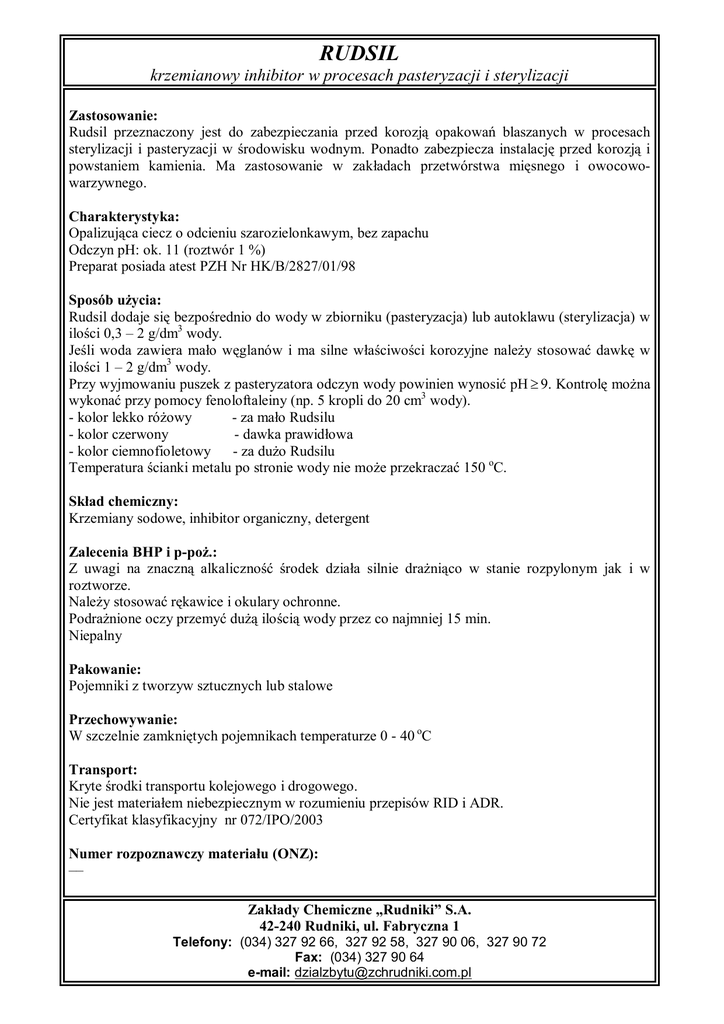 RUDSIL krzemianowy inhibitor w procesach pasteryzacji i sterylizacji Zastosowanie: Rudsil przeznaczony jest do zabezpieczania przed korozją opakowań blaszanych w procesach sterylizacji i pasteryzacji w środowisku wodnym. Ponadto zabezpiecza instalację przed korozją i powstaniem kamienia. Ma zastosowanie w zakładach przetwórstwa mięsnego i owocowowarzywnego. Charakterystyka: Opalizująca ciecz o odcieniu szarozielonkawym, bez zapachu Odczyn pH: ok. 11 (roztwór 1 %) Preparat posiada atest PZH Nr HK/B/2827/01/98 Sposób użycia: Rudsil dodaje się bezpośrednio do wody w zbiorniku (pasteryzacja) lub autoklawu (sterylizacja) w ilości 0,3 – 2 g/dm3 wody. Jeśli woda zawiera mało węglanów i ma silne właściwości korozyjne należy stosować dawkę w ilości 1 – 2 g/dm3 wody. Przy wyjmowaniu puszek z pasteryzatora odczyn wody powinien wynosić pH ³ 9. Kontrolę można wykonać przy pomocy fenoloftaleiny (np. 5 kropli do 20 cm3 wody). - kolor lekko różowy - za mało Rudsilu - kolor czerwony - dawka prawidłowa - kolor ciemnofioletowy - za dużo Rudsilu Temperatura ścianki metalu po stronie wody nie może przekraczać 150 oC. Skład chemiczny: Krzemiany sodowe, inhibitor organiczny, detergent Zalecenia BHP i p-poż.: Z uwagi na znaczną alkaliczność środek działa silnie drażniąco w stanie rozpylonym jak i w roztworze. Należy stosować rękawice i okulary ochronne. Podrażnione oczy przemyć dużą ilością wody przez co najmniej 15 min. Niepalny Pakowanie: Pojemniki z tworzyw sztucznych lub stalowe Przechowywanie: W szczelnie zamkniętych pojemnikach temperaturze 0 - 40 oC Transport: Kryte środki transportu kolejowego i drogowego. Nie jest materiałem niebezpiecznym w rozumieniu przepisów RID i ADR. Certyfikat klasyfikacyjny nr 072/IPO/2003 Numer rozpoznawczy materiału (ONZ): –– Zakłady Chemiczne „Rudniki” S.A. 42-240 Rudniki, ul. Fabryczna 1 Telefony: (034) 327 92 66, 327 92 58, 327 90 06, 327 90 72 Fax: (034) 327 90 64 e-mail: [email protected]