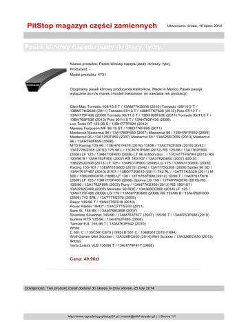 PitStop magazyn części zamiennych Utworzono: środa, 16 lipiec 2014 Pasek klinowy napędu jazdy -krótszy, tylny. Nazwa produktu: Pasek klinowy napędu jazdy -krótszy, tylny. Producent: Model produktu: 4731 Oryginalny pasek klinowy producenta traktorkow. Made in Mexico.Pasek pasuje wyłącznie do n/w marek i modeli traktorkow: (w nawiasie rok produkcji) Oleo-Mac Tornado 108/15,5 T / 13AM77KG636 (2010) Tornado 108/15,5 T / 13BM77KG636 (2011) Tornado 97/13 T / 13BH77KF636 (2013) Polo 97/13 T / 13AH779F436 (2008) Tornado 95/11,5 T / 13BH768F636 (2011) Tornado 95/11,5 T / 13BH768F636 (2013) Polo 95/11.5 T / 13AH762F436 (2008) Lux Tools RT 135-96 S / 13BH77TF694 (2012) Massey Ferguson MF 38-15 ST / 13BD776F695 (2011) Mastercut Mastercut 96 / 13A1760F659 (2007) Mastercut 96 / 13EH761F659 (2009) Mastercut 96 / 13A1760F459 (2007) Mastercut 60 / 13A625EC659 (2013) Mastercut 96 / 13AH760F659 (2008) MTD Racing 125-96 / 13EH761F676 (2010) 13538 / 13AC762F308 (2010) 20/42 / 13AT77KG308 (2010) 175.96 L / 13CN761F686 (2012) RS 125/96 / 13A1762F600 (2006) LF 125 / 13AH773F600 (2008) LT 96 Edition-Sui... / 13CH771F679H (2013) RS 125/96 B / 13AH762F400 (2007) RS 180/107 / 13A3762G600 (2007) 420/30 / 13B226JD308 (2013) LF 125 / 13AH773F600 (2008) LG 175 / 13AN773G600 (2009) Racing 155-107 / 13EM761G600 (2010) 20/42 / 13AT775G308 (2009) Spider 96 SD / 13AH761F467 (2010) 5/107 / 13BO773G615 (2011) 742 RL / 13AT77KS329 (2011) M 500 / 136C560C678 (1996) LF 130 / 13TH763F600 (2012) 12/96 T / 13AH761F676 (2006) LF 125 / 13AH773F400 (2008) Optima LG 155 / 13TM77KG678 (2013) RS 125/96 / 13A1762F600 (2007) Pony / 13AN77KS309 (2013) RS 180/107 / 13A3762G400 (2007) Minirider 60 RDE / 13A326EC600 (2014) LF 125 / 13AH773F400 (2008) LG 175 / 13AN773G600 (2008) RS 125/96 B / 13AH762F600 (2009) 742 SRL / 13AT775G370 (2009) Rasor 135/96 T / 13AH775F618 (2010) Rover Raider 18/42" / 13AO77TS333 (2011) Sarp SL 155 BS / 13AM768G698 (2007) Silverline Silvertrac 145/96 / 13AM763F677 (2007) 155/96 T / 13AM763F686 (2010) Sunline RTS 125/96 / 13AH762F685 (2008) Tamver EJL 155-96 T / 13AM763F642 (2010) White C 561 C / 135C561C679 (1995) B 561 C / 134B561C679 (1994) Wolf-Garten Mini Scooter / 13A326EC650 (2014) Mini Scooter / 13A326EC650 (2013) Verts Loisirs VLB 135/96 T / 13AH779F417 (2008) Cena: 49.90zł Dostępność: Ten produkt został dodany do sklepu w dniu wtorek, 25 luty 2014 http://www.ogrodniczy-pitstop24.pl | [email protected] | | Strona 1/1