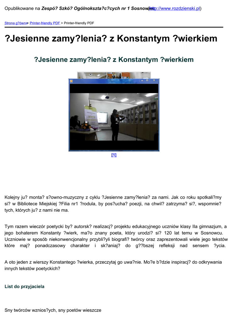 Opublikowane na Zespó? Szkó? Ogólnokszta?c?cych nr 1 Sosnowiec (http://www.rozdzienski.pl) Strona g?ówna> Printer-friendly PDF > Printer-friendly PDF ?Jesienne zamy?lenia? z Konstantym ?wierkiem ?Jesienne zamy?lenia? z Konstantym ?wierkiem [1] Kolejny ju? monta? s?owno-muzyczny z cyklu ?Jesienne zamy?lenia? za nami. Jak co roku spotkali?my si? w Bibliotece Miejskiej ?Filia nr1 ?rodula, by pos?ucha? poezji, na chwil? zatrzyma? si?, wspomnie? tych, których ju? z nami nie ma. Tym razem wieczór poetycki by? autorsk? realizacj? projektu edukacyjnego uczniów klasy IIa gimnazjum, a jego bohaterem Konstanty ?wierk, ma?o znany poeta, który urodzi? si? 120 lat temu w Sosnowcu. Uczniowie w sposób niekonwencjonalny przybli?yli biografi? twórcy oraz zaprezentowali wiele jego tekstów, które maj? ponadczasowy charakter i sk?aniaj? do g??bszej refleksji nad sensem ?ycia. A oto jeden z wierszy Konstantego ?wierka, przeczytaj go uwa?nie. Mo?e b?dzie inspiracj? do odkrywania innych tekstów poetyckich? List do przyjaciela Sny twórców wznios?ych, sny poetów wieszcze Oblok?y Polsk? w królów gronostaje, A gdy ci? dzisiaj n?dza chwyta w kleszcze, To, przyjacielu, si?y ci nie staje, Aby uwierzy?, ?e królewsko?? taka Owoców ziemi darmo nie rozdaje Za to, ?e? mianem obdarzon Polaka, ?e? w walce krwawi? poprzez obce kraje. Je?li? mi?owa? Ojczyzn? w niewoli, Chocia? grozi?y ci wi?zienne kraty, Je?li? wygodnej wyrzeka? si? doli Po to, by dzisiaj za??da? zap?aty. Po to, by mog?y w Polsce rdz? zaj?? p?ugi, Bo ty wysi?ku swoich mi??ni nie dasz, To fa?szem by?y twe dawne zas?ugi, Które? Ojczy?nie wystawi? na sprzeda?. Je?li? dzi? rozbrat wzi?? z pot??nym czynem, Patrz?c w twarz Polski okiem niemal wra?em, To? nie jest teraz jej najlepszym synem, Ale swej dawnej mi?o?ci handlarzem. Poetyckie spotkania nale?? ju? do tradycji i maj? swoich sympatyków. Bardzo dzi?kujemy wszystkim go?ciom, w szczególno?ci nauczycielom, rodzicom, uczniom, a tak?e absolwentom Ró?dzienia, którzy znale?li czas, by z nami tego wieczoru by?. Bardzo dzi?kujemy równie? niezwykle sympatycznym Pracownikom Biblioteki Miejskiej-Filia nr 1w Sosnowcu. Mi?a atmosfera, serdeczno?? tworzy?y wyj?tkow? opraw? ?Jesiennych zamy?le??. Serdecznie dzi?kuj? m?odzie?y odpowiedzialnej za zorganizowanie wieczoru! Gratuluj? pomys?u! Wasze zaanga?owanie oraz determinacja zas?uguj? na uznanie. Wyst?pili: Dominika Cielniaszek, Aleksandra Komur, Wiktoria ?uczkiewicz, Weronika Mazur, Dominika Mielczarek, Katarzyna Miszczak,Weronika Pieklak, Wiktoria Rz?d, Maja Wyl??ek, Daniel Czernek, Patryk Hajniak, Jakub Konina, Pawe? Kowalski, Mateusz Zar?ba, Jaros?aw Welcel, Jakub Wi?niewski. Zobacz zdj?cia I [2] Zobacz zdj?cia II [3] Tekst: mgr Dorota Lichwa?a 3 grudnia 2015 r. w Bibliotece Miejskiej w Sosnowcu -?roduli odby? si? wieczorek poetycki z cyklu ?Jesienne zamy?lenia". W tym roku uczniowie Gimnazjum nr 11 oraz I Liceum Ogólnokszta?c?cego w Sosnowcu pochylili si? nad ?yciem i twórczo?ci? Konstantego ?wierka - poety, który pomimo tego ?e urodzi? si? w Sosnowcu, nie jest w nim zbyt znanym twórc?. Uczniowie z przej?ciem recytowali takie wiersze, jak: ?Czas?, ?Listopad?, ?Poezja a prawda?. Mogli?my podziwia? równie? utwór ?Fantazja" w wykonaniu skrzypcowym. Sam wyst?p zebra? sporo pozytywnych opinii. Tekst: Patryk Hajniak klasa IIAG Strefa gimnazjalisty[4] © ZSO nr 1, Sosnowiec 2008-2015e-mail: Administrator Adres ?ród?a:http://www.rozdzienski.pl/pl/zawartosc/2015-12-04-%E2%80%9Ejesiennezamy%C5%9Blenia%E2%80%9D-z-konstantym-%C4%87wierkiem Odno?niki: [1] http://www.rozdzienski.nazwa.pl/2015/JesienneZamysleniazKC/1.png [2] http://www.rozdzienski.nazwa.pl/2015/JesienneZamysleniazKC/index.html [3] http://www.rozdzienski.nazwa.pl/2015/JesienneZamysleniazKC/1/index.html [4] http://www.rozdzienski.pl/pl/category/tagi/strefa-gimnazjalisty