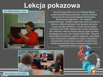Lekcja pokazowa Pani Elżbieta Bilska w akcji. Nauczyciele w roli uczniów. Dnia 28 lutego 2013 roku pani Elżbieta Bilska przeprowadziła lekcję pokazową z zakresu edukacji muzycznej dla nauczycieli Zespołu EdukacyjnoWychowawczego klas I – III i oddziału przedszkolnego. Tematem zajęć była nauka piosenki pt. Wiosna w żółtych kaloszach oraz aktywne słuchanie muzyki Jerzego Haendla pt. Country dance według koncepcji Carla Orffa. Zajęcia miały na celu pokazanie, jak w aktywny i twórczy sposób nauczyć dzieci piosenki posługując się w tym celu metodą Carla Orffa. Wszyscy nauczyciele brali aktywny udział w zajęciach, wystukiwali rytmy kubeczkami, pudełkami po mleku, nietypowymi instrumentami muzycznymi, tańczyli z chustami przy melodii peruwiańskiej. Była to nietypowa lekcja, która koleżankom bardzo się podobała. Wszyscy nauczyciele się świetnie bawili podczas zajęć.