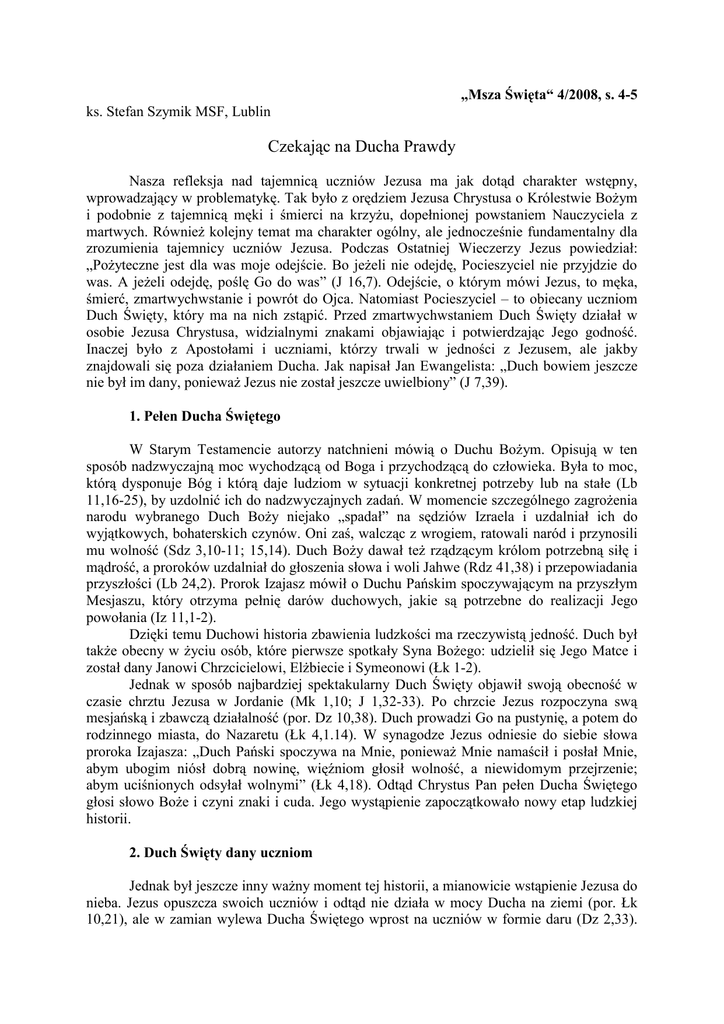 „Msza Święta“ 4/2008, s. 4-5 ks. Stefan Szymik MSF, Lublin Czekając na Ducha Prawdy Nasza refleksja nad tajemnicą uczniów Jezusa ma jak dotąd charakter wstępny, wprowadzający w problematykę. Tak było z orędziem Jezusa Chrystusa o Królestwie Bożym i podobnie z tajemnicą męki i śmierci na krzyżu, dopełnionej powstaniem Nauczyciela z martwych. Również kolejny temat ma charakter ogólny, ale jednocześnie fundamentalny dla zrozumienia tajemnicy uczniów Jezusa. Podczas Ostatniej Wieczerzy Jezus powiedział: „Pożyteczne jest dla was moje odejście. Bo jeżeli nie odejdę, Pocieszyciel nie przyjdzie do was. A jeżeli odejdę, poślę Go do was” (J 16,7). Odejście, o którym mówi Jezus, to męka, śmierć, zmartwychwstanie i powrót do Ojca. Natomiast Pocieszyciel – to obiecany uczniom Duch Święty, który ma na nich zstąpić. Przed zmartwychwstaniem Duch Święty działał w osobie Jezusa Chrystusa, widzialnymi znakami objawiając i potwierdzając Jego godność. Inaczej było z Apostołami i uczniami, którzy trwali w jedności z Jezusem, ale jakby znajdowali się poza działaniem Ducha. Jak napisał Jan Ewangelista: „Duch bowiem jeszcze nie był im dany, ponieważ Jezus nie został jeszcze uwielbiony” (J 7,39). 1. Pełen Ducha Świętego W Starym Testamencie autorzy natchnieni mówią o Duchu Bożym. Opisują w ten sposób nadzwyczajną moc wychodzącą od Boga i przychodzącą do człowieka. Była to moc, którą dysponuje Bóg i którą daje ludziom w sytuacji konkretnej potrzeby lub na stałe (Lb 11,16-25), by uzdolnić ich do nadzwyczajnych zadań. W momencie szczególnego zagrożenia narodu wybranego Duch Boży niejako „spadał” na sędziów Izraela i uzdalniał ich do wyjątkowych, bohaterskich czynów. Oni zaś, walcząc z wrogiem, ratowali naród i przynosili mu wolność (Sdz 3,10-11; 15,14). Duch Boży dawał też rządzącym królom potrzebną siłę i mądrość, a proroków uzdalniał do głoszenia słowa i woli Jahwe (Rdz 41,38) i przepowiadania przyszłości (Lb 24,2). Prorok Izajasz mówił o Duchu Pańskim spoczywającym na przyszłym Mesjaszu, który otrzyma pełnię darów duchowych, jakie są potrzebne do realizacji Jego powołania (Iz 11,1-2). Dzięki temu Duchowi historia zbawienia ludzkości ma rzeczywistą jedność. Duch był także obecny w życiu osób, które pierwsze spotkały Syna Bożego: udzielił się Jego Matce i został dany Janowi Chrzcicielowi, Elżbiecie i Symeonowi (Łk 1-2). Jednak w sposób najbardziej spektakularny Duch Święty objawił swoją obecność w czasie chrztu Jezusa w Jordanie (Mk 1,10; J 1,32-33). Po chrzcie Jezus rozpoczyna swą mesjańską i zbawczą działalność (por. Dz 10,38). Duch prowadzi Go na pustynię, a potem do rodzinnego miasta, do Nazaretu (Łk 4,1.14). W synagodze Jezus odniesie do siebie słowa proroka Izajasza: „Duch Pański spoczywa na Mnie, ponieważ Mnie namaścił i posłał Mnie, abym ubogim niósł dobrą nowinę, więźniom głosił wolność, a niewidomym przejrzenie; abym uciśnionych odsyłał wolnymi” (Łk 4,18). Odtąd Chrystus Pan pełen Ducha Świętego głosi słowo Boże i czyni znaki i cuda. Jego wystąpienie zapoczątkowało nowy etap ludzkiej historii. 2. Duch Święty dany uczniom Jednak był jeszcze inny ważny moment tej historii, a mianowicie wstąpienie Jezusa do nieba. Jezus opuszcza swoich uczniów i odtąd nie działa w mocy Ducha na ziemi (por. Łk 10,21), ale w zamian wylewa Ducha Świętego wprost na uczniów w formie daru (Dz 2,33). Duch Święty jest darem dla wierzących (Dz 2,38; 8,15; 10,45.47), przyobiecanym przez Chrystusa (Dz 1,4-8) i później wylanym na Apostołów (por. Dz 2,1-47). Duch Święty zstępuje, aby kształtować uczniów w duchu Chrystusa i ubogacać ich swymi darami (por. Flp 1,19; Rz 8,9; Ga 4,6). Jak wcześniej Jezus po chrzcie w Jordanie, tak teraz Apostołowie i uczniowie po Pięćdziesiątnicy pełni Ducha Świętego rozpoczynają misję dawania świadectwa powierzoną im przez Chrystusa. Duch wspomaga Apostołów i uczniów w ich działalności misyjnej i działa w ludziach i przez nich (Dz 13,2.11). Duch Święty działa także we wspólnocie uczniów. Duch jest Przewodnikiem uczniów w drodze do pełnego poznania Prawdy, którą jest Chrystus i Jego zbawcze dzieło. Duch Święty kontynuuje zbawcze posłannictwo Jezusa i dopełnia przyniesione przez Niego objawienie. Jego zadaniem jest ukazanie uczniom pełnej prawdy o tym, co objawił Jezus. Jak napisał św. Jan Ewangelista: „Duch Prawdy doprowadzi was do całej prawdy” (zob. J 16,1215). Rola Ducha Świętego we wspólnocie uczniów jest szczególna i polega na przypominaniu i wyjaśnianiu słów Jezusa w perspektywie Jego zmartwychwstania. Duch Prawdy nie tylko ożywia pamięć uczniów, ale także przypomina im Pisma i je interpretuje, szczególnie zaś przepowiednie mesjańskie, w których było zawarte świadectwo o Chrystusie. Duch sprawia, że słowa Jezusa, niegdyś niezrozumiałe i trudne do przyjęcia (J 6,60), stają się obecnie zrozumiałe i są treścią życia uczniów. Dzięki Jego działaniu uczniowie pełniej poznają Boskie pochodzenie i zbawczą misję Jezusa i głoszą światu z całą mocą orędzie o Zmartwychwstałym. Doświadczając obecności Ducha Prawdy Kościół, jako wspólnota uczniów, ma pewność wiernego przekazu Jego nauki, także po odejściu pokolenia naocznych świadków Jezusa. Oświeceni światłem Ducha Świętego, chrześcijanie nieustannie pogłębiają i rozwijają prawdę Bożą. Duch Święty, jako Duch Prawdy, odsłania i przypomina uczniom nieustannie objawienie przyniesione przez Jezusa, pomaga je zrozumieć i wciąż na nowo odkrywać jego sens. 3. Dary Ducha Świętego Wspólnota uczniów rozpoznaje i doświadcza pełni Ducha przede wszystkim w Jego niezliczonych darach wewnętrznych, udzielonych jej okazjonalnie lub na stałe, jednak zawsze dla zbudowania wspólnoty – dla zbudowania ludu Bożego (1 Kor