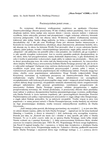 „Msza Święta” 4/2008, s. 12-13 oprac. ks. Jacek Staniek SChr, Duisburg (Niemcy) Pocieszycielem jesteś zwan… Po wytężonej 40-dniowej wielkopostnej wędrówce na spotkanie Chrystusa Zmartwychwstałego obecnie przeżywamy 50 dni wielkiej radości paschalnej. Jest to swoista eksplozja nadziei, która nadaje sens naszym dniom i nocom, naszym małym i większym wysiłkom, która uskrzydla, przenosi nad przepaściami i ciągle wskazuje właściwy kierunek życiowej pielgrzymki. Cały ten obecny okres 50-dniowej radości wielkanocnej możemy traktować jako jedną, bardzo długą nadzielę, na którą z utęsknieniem oczekiwaliśmy – i doczekaliśmy się! I tak jak czas Wielkiego Postu jest okresem bardzo intensywnym w Kościele (te wszystkie nabożeństwa, rekolekcje, akcje charytatywne, płomienne homilie, itd.), tak okazuje się, że okres, ku któremu Wielki Post prowadzi, choć w swym założeniu bardzo radosny, pełen pokoju, światła i chrześcijańskiego optymizmu, nagle jakby stawał się dla nas „kłopotem”, tak jakbyśmy nie potrafili sobie z nim poradzić, nie wiedzieli, jak go wypełnić i w jaki sposób rozsądnie wykorzystać. Jest to swoisty paradoks praktyki duszpasterskiej, że oto okres, który był przygotowaniem, mamy doskonale dopracowany, a gdy dochodzimy do celu (i trzeba to pastoralnie wykorzystać), nagle jakby to zadanie nas przerastało… Może jest to dosyć prowokacyjna teza, ale warto nad nią intensywniej się zastanowić, by rzeczywiście okres między Wielką Nocą a uroczystością Zesłania Ducha Świętego przeżyć tak, jak on na to w całej pełni zasługuje! Zachęcam więc zarówno duchownych, jak i świeckich, by wspólnym wysiłkiem wyjść poza ramy wieloletnich przyzwyczajeń i pomóc sobie i innym w wartościowym przeżyciu okresu pięćdziesięciu dni wielkanocnej radości. Pomysły mogą być różne, choćby coraz popularniejsze nabożeństwo Drogi Światła (odpowiednik Drogi Krzyżowej; rozważane są wydarzenia począwszy od zmartwychwstania Pana Jezusa), rozbudowana wigilia Zielonych Świąt, adoracje młodzieżowe (ze szczególnym uwzględnieniem osób kończących poszczególne etapy nauki i stojących przed trudną decyzją wyboru dalszej drogi życiowej), uwypuklenie tematyki ekumenicznej (może zorganizowanie jakiegoś nabożeństwa albo procesji gwiaździstej), rzetelniejsze przygotowanie do uroczystości Zesłania Ducha Świętego (poprzez solidnie przygotowaną i mądrze przeprowadzoną nowennę), itd. Jestem przekonany, iż przeżywany obecnie okres paschalny musi nabrać w praktyce duszpasterskiej bardziej pneumatologicznego wymiaru, podkreślając rolę Ducha Prawdy w życiu zarówno wspólnoty, jak i poszczególnych chrześcijan. Przecież Pięćdziesiątnica jest jedną z najważniejszych uroczystości w ciągu całego roku liturgicznego, a ciągle jakoś brakuje pomysłów, by ją należycie uwypuklić. Trzeba więcej (a przy tym poprawnie i w miarę prosto) mówić o Duchu Przenajświętszym, trzeba bardziej się otwierać na Jego przemieniające działanie, trzeba wreszcie zintensyfikować modlitwę do Ducha Ożywiciela… „Jeśli istnieje jeden powód, dla którego powinniśmy się wstydzić […], to jest nim fakt, że całymi dniami żyjemy, jakby nie było Ducha Świętego” – napisał już sto lat temu kardynał Manning z Londynu, a słowa te (niestety!) i dziś zachowują swą szczególną wymowę. Prawda jest taka, że „Kościół nie może żyć i działać w inny sposób, jak tylko w Duchu Świętym. To co w pełni czasów stało się za sprawą Ducha Świętego, może tylko dzięki Niemu wyłonić się z pamięci Kościoła […], dalej urzeczywistniać Królestwo Boże, działać ożywczo we wnętrzu człowieka (por. TMA 44, 45). Wspominając 50-lecie swego kapłaństwa, Jan Paweł II napisał książkę Dar i tajemnica, w której daje świadectwo o działaniu Ducha Świętego w swoim życiu. Przypominając naukę św. Tomasza z Akwinu, podkreślił znaczenie darów Ducha Świętego i zacytował słowa tego wielkiego teologa: […] z pomocą darów Ducha Świętego cały duchowy organizm człowieka zostaje uwrażliwiony na światło Boże, na światło poznania, a także na natchnienia miłości. Dalej pisze: Modlitwa o dary Ducha Świętego towarzyszyła mi od wczesnej młodości i w dalszym ciągu jestem jej wierny. Jak ważny był to rys pobożności w codziennej modlitwie Papieża, świadczył fakt, że o początkach swego nabożeństwa do Ducha Świętego wspominał również w książce Przekroczyć próg nadziei. Papież tak pisze: […] Pamiętam, że ojciec dał mi kiedyś książeczkę do nabożeństwa, w której była modlitwa do Ducha Świętego. Powiedział mi, abym tę modlitwę codziennie odmawiał. Tak też staram się zawsze czynić. Wtedy po raz pierwszy zrozumiałem, co znaczą słowa Chrystusa do Samarytanki o prawdziwych czcicielach Boga, to znaczy tych, którzy czczą Go w Duchu i Prawdzie. Przykład Papieża Jana Pawła II kieruje nasze myśli w stronę Wieczernika, gdzie Kościół oczekuje, przyzywa i otrzymuje Ducha Pocieszyciela, którego misją jest bezpieczne przeprowadzenie Kościoła do Królestwa Bożego” (Koronka ku czci Ducha Świętego i Jego siedmiu darów). W encyklice Dominus et Vivificantem bardzo mocno została uwypuklona prawda, iż Duch Święty nie przestaje być Stróżem nadziei w sercu człowieka: Dlatego też sekwencja liturgiczna woła: Bez Twojego tchnienia cóż jest wśród stworzenia? Jeno cierń i nędze. On dokonuje dzieła oczyszczenia z wszystkiego, co człowieka szpeci, z tego, co jest trudne; On leczy najgłębsze nawet rany ludzkiej egzystencji. On zamienia wewnętrzny nieurodzaj dusz w urodzajne pola łaski i świętości. To, co jest oporne – nakłania, to, ci jest oziębłe – rozgrzewa, to, co zbłąkane – sprowadza na drogi zbawienia (por. nr 67). Jakżeż znamiennie brzmią w kontekście naszych rozważań słowa jednego