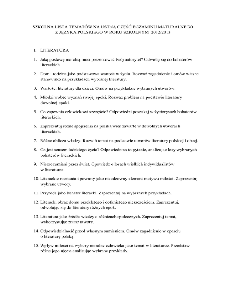 szkolna lista tematów na ustną część egzaminu maturalnego z