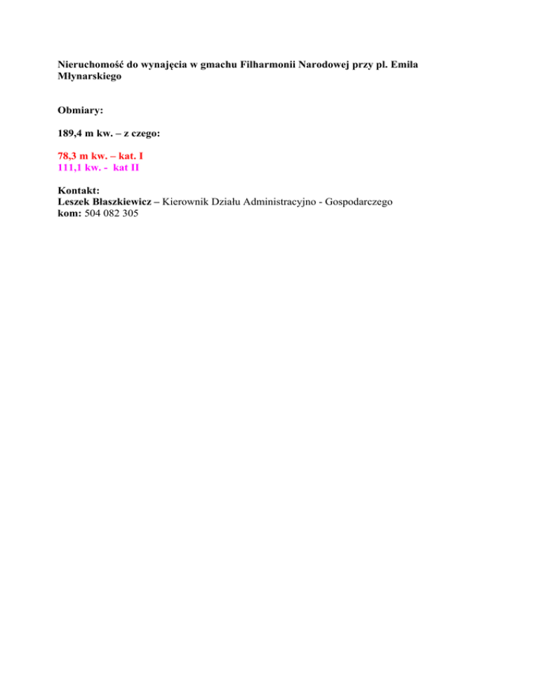 Nieruchomość do wynajęcia w gmachu Filharmonii Narodowej przy pl. Emila Młynarskiego Obmiary: 189,4 m kw. – z czego: 78,3 m kw. – kat. I 111,1 kw. - kat II Kontakt: Leszek Błaszkiewicz – Kierownik Działu Administracyjno - Gospodarczego kom: 504 082 305