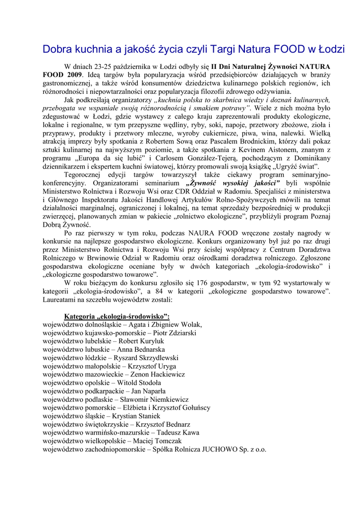 Dobra kuchnia a jakość Ŝycia czyli Targi Natura FOOD w Łodzi W dniach 23-25 października w Łodzi odbyły się II Dni Naturalnej śywności NATURA FOOD 2009. Ideą targów była popularyzacja wśród przedsiębiorców działających w branŜy gastronomicznej, a takŜe wśród konsumentów dziedzictwa kulinarnego polskich regionów, ich róŜnorodności i niepowtarzalności oraz popularyzacja filozofii zdrowego odŜywiania. Jak podkreślają organizatorzy „kuchnia polska to skarbnica wiedzy i doznań kulinarnych, przebogata we wspaniałe swoją róŜnorodnością i smakiem potrawy”. Wiele z nich moŜna było zdegustować w Łodzi, gdzie wystawcy z całego kraju zaprezentowali produkty ekologiczne, lokalne i regionalne, w tym przepyszne wędliny, ryby, soki, napoje, przetwory zboŜowe, zioła i przyprawy, produkty i przetwory mleczne, wyroby cukiernicze, piwa, wina, nalewki. Wielką atrakcją imprezy były spotkania z Robertem Sową oraz Pascalem Brodnickim, którzy dali pokaz sztuki kulinarnej na najwyŜszym poziomie, a takŜe spotkania z Kevinem Aistonem, znanym z programu „Europa da się lubić” i Carlosem González-Tejerą, pochodzącym z Dominikany dziennikarzem i ekspertem kuchni światowej, którzy promowali swoją ksiąŜkę „Ugryźć świat”. Tegorocznej edycji targów towarzyszył takŜe ciekawy program seminaryjnokonferencyjny. Organizatorami seminarium „śywność wysokiej jakości” byli wspólnie Ministerstwo Rolnictwa i Rozwoju Wsi oraz CDR Oddział w Radomiu. Specjaliści z ministerstwa i Głównego Inspektoratu Jakości Handlowej Artykułów Rolno-SpoŜywczych mówili na temat działalności marginalnej, ograniczonej i lokalnej, na temat sprzedaŜy bezpośredniej w produkcji zwierzęcej, planowanych zmian w pakiecie „rolnictwo ekologiczne”, przybliŜyli program Poznaj Dobrą śywność. Po raz pierwszy w tym roku, podczas NAURA FOOD wręczone zostały nagrody w konkursie na najlepsze gospodarstwo ekologiczne. Konkurs organizowany był juŜ po raz drugi przez Ministerstwo Rolnictwa i Rozwoju Wsi przy ścisłej współpracy z Centrum Doradztwa Rolniczego w Brwinowie Odział w Radomiu oraz ośrodkami doradztwa rolniczego. Zgłoszone gospodarstwa ekologiczne oceniane były w dwóch kategoriach „ekologia-środowisko” i „ekologiczne gospodarstwo towarowe”. W roku bieŜącym do konkursu zgłosiło się 176 gospodarstw, w tym 92 wystartowały w kategorii „ekologia-środowisko”, a 84 w kategorii „ekologiczne gospodarstwo towarowe”. Laureatami na szczeblu województw zostali: Kategoria „ekologia-środowisko”: województwo dolnośląskie – Agata i Zbigniew Wolak, województwo kujawsko-pomorskie – Piotr Zdziarski województwo lubelskie – Robert Kuryluk województwo lubuskie – Anna Bednarska województwo łódzkie – Ryszard Skrzydlewski województwo małopolskie – Krzysztof Uryga województwo mazowieckie – Zenon Hackiewicz województwo opolskie – Witold Stodoła województwo podkarpackie – Jan Naparła województwo podlaskie – Sławomir Niemkiewicz województwo pomorskie – ElŜbieta i Krzysztof Gołuńscy województwo śląskie – Krystian Staniek województwo świętokrzyskie – Krzysztof Bednarz województwo warmińsko-mazurskie – Tadeusz Kawa województwo wielkopolskie – Maciej Tomczak województwo zachodniopomorskie – Spółka Rolnicza JUCHOWO Sp. z o.o. Kategoria „ekologiczne gospodarstwo towarowe” województwo dolnośląskie – Anna i Mirosław Lech województwo kujawsko-pomorskie – Radosław Gawinecki województwo lubelskie – Tadeusz Kowalik województwo lubuskie – Anna Kuziemska województwo łódzkie – Wojciech Piasecki województwo małopolskie – Anna i Adam Susek województwo mazowieckie – Ewa Smuk Stratenwerth województwo opolskie – Tadeusz Januszewski województwo podkarpackie – Marek Kruk województwo podlaskie – Alina Romaniuk województwo pomorskie – Jacek Plotta województwo śląskie – Gospodarstwo Jaworze ZDIZ Grodziec Śląski województwo świętokrzyskie – Krzysztof Król województwo warmińsko-mazurskie – Alfred Wencławski województwo wielkopolskie – Tomasz Kupaj województwo zachodniopomorskie – Lidia Ordysińska Zwycięzcy z poszczególnych województw wzięli udział w finale krajowym. Laureatami w kategorii „ekologia środowisko” zostali: I miejsce – Krzysztof Bednarz II miejsce – Piotr Zdziarski III miejsce – Jan Naparła Laureatami w kategorii „ekologiczne gospodarstwo towarowe” zostali: I miejsce – Alfred Wencławski II miejsce – Wojciech Piasecki III miejsce – Jacek Plotta wyróŜnienie – Ewa Smuk Stratenwerth wyróŜnienie – Lidia Ordysińska Krzysztof Bednarz prowadzi gospodarstwo o powierzchni blisko 15 ha, ukierunkowane głównie na produkcję warzyw gruntowych i ziół (dynia zwyczajna, burak ćwikłowy, kapusta, rabarbar, por, koper ogrodowy, lebiodka, pietruszka naciowa), z przeznaczeniem na rynek krajowy i zagraniczny. W gospodarstwie prowadzony jest teŜ wielogatunkowy chów zwierząt. Działają dwa kolektory słoneczne, a do zwalczania chwastów w uprawach rolnik wykorzystuje wypalacz płomieniowy własnej konstrukcji. Alfred Wencławski prowadzi gospodarstwo rolne o powierzchni 372 ha, w tym uŜytków rolnych jest 351 ha. Cała produkcja roślinna ma charakter towarowej produkcji nasiennej, a w gospodarstwie uprawia się głównie pszenicę ozimą, orkisz i Ŝyto, z roślin strączkowych łubin słodki i groch. W strukturze upraw jest teŜ ponad 100 ha koniczyny czerwonej i 41 ha traw nasiennych. Gospodarstwo jest wyposaŜone w wydajną suszarnię dwukomorową na paliwo stałe, czyszczalnie oraz zmechanizowaną baterię silosów o łącznej pojemności 3200 ton. Głównym rynkiem zbytu są Niemcy i Holandia gdzie trafia 80% produkcji z gospodarstwa. Podczas targów uhonorowano takŜe laureatów dwóch innych konkursów zorganizowanych przez MRiRW. Były to konkursy na najlepszą pracę magisterską/doktoranck