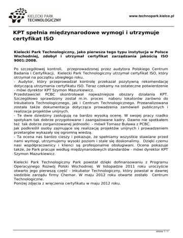 www.technopark.kielce.pl KPT spełnia międzynarodowe wymogi i utrzymuje certyfikat ISO Kielecki Park Technologiczny, jako pierwsza tego typu instytucja w Polsce Wschodniej, zdobył i utrzymał certyfikat zarządzania jakością ISO 9001:2008. Po szczegółowej kontroli, przeprowadzonej przez audytora Polskiego Centrum Badania i Certyfikacji, Kielecki Park Technologiczny utrzymał certyfikat ISO, który otrzymał na początku ubiegłego roku. - Audytor, który przeprowadzał kontrolę przekazał pozytywną rekomendację dotyczącą utrzymania certyfikatu ISO. Teraz czekamy na ostateczne potwierdzenie - mówi dyrektor KPT Szymon Mazurkiewicz. Przedstawiciel PCBC skontrolował najważniejsze obszary działania KPT. Szczegółowo sprawdzony został m.in. proces naboru lokatorów zarówno do Inkubatora Technologicznego, jak i Centrum Technologicznego. Przeanalizowana została także dokumentacja dotycząca prowadzenia zamówień publicznych i realizacja projektów unijnych. - Te dwie dziedziny zasługują na bardzo wysoką ocenę. W swojej pracy rzadko spotykam tak dobrze przygotowane i zaangażowane kadry. Dawno nie spotkałem też tak dobrze zorganizowanej jednostki - mówił Tomasz Buława z PCBC. Jak podkreślił osoby zajmujące się realizację projektów unijnych i prowadzeniem przetargów wykazały się ogromną wiedzą. - Ta ocena nas bardzo cieszy i pokazuje, że spełniamy wszystkie stawiane przed nami wymogi, utrzymujemy wysoki poziom i stale się doskonalimy. Dzięki czemu nasi współpracownicy i klienci są profesjonalnie obsługiwani. Ocena pokazuje także, że Park pracuje według międzynarodowych standardów - mówi dyrektor KPT Szymon Mazurkiewicz. Kielecki Park Technologiczny Park powstał dzięki dofinansowaniu z Programu Operacyjnego Rozwój Polski Wschodniej. W listopadzie 2011 roku uroczyście otwarto jego pierwszą część - Inkubator Technologiczny, który powstał w dawnej siedzibie zarządu firmy Chemar. W maju 2012 roku otwarte zostało Centrum Technologiczne. Poniżej zdjęcia z wręczenia certyfikatu w maju 2012 roku. strona 1 / 1 Powered by TCPDF (www.tcpdf.org)