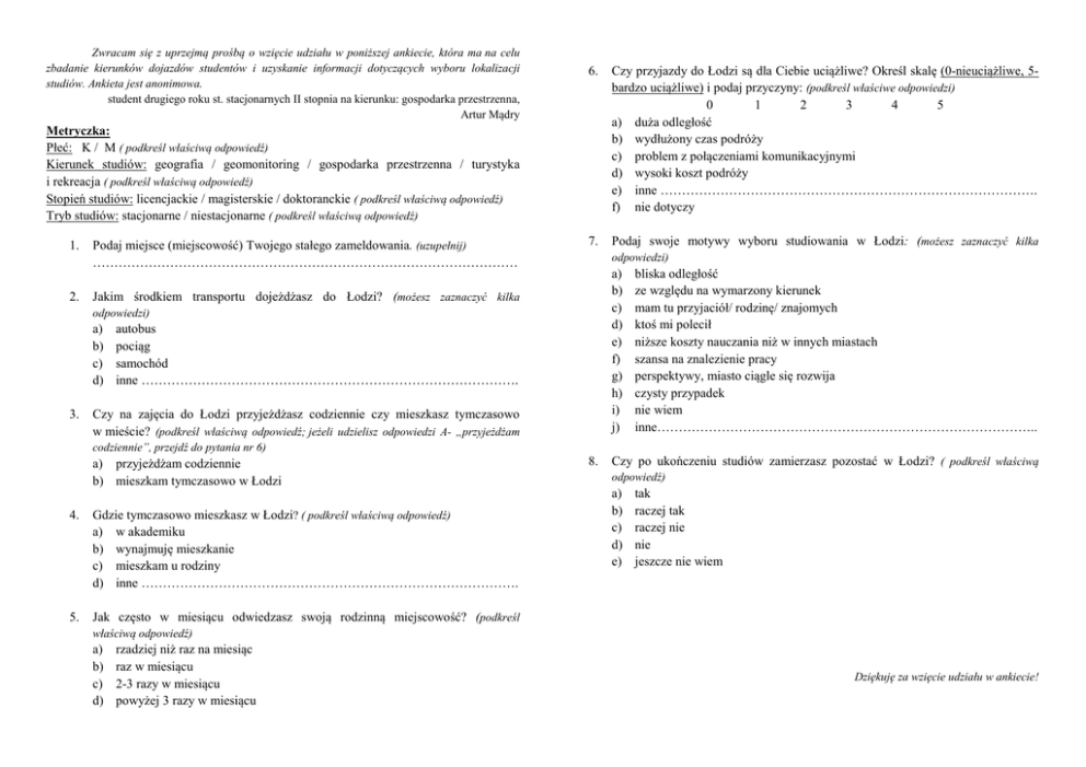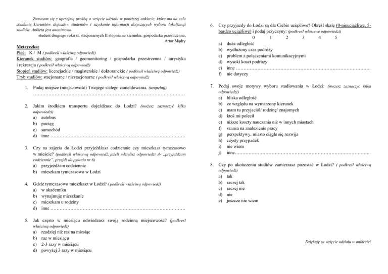 Zwracam się z uprzejmą prośbą o wzięcie udziału w poniższej ankiecie, która ma na celu zbadanie kierunków dojazdów studentów i uzyskanie informacji dotyczących wyboru lokalizacji studiów. Ankieta jest anonimowa. student drugiego roku st. stacjonarnych II stopnia na kierunku: gospodarka przestrzenna, Artur Mądry 6. Czy przyjazdy do Łodzi są dla Ciebie uciążliwe? Określ skalę (0-nieuciążliwe, 5bardzo uciążliwe) i podaj przyczyny: (podkreśl właściwe odpowiedzi) 0 1 2 3 4 5 a) duża odległość b) wydłużony czas podróży c) problem z połączeniami komunikacyjnymi d) wysoki koszt podróży e) inne ……………………………………………………………………………. f) nie dotyczy 7. Podaj swoje motywy wyboru studiowania w Łodzi: (możesz zaznaczyć kilka Metryczka: Płeć: K / M ( podkreśl właściwą odpowiedź) Kierunek studiów: geografia / geomonitoring / gospodarka przestrzenna / turystyka i rekreacja ( podkreśl właściwą odpowiedź) Stopień studiów: licencjackie / magisterskie / doktoranckie ( podkreśl właściwą odpowiedź) Tryb studiów: stacjonarne / niestacjonarne ( podkreśl właściwą odpowiedź) 1. 2. Podaj miejsce (miejscowość) Twojego stałego zameldowania. (uzupełnij) ……………………………………………………………………………………… odpowiedzi) a) b) c) d) e) f) g) h) i) j) Jakim środkiem transportu dojeżdżasz do Łodzi? (możesz zaznaczyć kilka odpowiedzi) a) b) c) d) 3. autobus pociąg samochód inne ……………………………………………………………………………. Czy na zajęcia do Łodzi przyjeżdżasz codziennie czy mieszkasz tymczasowo w mieście? (podkreśl właściwą odpowiedź; jeżeli udzielisz odpowiedzi A- „przyjeżdżam bliska odległość ze względu na wymarzony kierunek mam tu przyjaciół/ rodzinę/ znajomych ktoś mi polecił niższe koszty nauczania niż w innych miastach szansa na znalezienie pracy perspektywy, miasto ciągle się rozwija czysty przypadek nie wiem inne…………………………………………………………………………….. codziennie”, przejdź do pytania nr 6) a) przyjeżdżam codziennie b) mieszkam tymczasowo w Łodzi 4. Gdzie tymczasowo mieszkasz w Łodzi? ( podkreśl właściwą odpowiedź) a) w akademiku b) wynajmuję mieszkanie c) mieszkam u rodziny d) inne ……………………………………………………………………………. 5. Jak często w miesiącu odwiedzasz swoją rodzinną miejscowość? (podkreśl 8. Czy po ukończeniu studiów zamierzasz pozostać w Łodzi? ( podkreśl właściwą odpowiedź) a) b) c) d) e) tak raczej tak raczej nie nie jeszcze nie wiem właściwą odpowiedź) a) b) c) d) rzadziej niż raz na miesiąc raz w miesiącu 2-3 razy w miesiącu powyżej 3 razy w miesiącu Dziękuję za wzięcie udziału w ankiecie!