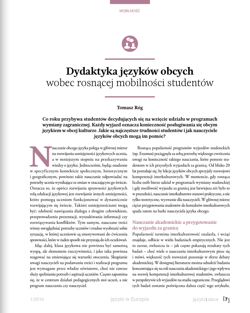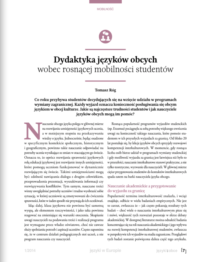 mobilność Dydaktyka języków obcych wobec rosnącej mobilności studentów Tomasz Róg Co roku przybywa studentów decydujących się na wzięcie udziału w programach wymiany zagranicznej. Każdy wyjazd oznacza konieczność posługiwania się obcym językiem w obcej kulturze. Jakie są najczęstsze trudności studentów i jak nauczyciele języków obcych mogą im pomóc? N auczanie obcego języka polega w głównej mierze na rozwijaniu umiejętności językowych ucznia, a w mniejszym stopniu na przekazywaniu wiedzy o języku. Jednocześnie, będąc osadzone w specyficznym kontekście społecznym, historycznym i geograficznym, powinno takie nauczanie odpowiadać na potrzeby ucznia wynikające ze zmian w otaczającym go świecie. Oznacza to, że oprócz rozwijania sprawności językowych rolą edukacji językowej jest rozwijanie innych umiejętności, które pomogą uczniom funkcjonować w dynamicznie rozwijającym się świecie. Takimi umiejętnościami mogą być: zdolność nawiązania dialogu z drugim człowiekiem, przeprowadzenia prezentacji, wyszukiwania informacji czy rozwiązywania konfliktów. Tym samym, nauczane treści winny uwzględniać potrzeby uczniów i trudno wyobrazić sobie sytuację, w której uczniowie są zmotywowani do ćwiczenia sprawności, które w żaden sposób nie przystają do ich oczekiwań. Idąc dalej, klasa językowa nie powinna być samotną wyspą, ale elementem rzeczywistości, i jako taka powinna reagować na zmieniające się warunki otoczenia. Skupianie uwagi nauczycieli na podawaniu treści i realizacji programu jest wymagane przez władze oświatowe, choć nie zawsze służy spełnianiu potrzeb i aspiracji uczniów. Często zapomina się, że w centrum działań pedagogicznych stoi uczeń, a nie program nauczania czy nauczyciel. 1/2014 Rosnąca popularność programów wyjazdów studenckich (np. Erasmus) pociągnęła za sobą potrzebę większego zwrócenia uwagi na konieczność takiego nauczania, które pomoże studentom w ich przyszłych wyjazdach za granicę. Od blisko 20 lat postuluje się, by lekcje języków obcych sprzyjały rozwojowi kompetencji interkulturowych. W momencie, gdy rosnąca liczba osób bierze udział w programach wymiany studenckiej i gdy możliwość wyjazdu za granicę jest łatwiejsza niż było to w przeszłości, nauczanie interkulturowe stanowi praktyczne, a nie tylko teoretyczne, wyzwanie dla nauczycieli. W głównej mierze ciężar przygotowania studentów do kontaktów interkulturowych spada zatem na barki nauczyciela języka obcego. Nauczanie akademickie a przygotowanie do wyjazdu za granicę Popularność terminu interkulturowość znalazła, i wciąż znajduje, odbicie w wielu badaniach empirycznych. Nie jest to zarzut, zwłaszcza że – jak często pokazują rezultaty tych badań – choć wiele o nauczaniu interkulturowym pisze się i mówi, większość tych rozważań pozostaje w sferze debaty akademickiej. W dostępnej literaturze można odnaleźć badania koncentrujące się na roli nauczania akademickiego i jego wpływu na rozwój kompetencji interkulturowej studentów, zwłaszcza w perspektywie ich wyjazdów na studia zagraniczne. Przeglądowi tych badań zostanie poświęcona dalsza część tego artykułu. języki w Europie [ 7 ] mobilność Badanie Kuriaty z 2002 r. było poświęcone analizie wyjazdów studentów do zagranicznych ośrodków uniwersyteckich i rozwojowi ich kompetencji międzykulturowych. Zdaniem Kuriaty (2002:184), cały wysiłek wkładany w edukację interkulturową przyszłych nauczycieli języków obcych powinien się koncentrować na rozwijaniu umiejętności mediacji pomiędzy kulturami. Interkulturowa kompetencja nauczycieli powinna mieć, według autora, dwojaką naturę: osobistą i zawodową. Sukcesem takiego nauczyciela będzie rozwijanie otwartości i kreatywności swoich uczniów wobec kontaktów z obcymi kulturami (2002:186). Klak i Martin (2003) zbadali wpływ edukacji i treningów interkulturowych oraz wyjazdów na stypendia zagraniczne na rozwój wrażliwości międzykulturowej studentów. W swoim badaniu obserwowali stosunek studentów pierwszego i drugiego roku geografii do obcych kultur przed wyjazdem i po powrocie ze stypendiów zagranicznych. Jak dowiedli, zaangażowanie uczelni w trening interkulturowy znajduje odzwierciedlenie w większej świadomości studentów, którzy okazali się bardziej otwarci na różnice i bardziej doceniali obce kultury. Innym badaniem mającym na celu przyjrzenie się wrażliwości interkulturowej studentów było badanie Straffona z 2003 r. Jego wyniki dobitnie pokazały, że doświadczenie życia w obcym kraju rozwija interkulturową kompetencję komunikacyjną. Straffon dodatkowo udowodnił, że istnieje zależność pomiędzy treningiem interkulturowym na uczelni macierzystej a rozwojem umiejętności interkulturowych. Studenci, którzy odbyli taki trening, uzyskiwali lepsze wyniki w testach badających sprawności międzykulturowe. O rozwijaniu kompetencji interkulturowej przyszłych nauczycieli języka niemieckiego pisze Adamczak-Krysztofowicz (2004). Celem jej badań było stworzenie modelu kształcenia językowego i kulturowego na poziomie akademickim, uwzględniającego wykorzystanie materiałów autentycznych. Jak się okazuje, większość zajęć językowych koncentruje się na osobie nauczyciela, nie studenta. Nie ma zatem miejsca na potrzeby ucznia, a tym samym nie ma mowy o przygotowaniu go do funkcjonowania w środowisku obcym kulturowo. W podobnym duchu wypowiada się Błażek (2008), która badała, w jaki sposób polskie uczelnie wdrażają nauczanie interkulturowe, ze szczególnym uwzględnieniem kształcenia nauczycieli języków obcych. Te same wnioski przynosi badanie Żebrowskiej (2008), w którym autorka wskazuje na konieczność edukacji interkulturowej przyszłych nauczycieli języka rosyjskiego. [ 8 ] Celem badania Van Hoof i Verbeeten (2005) było porównanie opinii studentów odnośnie do programó