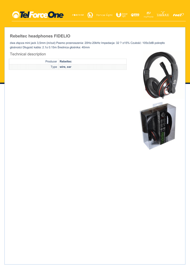 Rebeltec headphones FIDELIO dwa złącza mini jack 3,5mm (in/out) Pasmo przenoszenia: 20Hz-20kHz Impedacja: 32 ? ±15% Czułość: 105±3dB pokrętło głośności Długość kabla: 2.1± 0.15m Średnica głośnika: 40mm Technical description Producer Rebeltec Type wire, ear