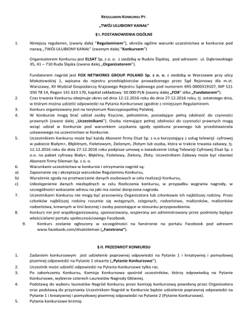 REGULAMIN KONKURSU PT. „TWÓJ ULUBIONY KANAŁ” § I. POSTANOWIENIA OGÓLNE 1. Niniejszy regulamin, (zwany dalej “Regulaminem”), określa ogólne warunki uczestnictwa w konkursie pod nazwą „TWÓJ ULUBIONY KANAŁ” (zwanym dalej “Konkursem”) Organizatorem Konkursu jest ELSAT Sp. z o. o. z siedzibą w Rudzie Śląskiej, pod adresem: ul. Dąbrowskiego 35, 41 – 710 Ruda Śląska (zwana dalej „Organizatorem”). 2. 3. 4. 5. 6. a) b) c) 7. 8. Fundatorem nagród jest FOX NETWORKS GROUP POLAND Sp. z o. o. z siedzibą w Warszawie przy ulicy Mokotowskiej 1, wpisana do rejestru przedsiębiorców prowadzonego przez Sąd Rejonowy dla m.st. Warszawy, XII Wydział Gospodarczy Krajowego Rejestru Sądowego pod numerem KRS 0000319107, NIP 521 350 78 14, Regon 141 623 170, kapitał zakładowy: 50 000 PLN (zwany dalej „FOX” albo „Fundatorem”). Czas trwania Konkursu obejmuje okres od dnia 12.12.2016 roku do dnia 27.12.2016 roku, tj. ostatniego dnia, w którym można udzielić odpowiedzi na Pytania Konkursowe zgodnie z niniejszym Regulaminem. Konkurs organizowany jest na terytorium Rzeczypospolitej Polskiej. W Konkursie mogą brać udział osoby fizyczne, pełnoletnie, posiadające pełną zdolność do czynności prawnych (zwane dalej „Uczestnikami”). Osoby niemające pełnej zdolności do czynności prawnych mogą wziąć udział w Konkursie pod warunkiem uzyskania zgody opiekuna prawnego lub przedstawiciela ustawowego na uczestnictwo w Konkursie. Uczestnikiem Konkursu może być każdy Abonent firmy Elsat Sp. z o.o korzystający z usług telewizji cyfrowej w pakiecie Białym+, Błękitnym, Fioletowym, Zielonym, Złotym lub osoba, która w trakcie trwania zabawy, tj. 12.12.2016 roku do dnia 27.12.2016 roku podpisze umowę o świadczenie Usług Telewizji Cyfrowej Elsat Sp. z o.o. na pakiet cyfrowy Biały+, Błękitny, Fioletowy, Zielony, Złoty. Uczestnikiem Zabawy może być również Abonent firmy Sileman Sp. z o. o. Warunkami uczestnictwa w konkursie i otrzymania nagród są: Zapoznanie się i akceptacja warunków Regulaminu Konkursu, Wyrażenie zgody na przetwarzanie danych osobowych w celu realizacji Konkursu, Udostępnienie danych niezbędnych w celu Rozliczenia konkursu, w przypadku wygrania nagrody, w szczególności wskazanie adresu na jaki ma zostać doręczona nagroda. Uczestnikami Konkursu nie mogą być pracownicy Organizatora lub członkowie ich najbliższej rodziny. Przez członków najbliższej rodziny rozumie się wstępnych, zstępnych, rodzeństwo, małżonków, małżonków rodzeństwa, krewnych w linii bocznej i osoby pozostające w stosunku przysposobienia. Konkurs nie jest współorganizowany, sponsorowany, wspierany ani administrowany przez podmioty będące właścicielami portalu społecznościowego Facebook. 9. Konkurs zostanie ogłoszony w szczególności na fanstronie na portalu Facebook pod adresem www.facebook.com/elsatsileman („Fanstrona”). § II. PRZEDMIOT KONKURSU 1. 2. 3. 4. 5. Zadaniem konkursowym jest udzielenie poprawnej odpowiedzi na Pytanie 1 i kreatywnej i pomysłowej pisemnej odpowiedzi na Pytanie 2 otwarte („Pytanie Konkursowe”). Uczestnik może udzielić odpowiedzi na Pytania Konkursowe tylko raz. Po zakończeniu Konkursu, Komisja Konkursowa spośród uczestników, którzy odpowiedzą na Pytanie Konkursowe, wybierze czterech Laureatów Nagrody Głównej. Podstawą do wyboru laureatów Nagród Konkursu przez komisję konkursową powołaną przez Organizatora oraz podstawą do przyznania Uczestnikom Nagród w Konkursie będzie udzielenie poprawnej odpowiedzi na Pytanie 1 i kreatywnej i pomysłowej pisemnej odpowiedzi na Pytanie 2 (Pytanie Konkursowe). Pytania konkursowe brzmią: 1. Na którym kanale można oglądać premierowe odcinki serialu „Współczesna rodzina”? A) FOX Comedy B) FOX C) Nat Geo Wild 2. Który z programów prezentowanych na National Geographic jest Twoim ulubionym? Odpowiedź uzasadnij. (max. 500 znaków) § III. ZASADY UCZESTNICTWA W KONKURSIE 1. 2. 3. 4. 5. 6. Do Konkursu zostaną zakwalifikowane wyłącznie odpowiedzi na Pytanie Konkursowe umieszczone w komentarzu pod postem konkursowym na Fanstronie. Zamieszczenie odpowiedzi na Pytanie Konkursowe zgodnie z pkt. 1 powyżej, oznacza wyrażenie zgody na udział w Konkursie przez Uczestnika w szczególności zgodę na warunki Regulaminu. Podawanie danych osobowych przez Uczestnika jest dobrowolne. Warunkiem wydania nagrody jest przekazanie przez zwycięzcę do Organizatora informacji niezbędnych do wypełnienia obowiązków podatkowych przez Fundatora, tj. w szczególności imię i nazwisko, adres zamieszkania, PESEL oraz wskazać adres, na który ma zostać wysłana Nagroda oraz nr telefonu kontaktowego. Każdy z uczestników konkursu zobowiązany jest podać prawdziwe dane osobowe oraz zamieścić oświadczenie o wyrażeniu zgody Uczestnika Konkursu na przetwarzanie wyżej wymienionych danych osobowych na potrzeby Konkursu. Laureaci nagród w konkursie dodatkowo będą zobowiązani podać dane niezbędne do prawidłowego rozliczenia podatku dochodowego od nagrody. Wyłonienie laureatów Nagród Konkursowych nastąpi do 02.01.2017 roku. O wygranej decyduje Komisja Konkursowa. Wyniki Konkursu zostaną ogłoszone przez Komisję Konkursową na Stronie oraz poprzez wiadomość wysłaną przez Organizatora drogą elektroniczną na adresy e-mail podane przez Uczestników, na co każdy Uczestnik wyraża zgodę. § IV. KOMISJA KONKURSOWA 1. 2. a) b) c) d) e) f) 3. 4. Celem zapewnienia prawidłowej organizacji i przebiegu Konkursu, Organizator powoła Komisję Konkursową („Komisja Konkursowa”), w której skład wchodzą: a) Edyta Górska b) Kamila Sołdrowska c) Justyna Mura Do zadań Komisji Konkursowej należy czuwanie nad prawidłowym przebiegiem Konkursu, a w szczególności: ocena nadesłanych odpowiedzi, wyłonienie laureatów Konkursu i zapewnienie przyznania nagród, zabezpieczenie zgodności wyłonienia laureatów Konkursu oraz przyznania nagród z
