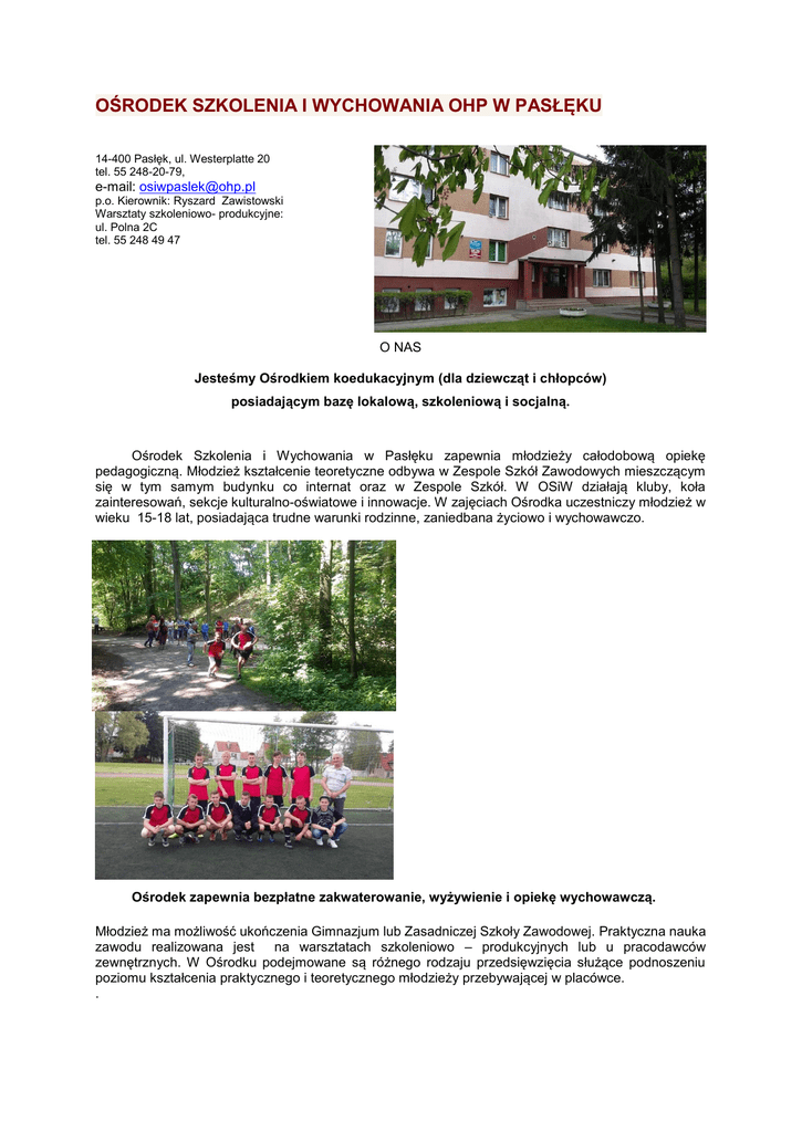 OŚRODEK SZKOLENIA I WYCHOWANIA OHP W PASŁĘKU 14-400 Pasłęk, ul. Westerplatte 20 tel. 55 248-20-79, e-mail: [email protected] p.o. Kierownik: Ryszard Zawistowski Warsztaty szkoleniowo- produkcyjne: ul. Polna 2C tel. 55 248 49 47 O NAS Jesteśmy Ośrodkiem koedukacyjnym (dla dziewcząt i chłopców) posiadającym bazę lokalową, szkoleniową i socjalną. Ośrodek Szkolenia i Wychowania w Pasłęku zapewnia młodzieży całodobową opiekę pedagogiczną. Młodzież kształcenie teoretyczne odbywa w Zespole Szkół Zawodowych mieszczącym się w tym samym budynku co internat oraz w Zespole Szkół. W OSiW działają kluby, koła zainteresowań, sekcje kulturalno-oświatowe i innowacje. W zajęciach Ośrodka uczestniczy młodzież w wieku 15-18 lat, posiadająca trudne warunki rodzinne, zaniedbana życiowo i wychowawczo. Ośrodek zapewnia bezpłatne zakwaterowanie, wyżywienie i opiekę wychowawczą. Młodzież ma możliwość ukończenia Gimnazjum lub Zasadniczej Szkoły Zawodowej. Praktyczna nauka zawodu realizowana jest na warsztatach szkoleniowo – produkcyjnych lub u pracodawców zewnętrznych. W Ośrodku podejmowane są różnego rodzaju przedsięwzięcia służące podnoszeniu poziomu kształcenia praktycznego i teoretycznego młodzieży przebywającej w placówce. . Obowiązek szkolny uczestnicy realizują w Zespole Szkół Zawodowych oraz Zespole Szkół w Pasłęku , gdzie funkcjonują dwa typy szkół: - Gimnazjum dla Dorosłych - Zasadnicza Szkoła Zawodowa OFERTA Ośrodek Szkolenia i Wychowania OHP 14-2 w Pasłęku jest placówką opiekuńczo-wychowawczą zorganizowaną w celu realizacji zadań ustawowych w zakresie: • Umożliwiania uczestnikom OHP uzupełnienia wykształcenia ogólnego oraz zdobycia kwalifikacji zawodowych; • Zapewnienia uczestnikom OHP całodobowej opieki wychowawczej oraz bezpłatnego zakwaterowania i wyżywienia; • Realizacji programów wychowawczych, profilaktycznych i resocjalizacyjnych z zakresu poradnictwa i doradztwa zawodowego; • Współdziałania z instytucjami i organizacjami lokalnymi oraz rodzicami i opiekunami prawnymi uczestników w procesie ich wychowania i kształcenia; • Organizowania imprez kulturalnych i sportowych oraz innych form spędzania czasu wolnego dla uczestników Ośrodka; • Prowadzenia warsztatów szkoleniowo – produkcyjnych, gdzie uczestnicy zdobywają kwalifikacje zawodowe; • Prowadzenie działalności opiekuńczo – wychowawczej mającej na celu przeciwdziałanie marginalizacji i wykluczeniu społecznemu młodzieży; • Współpraca z różnego rodzaju instytucjami i organizacjami w celu rozwiązywania problemów uczestników; • Organizacja pomocy psychologicznej i terapeutycznej dla młodzieży niedostosowanej społecznie, wchodzącej w konflikt z prawem; • Szeroki wachlarz imprez i przedsięwzięć kulturalno-oświatowych w celu aktywizacji uczestników oraz rozbudzenia w nich szeroko pojętej kultury osobistej; • Realizacja przedsięwzięć sportowo – rekreacyjnych i turystycznych zapewnia młodzieży rozwój własnych zainteresowań i odkrywanie nowych zdolności; • Przygotowanie młodzieży do aktywnego uczestnictwa w życiu społecznym oraz poruszania się po rynku pracy; pomoc w planowaniu kariery edukacyjnej i zawodowej. • Zapewnienie odpowiednich warunków do zdobycia wykształcenia i kwalifikacji zawodowych, umożliwienie wszechstronnego rozwoju oraz zdobycia nowych doświadczeń związanych z rynkiem pracy. KSZTAŁCENIE ZAWODOWE Ośrodek Szkolenia i Wychowania OHP 14-2 w Pasłęku proponuje dwie formy przygotowania zawodowego: Przyuczenie do wykonywania określonej pracy w ramach kształcenia w Gimnazjum dla Dorosłych w zawodach: - murarz - tynkarz - stolarz - kucharz małej gastronomii - mechanik pojazdów samochodowych - sprzedawca Nauka zawodu w ramach kształcenia w Zasadniczej Szkole Zawodowej w zawodach: - murarz - tynkarz - stolarz - fryzjer - cukiernik - sprzedawca Zatrudnienie i przygotowanie zawodowe uczestników OSiW OHP w Pasłęku odbywa się na podstawie indywidualnych umów zawartych pomiędzy pracodawcą, a uczestnikami na zasadach dotyczących pracowników młodocianych.