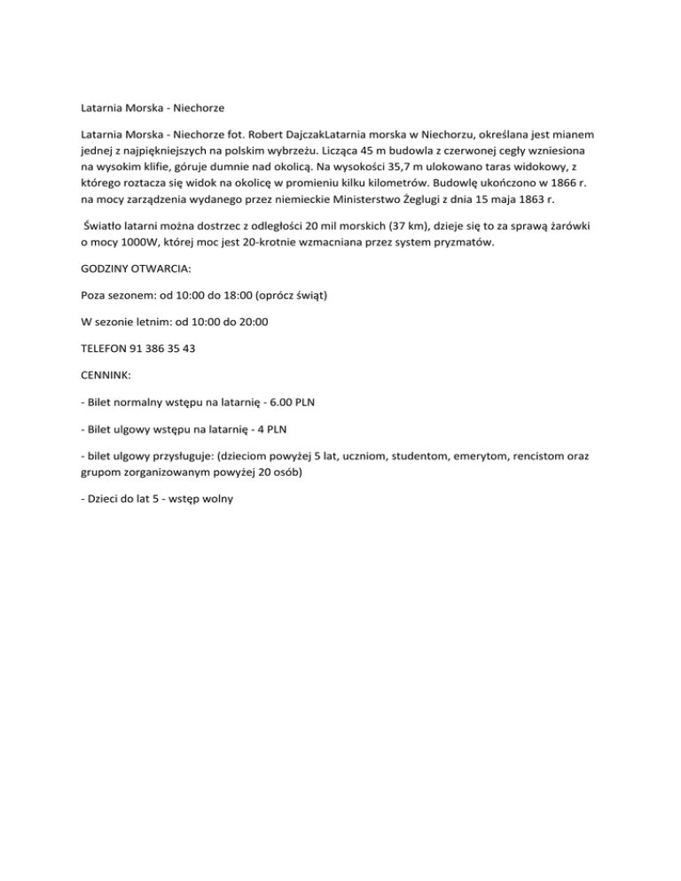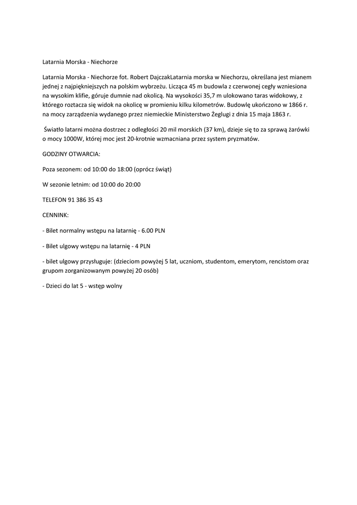 Latarnia Morska - Niechorze Latarnia Morska - Niechorze fot. Robert DajczakLatarnia morska w Niechorzu, określana jest mianem jednej z najpiękniejszych na polskim wybrzeżu. Licząca 45 m budowla z czerwonej cegły wzniesiona na wysokim klifie, góruje dumnie nad okolicą. Na wysokości 35,7 m ulokowano taras widokowy, z którego roztacza się widok na okolicę w promieniu kilku kilometrów. Budowlę ukończono w 1866 r. na mocy zarządzenia wydanego przez niemieckie Ministerstwo Żeglugi z dnia 15 maja 1863 r. Światło latarni można dostrzec z odległości 20 mil morskich (37 km), dzieje się to za sprawą żarówki o mocy 1000W, której moc jest 20-krotnie wzmacniana przez system pryzmatów. GODZINY OTWARCIA: Poza sezonem: od 10:00 do 18:00 (oprócz świąt) W sezonie letnim: od 10:00 do 20:00 TELEFON 91 386 35 43 CENNINK: - Bilet normalny wstępu na latarnię - 6.00 PLN - Bilet ulgowy wstępu na latarnię - 4 PLN - bilet ulgowy przysługuje: (dzieciom powyżej 5 lat, uczniom, studentom, emerytom, rencistom oraz grupom zorganizowanym powyżej 20 osób) - Dzieci do lat 5 - wstęp wolny