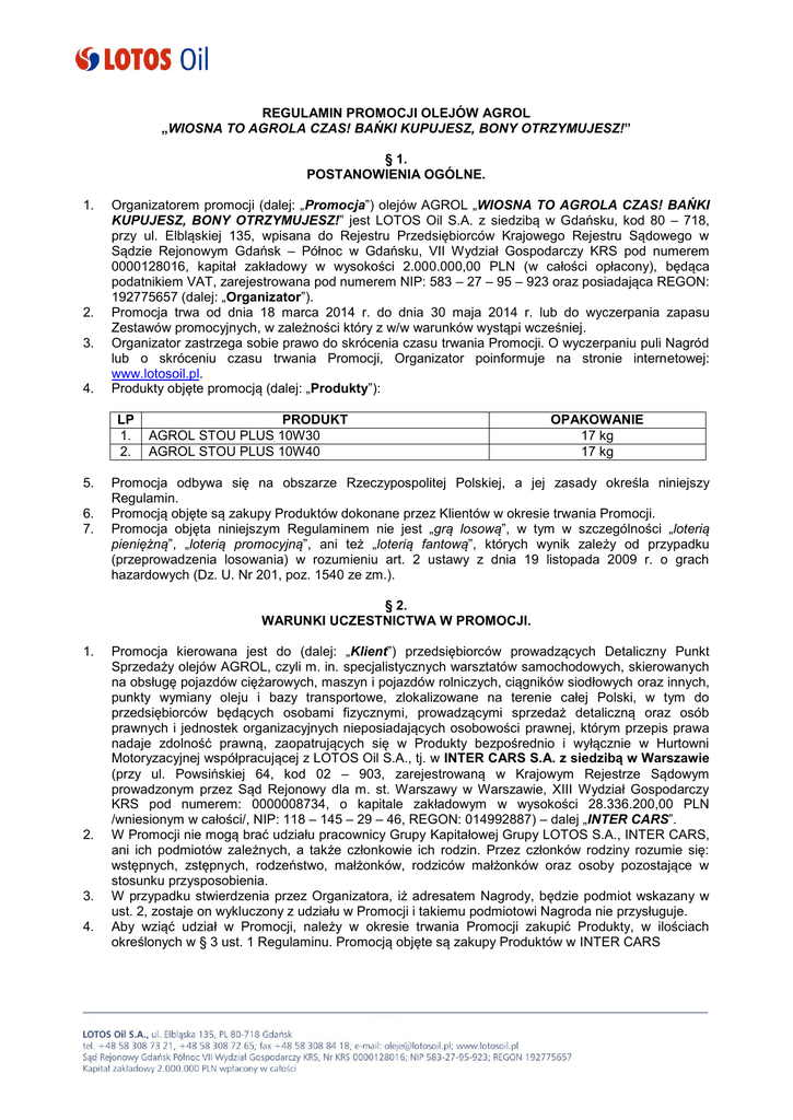 REGULAMIN PROMOCJI OLEJÓW AGROL „WIOSNA TO AGROLA CZAS! BAŃKI KUPUJESZ, BONY OTRZYMUJESZ!” § 1. POSTANOWIENIA OGÓLNE. 1. 2. 3. 4. Organizatorem promocji (dalej: „Promocja”) olejów AGROL „WIOSNA TO AGROLA CZAS! BAŃKI KUPUJESZ, BONY OTRZYMUJESZ!” jest LOTOS Oil S.A. z siedzibą w Gdańsku, kod 80 – 718, przy ul. Elbląskiej 135, wpisana do Rejestru Przedsiębiorców Krajowego Rejestru Sądowego w Sądzie Rejonowym Gdańsk – Północ w Gdańsku, VII Wydział Gospodarczy KRS pod numerem 0000128016, kapitał zakładowy w wysokości 2.000.000,00 PLN (w całości opłacony), będąca podatnikiem VAT, zarejestrowana pod numerem NIP: 583 – 27 – 95 – 923 oraz posiadająca REGON: 192775657 (dalej: „Organizator”). Promocja trwa od dnia 18 marca 2014 r. do dnia 30 maja 2014 r. lub do wyczerpania zapasu Zestawów promocyjnych, w zależności który z w/w warunków wystąpi wcześniej. Organizator zastrzega sobie prawo do skrócenia czasu trwania Promocji. O wyczerpaniu puli Nagród lub o skróceniu czasu trwania Promocji, Organizator poinformuje na stronie internetowej: www.lotosoil.pl. Produkty objęte promocją (dalej: „Produkty”): LP 1. 2. 5. 6. 7. PRODUKT AGROL STOU PLUS 10W30 AGROL STOU PLUS 10W40 OPAKOWANIE 17 kg 17 kg Promocja odbywa się na obszarze Rzeczypospolitej Polskiej, a jej zasady określa niniejszy Regulamin. Promocją objęte są zakupy Produktów dokonane przez Klientów w okresie trwania Promocji. Promocja objęta niniejszym Regulaminem nie jest „grą losową”, w tym w szczególności „loterią pieniężną”, „loterią promocyjną”, ani też „loterią fantową”, których wynik zależy od przypadku (przeprowadzenia losowania) w rozumieniu art. 2 ustawy z dnia 19 listopada 2009 r. o grach hazardowych (Dz. U. Nr 201, poz. 1540 ze zm.). § 2. WARUNKI UCZESTNICTWA W PROMOCJI. 1. 2. 3. 4. Promocja kierowana jest do (dalej: „Klient”) przedsiębiorców prowadzących Detaliczny Punkt Sprzedaży olejów AGROL, czyli m. in. specjalistycznych warsztatów samochodowych, skierowanych na obsługę pojazdów ciężarowych, maszyn i pojazdów rolniczych, ciągników siodłowych oraz innych, punkty wymiany oleju i bazy transportowe, zlokalizowane na terenie całej Polski, w tym do przedsiębiorców będących osobami fizycznymi, prowadzącymi sprzedaż detaliczną oraz osób prawnych i jednostek organizacyjnych nieposiadających osobowości prawnej, którym przepis prawa nadaje zdolność prawną, zaopatrujących się w Produkty bezpośrednio i wyłącznie w Hurtowni Motoryzacyjnej współpracującej z LOTOS Oil S.A., tj. w INTER CARS S.A. z siedzibą w Warszawie (przy ul. Powsińskiej 64, kod 02 – 903, zarejestrowaną w Krajowym Rejestrze Sądowym prowadzonym przez Sąd Rejonowy dla m. st. Warszawy w Warszawie, XIII Wydział Gospodarczy KRS pod numerem: 0000008734, o kapitale zakładowym w wysokości 28.336.200,00 PLN /wniesionym w całości/, NIP: 118 – 145 – 29 – 46, REGON: 014992887) – dalej „INTER CARS”. W Promocji nie mogą brać udziału pracownicy Grupy Kapitałowej Grupy LOTOS S.A., INTER CARS, ani ich podmiotów zależnych, a także członkowie ich rodzin. Przez członków rodziny rozumie się: wstępnych, zstępnych, rodzeństwo, małżonków, rodziców małżonków oraz osoby pozostające w stosunku przysposobienia. W przypadku stwierdzenia przez Organizatora, iż adresatem Nagrody, będzie podmiot wskazany w ust. 2, zostaje on wykluczony z udziału w Promocji i takiemu podmiotowi Nagroda nie przysługuje. Aby wziąć udział w Promocji, należy w okresie trwania Promocji zakupić Produkty, w ilościach określonych w § 3 ust. 1 Regulaminu. Promocją objęte są zakupy Produktów w INTER CARS § 3. ZASADY PROMOCJI. NAGRODY. 1. 2. 3. 4. 5. 6. 7. 8. 9. 10. 11. 12. 13. Mechanizm Promocji: za jednorazowy i objęty jedną fakturą, zakup 3 sztuk opakowań 17 kg objętego Promocją Produktu, o którym mowa w § 1 ust. 4 Regulaminu, w czasie trwania Promocji, Klient otrzyma nagrodę (dla potrzeb niniejszego Regulaminu: „Nagroda”) w postaci bonów Sodexo (dalej: „Bon”) o wartości 50,00 PLN (słownie: pięćdziesiąt złotych). Osobę, która otrzyma Nagrodę, określa się w skrócie „Uczestnikiem promocji”. Miksy Produktów nie są możliwe. Klient może dokonać zakupów w ramach Promocji wielokrotnie i może wziąć udział w Promocji dowolną ilość razy, pod warunkiem spełnienia warunków przewidzianych w niniejszym Regulaminie. Ilość Nagród jest ograniczona i będą one wydawane do czasu wyczerpania limitu budżetowego przeznaczonego na zakup Nagród lub do czasu zakończenia Promocji, tj. do dnia 30 maja 2014 r. (w zależności, która z okoliczności wystąpi wcześniej). Przekazanie Nagród Uczestnikom promocji: Nagroda zostanie przekazana przez INTER CARS, bezpośrednio wraz z zamówionymi Produktami lub w inny sposób ustalony z INTER CARS. Uczestnik promocji jest zobowiązany pokwitować odbiór Nagrody, a w przypadku jakichkolwiek nieścisłości bądź niezgodności, zobowiązany jest ten fakt zgłosić przy odbiorze Nagrody. Roszczenie o wydanie Nagrody Uczestnik promocji może kierować jedynie względem INTER CARS. Organizator zastrzega, iż ma prawo do nie wydania Nagrody, w następujących przypadkach: a) podmiot dokonujący zakupu Produktów nie jest Klientem, b) podejrzenia sfałszowania dowodu zakupu, c) braku lub zagubienia dowodu zakupu, d) nieczytelności dowodu zakupu, e) wystawienia faktury korygującej do faktury, która jest dowodem zakupu biorącym udział w Promocji, f) zakupu olejów nieobjętych Promocją, g) wyczerpania puli Nagród, h) ilość Produktów zakupionych przez Klienta jest nieadekwatna do potencjału sprzedażowego punktu prowadzonego przez Klienta, i) niespełnienia przez Klienta innych obowiązków określonych w Regulaminie. Nagrody, które nie zostaną odebrane przez Uczestników promocji zostaną przekazane do LOTOS Oil S.A. Uczestnikom promocji nie przysł