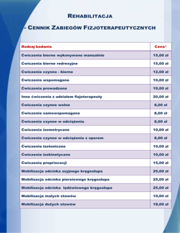 REHABILITACJA - CENNIK ZABIEGÓW FIZJOTERAPEUTYCZNYCH Rodzaj badania Cena* Ćwiczenia bierne wykonywane manualnie 15,00 zł Ćwiczenia bierne redresyjne 15,00 zł Ćwiczenia czynno - bierne 12,00 zł Ćwiczenia wspomagane 10,00 zł Ćwiczenia prowadzone 10,00 zł Inne ćwiczenia z udziałem fizjoterapeuty 20,00 zł Ćwiczenia czynne wolne 8,00 zł Ćwiczenia samowspomagane 8,00 zł Ćwiczenia czynne w odciąŜeniu 8,00 zł Ćwiczenia izometryczne Ćwiczenia czynne w odciąŜeniu z oporem 10,00 zł 8,00 zł Ćwiczenia izotoniczne 10,00 zł Ćwiczenia izokinetyczne 10,00 zł Ćwiczenia propriocecji 15,00 zł Mobilizacja odcinka szyjnego kręgosłupa 25,00 zł Mobilizacja odcinka piersiowego kręgosłupa 25,00 zł Mobilizacja odcinka lędźwiowego kręgosłupa 25,00 zł Mobilizacja malych stawów 10,00 zł Mobilizacja duŜych stawów 18,00 zł Inne ćwiczenia bierne 15,00 zł Ćwiczenia i kinezyterapia oddechowa - oklepywanie 6,00 zł DrenaŜ ułoŜeniowy 8,00 zł Czynne ćwiczenia oddechowe 8,00 zł Ćwiczenia oddechowe czynne z oporem 8,00 zł Nauka kaszlu i odksztuszania 6,00 zł Ćwiczenia równowaŜne 10,00 zł Ćwiczenia rozluźniające i relaksujące 8,00 zł Ćwiczenia sprawności manualnej 8,00 zł Ćwiczenia samoobsługi 8,00 zł Ćwiczenia zespołowe 70,00 zł Ćwiczenia ogólnousprawniające indywidualne 20,00 zł Ćwiczenia ogólnousprawniające grupowe 70,00 zł Ćwiczenia koordynacji ruchowej Poizometryczna relaksacja mięśni 8,00 zł 10,00 zł Ćwiczenia koordynacyjno-równowaŜne wg Frenkla 8,00 zł Ćwiczenia ułoŜeniowe Bürgera 8,00 zł Ćwiczenia synergistyczne 8,00 zł Wyciąg ręczny 15,00 zł Wyciąg mechaniczny 15,00 zł Pionizacja bierna 12,00 zł Pionizacja czynna 12,00 zł Przygotowanie do chodzenia 12,00 zł Nauka czynności lokomocyjnych 12,00 zł Ćwiczenia uŜywania protez i aparatów ortopedycznych 12,00 zł Nauka chodu o kulach i innym sprzęcie pomocniczym 12,00 zł Streching mięśni lub ścięgien 12,00 zł Streching powięzi 12,00 zł Kąpiel wirowa kończyn górnych 10,00 zł Kąpiel wirowa kończyn dolnych 12,00 zł Natrysk - biczowy szkocki 12,00 zł HydromasaŜ podwodny - całkowity 28,00 zł HydromasaŜ podwodny - segmentarny 28,00 zł MasaŜ hydropowietrzny 22,00 zł Diatermia krótkofalowa 10,00 zł Trening interwałowy na bieŜni lub cykloergomertze rowerowym 18,00 zł Trening ciągły na bieŜni lub cykloergometrze rowerowym 18,00 zł Trening stacyjny 12,00 zł Inne ćwiczenia przywracające wydolność układu sercowo naczyniowego 18,00 zł Metody neurofizjologiczne - Metoda NDT Bobath 28,00 zł Metody neurofizjologiczne - Metoda PNF 28,00 zł Plastrowanie dynamiczne /Kinesiology Taping/ 15,00 zł Metody terapii manualnej - Metoda Kaltenborna - Evjenta 25,00 zł Metody terapii manualnej - inne 25,00 zł MasaŜ klasyczny - całkowity 45,00 zł MasaŜ klasyczny - częściowy 18,00 zł Galwanizacja 6,00 zł Jonoforeza 7,00 zł Prądy diadynamiczne 7,00 zł Prądy interferencyjne 7,00 zł Prądy TENS 7,00 zł Prądy KOTZA 7,00 zł Prądy TRABERTA 7,00 zł Naświetlanie promieniami UV - miejscowe 7,00 zł Naświetlanie promieniami IR - miejscowe 5,00 zł Laseroterapia 6,00 zł Laseroterapia punktowa 8,00 zł UltradŜwięki 8,00 zł Fonoforeza 8,00 zł Krioterapia miejscowa ciekłym azotem 8,00 zł Pole elektromagnetyczne wysokiej częstotliwości 8,00 zł Pole magnetyczne stałe i niskiej częstotliwości 6,00 zł MasaŜ wibracyjny 10,00 zł DrenaŜ limfatyczny miejscowy 20,00 zł Elektrostymulacja mięśni Zabiegi fizjoterapeutyczne inne * od 01.01.2011r. do ceny moŜe zostać doliczony podatek VAT zgodnie z obowiązującymi przepisami prawa ZAKŁAD OPIEKI ZDROWOTNEJ MSWIA Z WARMIŃSKO – MAZURSKIM CENTRUM ONKOLOGII W OLSZTYNIE WOJSKA POLSKIEGO 37, 10-228 OLSZTYN 8,00 zł 10,00 zł