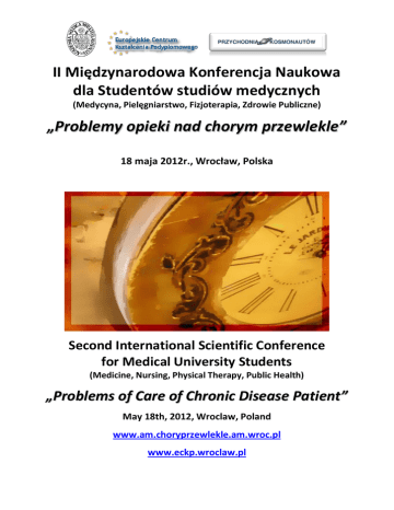 II Międzynarodowa Konferencja Naukowa dla Studentów studiów medycznych (Medycyna, Pielęgniarstwo, Fizjoterapia, Zdrowie Publiczne) „Problemy opieki nad chorym przewlekle” 18 maja 2012r., Wrocław, Polska Second International Scientific Conference for Medical University Students (Medicine, Nursing, Physical Therapy, Public Health) „Problems of Care of Chronic Disease Patient” May 18th, 2012, Wroclaw, Poland www.am.choryprzewlekle.am.wroc.pl www.eckp.wroclaw.pl O KONFERENCJI - INFORMACJE OGÓLNE Tytuł Konferencji: Problemy opieki nad chorym przewlekle. Termin: 18 maja 2012 roku, w godzinach: 9:00 - 16:00 Miejsce: Akademicki Szpital Kliniczny im. Jana Mikulicza-Radeckiego we Wrocławiu, ul. Borowska 213, 50-556 Wrocław, Aula Jana Pawła II Organizator: Studium Kształcenia Podyplomowego Wydział Nauk o Zdrowiu Akademii Medycznej we Wrocławiu ul. K. Bartla 5 51-618 Wrocław Współorganizator: Europejskie Centrum Kształcenia Podyplomowego we Wrocławiu NZOZ „Przychodnia Kosmonautów” Sp. z o.o. we Wrocławiu Współorganizator: Zakład Pielęgniarstwa Internistycznego Wydział Nauk o Zdrowiu Akademii Medycznej we Wrocławiu ul. K. Bartla 5 51-618 Wrocław KOMITET HONOROWY Prof. dr hab. Marek Ziętek Rektor AM we Wrocławiu - Rector of Wroclaw Medical University Rafał Jurkowlaniec Marszałek Województwa Dolnośląskiego - Marshal of the Lower Silesian Voivodeship Prof. dr hab. Bernard Panaszek Dziekan Wydziału Nauk o Zdrowiu AM we Wrocławiu - Dean of the Faculty of Health Science, Wroclaw Medical University Mgr Urszula Olechowska Przewodnicząca Dolnośląskiej Okręgowej Izby Pielęgniarek i Położnych - Chairwoman of the Lower Silesian Chamber of Nurses and Midwives in Wroclaw Prof. dr hab.med. Kierownik Katedry Pielęgniarstwa Klinicznego Wydziału Nauk o Zdrowiu AM we Wrocławiu Dr n. med. Igor Chęcioski Prezes Dolnośląskiej Izby Lekarskiej - Chairman of the Lower Silesian Chamber of Physicians and Dentists KOMITET NAUKOWY - SCIENTIFIC COMMITTEE Przewodnicząca: Dr n. med. Izabella Uchmanowicz Wiceprzewodnicząca: Dr n. med. Joanna Rosioczuk-Tonderys Wrocław, Polska Wrocław, Polska Bernard Panaszek (Wrocław) Jan Mierzwa (Wrocław) Ireneusz Całkosiński, (Wrocław) Irena Wolska-Zogata ( Wrocław) Eleni Kletsiou, (Ateny,Grecja) Monica Parry (Toronto, Canada) Beata Jankowska-Polańska (Wrocław) Członkowie: Dominik Krzyżanowski (Wrocław) Sylwia Krzemińska (Wrocław) Diane Carroll (Boston, USA) Sabina De Geest (Basel, Szwajcaria) Lynne Hinterbuchner (Salzburg, Austria) Małgorzta Paprocka-Borowicz (Wrocław) Jacek Smereka (Wrocław, Polska) Jakub Trnka (Wrocław, Polska) Dorota Zyśko (Wrocław, Polska KOMITET ORGANIZACYJNY - ORGANIZING COMMITTEE Przewodnicząca: Dr n. med. Joanna Rosioczuk-Tonderys Wiceprzewodniczący: Dr n. med. Beata Jankowska-Polaoska Sekretarz: Mgr Stanisław Manulik Członkowie: Mgr Krzysztof Aleksandrowicz Dr Bartosz Uchmanowicz Dr Iwona Mielczarek-Kawałko Mgr Sławomir Jarząb Mgr Ewa Molka Studenci Studenckiego Koła Pielęgniarstwa Internistycznego Wydziału Nauk o Zdrowiu AM we Wrocławiu. Problemy opieki nad chorym przewlekle Chronic Disease Patient - therapeutical, nursing and rehabilitative perspective PROGRAM RAMOWY 9:00 - 9:10 Powitanie gości i otwarcie Konferencji- Opening Ceremony 9:10 - 10:30 Sesja I - inauguracyjna. Wystąpienia zaproszonych wykładowców-Opening Session 10:25-10.45 Przerwa kawowa 10:45 - 11:45 Sesja II. Pielęgnowanie w chorobach przewlekłych - praktyka pielęgniarska oparta na faktach Session II. Chronic disease nursing - evidence based nursing 11:45 - 12:00 Przerwa kawowa 12:00 - 12:45 Sesja III. Opieka medyczna nad chorym przewlekle Session III. Medical care of chronic disease patient 12.45-13.00 Przerwa kawowa 13:00 - 14:30 Sesja IV. Rehabilitacja w chorobach przewlekłych Session IV. Rehabilitation of chronic disease patient 14:30 - 14:45 Przerwa kawowa 14:45 - 15:45 Sesja V. Jakośd życia pacjentów w chorobach przewlekłych Session V. Quality of life of chronic disease patients 15:45 - 16:00 Zakooczenie Konferencji- Closing Ceremony WAŻNE TERMINY I INFORMACJE-IMPORTANT MATTERS Tylko drogą elektroniczną Rejestracja uczestnictwa czynnego i opłata rejestracyjna Rejestracja uczestnictwa biernego i opłata rejestracyjna Nadsyłanie pełnych prac do publikacji Konferencja Terminy od 01.09.2011 do 10.02.2012 od 01.09.2011 do 10.05.2012 od 01.09.2011 do 10.02.2012 18.05.2012 Nadsyłane prace (spełniające warunki publikacji naukowej) będą publikowane w recenzowanych monografiach: prace w języku polskim w monografii pod tytułem „Problemy opieki nad chorym przewlekle” prace w języku angielskim w monografii pod tytułem „Problems of Care of Chronic Disease Patient” (obie monografie pod redakcją Joanny Rosioczuk-Tonderys oraz Izabelli Uchmanowicz). Warunkiem uczestnictwa w Konferencji (zarówno czynnego jak i biernego) jest dokonanie opłaty rejestracyjnej. OPŁATY: Opłata za udział w Konferencji wynosi: 50,00 zł Opłata konferencyjna obejmuje: - udział w sesjach naukowych, - materiały z Konferencji, - otrzymanie certyfikatu, - poczęstunek w przerwach kawowych. Opłata za wydruk pracy w monografii: 100 zł W przypadku zgłaszania większej liczby prac koszt publikacji każdej kolejnej pracy koszt wynosi kolejne 100,00 zł. Przykłady poprawnego wyliczenia kwoty opłaty konferencyjnej: 1. Wyłącznie uczestnictwo w Konferencji, bez zgłaszania pracy => 50,00 zł. 2. Uczestnictwo w Konferencji i zgłoszenie jednej pracy => 150,00 zł. 3. Uczestnictwo w Konferencji i zgłoszenie dwóch prac => 250,00 zł. W przypadku gdy nie zostanie zakwalifikowana jedna z prac nastąpi zwrot kwoty 100,00 zł, Wpłaty należy dokonywad na konto: Numer konta bankowego: 82 1140 2004 0000 3302 6240 8960 Europejskie Centrum Kształcenia Podyplomowego: ul. Piłsudskiego 13, 50-048 Wrocław z dopiskiem: Konferencja Chory Przewlekle, imię i nazwisko uczestnika Rezygnacja z uczestnictwa: - do 20.02.2011 r