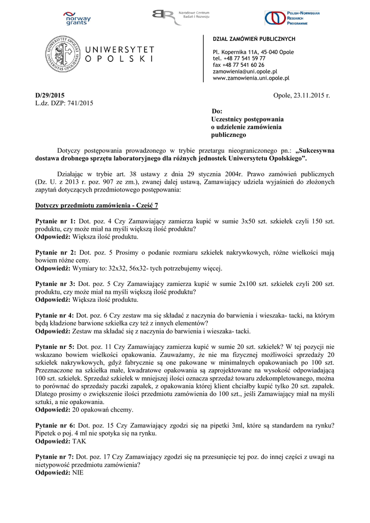 DZIAŁ ZAMÓWIEŃ PUBLICZNYCH Pl. Kopernika 11A, 45–040 Opole tel. +48 77 541 59 77 fax +48 77 541 60 26 [email protected] www.zamowienia.uni.opole.pl D/29/2015 L.dz. DZP: 741/2015 Opole, 23.11.2015 r. Do: Uczestnicy postępowania o udzielenie zamówienia publicznego Dotyczy postępowania prowadzonego w trybie przetargu nieograniczonego pn.: „Sukcesywna dostawa drobnego sprzętu laboratoryjnego dla różnych jednostek Uniwersytetu Opolskiego”. Działając w trybie art. 38 ustawy z dnia 29 stycznia 2004r. Prawo zamówień publicznych (Dz. U. z 2013 r. poz. 907 ze zm.), zwanej dalej ustawą, Zamawiający udziela wyjaśnień do złożonych zapytań dotyczących przedmiotowego postępowania: Dotyczy przedmiotu zamówienia - Cześć 7 Pytanie nr 1: Dot. poz. 4 Czy Zamawiający zamierza kupić w sumie 3x50 szt. szkiełek czyli 150 szt. produktu, czy może miał na myśli większą ilość produktu? Odpowiedź: Większa ilość produktu. Pytanie nr 2: Dot. poz. 5 Prosimy o podanie rozmiaru szkiełek nakrywkowych, różne wielkości mają bowiem różne ceny. Odpowiedź: Wymiary to: 32x32, 56x32- tych potrzebujemy więcej. Pytanie nr 3: Dot. poz. 5 Czy Zamawiający zamierza kupić w sumie 2x100 szt. szkiełek czyli 200 szt. produktu, czy może miał na myśli większą ilość produktu? Odpowiedź: Większa ilość produktu. Pytanie nr 4: Dot. poz. 6 Czy zestaw ma się składać z naczynia do barwienia i wieszaka- tacki, na którym będą kładzione barwione szkiełka czy też z innych elementów? Odpowiedź: Zestaw ma składać się z naczynia do barwienia i wieszaka- tacki. Pytanie nr 5: Dot. poz. 11 Czy Zamawiający zamierza kupić w sumie 20 szt. szkiełek? W tej pozycji nie wskazano bowiem wielkości opakowania. Zauważamy, że nie ma fizycznej możliwości sprzedaży 20 szkiełek nakrywkowych, gdyż fabrycznie są one pakowane w minimalnych opakowaniach po 100 szt. Przeznaczone na szkiełka małe, kwadratowe opakowania są zaprojektowane na wysokość odpowiadającą 100 szt. szkiełek. Sprzedaż szkiełek w mniejszej ilości oznacza sprzedaż towaru zdekompletowanego, można to porównać do sprzedaży paczki zapałek, z opakowania której klient chciałby kupić tylko 20 szt. zapałek. Dlatego prosimy o zwiększenie ilości przedmiotu zamówienia do 100 szt., jeśli Zamawiający miał na myśli sztuki, a nie opakowania. Odpowiedź: 20 opakowań chcemy. Pytanie nr 6: Dot. poz. 15 Czy Zamawiający zgodzi się na pipetki 3ml, które są standardem na rynku? Pipetek o poj. 4 ml nie spotyka się na rynku. Odpowiedź: TAK Pytanie nr 7: Dot. poz. 17 Czy Zamawiający zgodzi się na przesunięcie tej poz. do innej części z uwagi na nietypowość przedmiotu zamówienia? Odpowiedź: NIE DZIAŁ ZAMÓWIEŃ PUBLICZNYCH Pl. Kopernika 11A, 45–040 Opole tel. +48 77 541 59 77 fax +48 77 541 60 26 [email protected] www.zamowienia.uni.opole.pl Pytanie nr 8: Dot. poz. 17 Jeśli Zamawiający nie zgadza się na powyższe to prosimy o podanie jakiego rodzaju ma być szkło do noży ultramikrotomowych. Odpowiedź: Zamawiający nie wie jakie to ma być szkło, szkło będzie łamane w typowej, starej łamarce, prowadzącego interesuje ostrze do cięcia. Dotyczy umowy – zał. nr 4 do SIWZ Pytanie nr 9: Dot. §3 pkt. 3 Czy Zamawiający zgodzi się na odstąpienie od konieczności potwierdzania zamówienia w terminie 24 godzin? Czynność ta jest niepotrzebną procedurą. Biorąc pod uwagę ilość zamówień, którą dziennie obsługują Wykonawcy jest to znacznym obciążeniem dla ich wydajności procesu realizacji zamówień. Odpowiedź: TAK Pytanie nr 10: Dot. §5 pkt. 1 Czy Zamawiający zgodzi się na skrócenie terminu gwarancji do 12 miesięcy? Sama umowa ma trwać krócej, bo maksymalnie 12 miesięcy. Odpowiedź: TAK Pytanie nr 11: Dot. §5 pkt. 6 Czy Zamawiający zgodzi się odstąpić od tego punktu, biorąc pod uwagę, że w ramach np. części 2 czy 7 jest zaledwie 11 oraz 21 pozycji asortymentowych? Analiza wykorzystania umowy w przypadku tak niewielkiego zamówienia nie nastręcza trudności i jest możliwa do wykonania w krótkim czasie przez Zamawiającego na podstawie otrzymanych faktur. Ponadto wykonywanie takiej analizy co miesiąc jest nader częstą czynnością biorąc pod uwagę zarówno zakres ilościowy produktów, jak i niewielką wartość przedmiotu zamówienia w ramach wyżej wskazanych części. Odpowiedź: TAK Pytanie nr 12: Dot. §6 pkt. 1 c) Czy Zamawiający zgodzi się na obniżenie kary i naliczanie jej od wartości towaru niedostarczonego? Nie ma powodu naliczać karę również od wartości towaru już dostarczonego w ramach danego zamówienia. Odpowiedź: NIE Dotyczy przedmiotu zamówienia – Pakiet 1B część 2 Pytanie nr 13: Czy Zamawiający w poz. 2 i 6 wymaga tych samych końcówek, różniących się jedynie wielkością opakowania zbiorczego? Odpowiedź: TAK Pytanie nr 14: Czy Zamawiający w poz. 5 dopuszcza końcówki o pojemności 1-200ul? Odpowiedź: TAK Pytanie nr 15: Czy Zamawiający w poz. 6 dopuszcza końcówki w opakowaniu zbiorczym 1000szt? Odpowiedź: TAK Pytanie nr 16: Czy Zamawiający w poz. 7 dopuszcza końcówki o pojemności 1000-5000ul? Odpowiedź: TAK Dotyczy przedmiotu zamówienia - część 1G Pytanie nr 17: Pozycja nr. 17. Proszę Podać więcej szczegółów na temat „szkło do noży ultramikrotomowych 25x6x406 (op. 30 szt)". Proszę podać producenta ultramikrotomu. DZIAŁ ZAMÓWIEŃ PUBLICZNYCH Pl. Kopernika 11A, 45–040 Opole tel. +48 77 541 59 77 fax +48 77 541 60 26 [email protected] www.zamowienia.uni.opole.pl Odpowiedź: Producent mikrotomu (noży): Tesla, to stare ultramikrotomy. Pytania do załącznika numer 1F Pytanie nr 18: Pozycja nr. 42 Proszę podać średnicę sita, wysokość oraz z czego ma być wykonana obudowa- metal lub plastik ? Odpowiedź: poz 42: wymiary sita to: średnica 22,5 cm, wysokość 5,5 cm, obudowa plastikowa Pytanie nr 19: Pozycja nr. 43 - Proszę aby określić jedną wielkość tryskawki którą nale