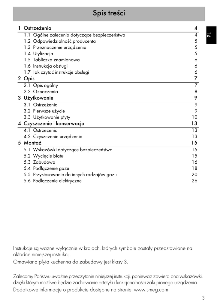 Spis treści 1.1 1.2 1.3 1.4 1.5 1.6 1.7 4 Ogólne zalecenia dotyczące bezpieczeństwa Odpowiedzialność producenta Przeznaczenie urządzenia Utylizacja Tabliczka znamionowa Instrukcja obsługi Jak czytać instrukcje obsługi 4 5 5 5 6 6 6 2 Opis 7 2.1 Opis ogólny 2.2 Oznaczenia 7 8 3 Użytkowanie 3.1 Ostrzeżenia 3.2 Pierwsze użycie 3.3 Użytkowanie płyty 4 Czyszczenie i konserwacja 4.1 Ostrzeżenia 4.2 Czyszczenie urządzenia 5 Montaż 5.1 5.2 5.3 5.4 5.5 5.6 Wskazówki dotyczące bezpieczeństwa Wycięcie blatu Zabudowa Podłączenie gazu Przystosowanie do innych rodzajów gazu Podłączenie elektryczne PL 1 Ostrzeżenia 9 9 9 10 13 13 13 15 15 15 16 18 20 26 Instrukcje są ważne wyłącznie w krajach, których symbole zostały przedstawione na okładce niniejszej instrukcji. Omawiana płyta kuchenna do zabudowy jest klasy 3. Zalecamy Państwu uważne przeczytanie niniejszej instrukcji, ponieważ zawiera ona wskazówki, dzięki którym możliwe będzie zachowanie estetyki i funkcjonalności zakupionego urządzenia. Dodatkowe informacje o produkcie dostępne na stronie: www.smeg.com 3 Ostrzeżenia 1 Ostrzeżenia 1.1 Ogólne zalecenia dotyczące bezpieczeństwa Szkody powstałe na osobach • Urządzenie i jego elementy są bardzo gorące podczas użytkowania. • Podczas użytkowania nie należy dotykać elementów grzejnych. • Dzieci poniżej 8 roku życia nie powinny przebywać w pobliżu urządzenia bez opieki osoby dorosłej. • Urządzenie nie służy do zabawy. • Podczas użytkowania nie kłaść na urządzeniu metalowych przedmiotów takich, jak widelce, łyżki i pokrywki. • Po zakończeniu użytkowania wyłączyć urządzenie. • Nie należy nigdy próbować gasić płomienia lub pożaru wodą: wyłączyć urządzenie i nakryć płomień pokrywą lub ognioodporną narzutą. • Czynności związane z czyszczeniem i konserwacją nie powinny być wykonywane przez dzieci bez nadzoru. • Montaż i naprawy powinny być wykonywane przez wykwalifikowany personel zgodnie z obowiązującymi przepisami. • Nie wprowadzać zmian na urządzeniu. • Nie wkładać ostro zakończonych metalowych przedmiotów (sztućce lub przyrządy) do szczelin. 4 • Nigdy nie próbować naprawiać urządzenia samodzielnie lub bez pomocy wykwalifikowanego specjalisty. • Jeśli przewód zasilania elektrycznego jest uszkodzony, należy natychmiast skontaktować się z serwisem technicznym, który dokona jego wymiany. Uszkodzenie urządzenia • Nie stosować ściernych lub agresywnych detergentów (np. produktów z granulkami, odplamiaczy i metalowych gąbek) na częściach szklanych. • Ewentualnie używać drewnianych lub plastikowych narzędzi. • Nie siadać na urządzeniu. • Nie stosować pary do czyszczenia urządzenia. • Nie zatykać otworów, szczelin wentylacyjnych i odprowadzających ciepło. • Nie zostawiać urządzenia bez nadzoru podczas przyrządzania potraw, które mogą wydzielać tłuszcz lub olej. • Nie zostawiać przedmiotów na powierzchniach gotowania. • W żadnym razie nie używać urządzenia do ogrzewania pomieszczeń. Ostrzeżenia Producent nie ponosi żadnej odpowiedzialności za szkody osobowe lub rzeczowe powstałe w wyniku: • użycia urządzenia w sposób niezgodny z przeznaczeniem, • nieprzestrzegania zaleceń zawartych w instrukcji użytkowania, • naruszenia chociaż jednej części urządzenia, • używania nieoryginalnych części zamiennych. 1.3 Przeznaczenie urządzenia Urządzenie jest przeznaczone do przyrządzania potraw w warunkach domowych. Każde inne użycie jest nieprawidłowe. Urządzenie nie może być używane przez osoby (w tym dzieci) o ograniczonych zdolnościach psychofizycznych lub nieposiadające odpowiedniego doświadczenia lub wiedzy, chyba że będzie się to odbywać pod kontrolą osób dorosłych odpowiedzialnych za ich bezpieczeństwo. 1.4 Utylizacja Urządzenie należy poddać utylizacji oddzielnie od innych odpadów (dyrektywy 2002/95/WE, 2002/96/WE, 2003/108/WE). Urządzenie nie zawiera substancji w ilości niebezpiecznej dla zdrowia i środowiska, zgodnie z obowiązującymi dyrektywami europejskimi. Aby dokonać utylizacji urządzenia należy: PL 1.2 Odpowiedzialność producenta Napięcie elektryczne Niebezpieczeństwo porażenia prądem • Odłączyć główne zasilanie elektryczne. • Odłączyć przewód zasilający od instalacji elektrycznej. • Odłączyć przewód zasilania elektrycznego i usunąć go razem z wtyczką. • Powierzyć urządzenie odpowiednim centrom selektywnej zbiórki odpadów elektrycznych i elektronicznych lub oddać sprzedawcy w momencie zakupu podobnego urządzenia. Opakowanie urządzenia zostało wykonane z materiałów, które nie zanieczyszczają środowiska i nadają się do recyklingu. • Materiały z opakowania należy oddać do odpowiednich punktów selektywnej zbiórki odpadów. Opakowania z tworzyw sztucznych Niebezpieczeństwo uduszenia się • Nie pozostawiać opakowania i jego elementów bez nadzoru. • Dzieci nie powinny bawić się plastikowymi torebkami z opakowania. 5 Ostrzeżenia 1.5 Tabliczka znamionowa 1.7 Jak czytać instrukcje obsługi Tabliczka znamionowa zawiera dane techniczne, numer seryjny i oznaczenie. Nie wolno zdejmować tabliczki znamionowej. W instrukcji zastosowano następujące symbole ułatwiające czytanie: 1.6 Instrukcja obsługi Niniejsza instrukcja stanowi integralną część urządzenia i powinna być przechowywana w całości oraz w zasięgu ręki użytkownika przez cały okres eksploatacji urządzenia. Przed użyciem urządzenia należy uważnie przeczytać niniejszą instrukcję obsługi. Ostrzeżenia Ogólne informacje dotyczące instrukcji obsługi, bezpieczeństwa i końcowej utylizacji. Opis Opis urządzenia i akcesoriów. Użytkowanie Informacje o użytkowaniu urządzenia i akcesoriów, porady dotyczące przyrządzania potraw. Czyszczenie i konserwacja Informacje dotyczące prawidłowego czyszczenia i konserwacji urządzenia. Mo