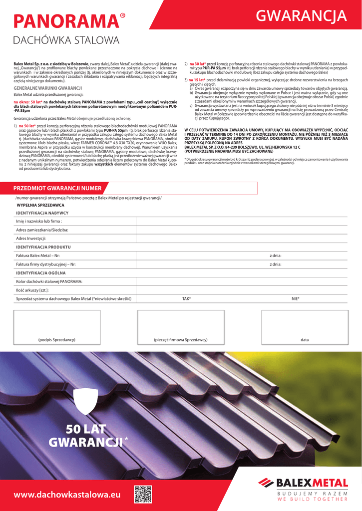 GWARANCJA Balex Metal Sp. z o.o. z siedzibą w Bolszewie, zwany dalej „Balex Metal”, udziela gwarancji (dalej zwanej „Gwarancją”) na profilowane blachy powlekane przeznaczone na pokrycia dachowe i ścienne na warunkach i w zakresie określonych poniżej (tj. określonych w niniejszym dokumencie oraz w szczegółowych warunkach gwarancji i zasadach składania i rozpatrywania reklamacji, będących integralną częścią niniejszego dokumentu). GENERALNE WARUNKI GWARANCJI Balex Metal udziela przedłużonej gwarancji: na okres: 50 lat* na dachówkę stalową PANORAMA z powłokami typu „coil coating”, wyłącznie dla blach stalowych powlekanych lakierem poliuretanowym modyfikowanym poliamidem PUR-PA 55µm Gwarancja udzielona przez Balex Metal obejmuje przedłużoną ochronę: 1) na 50 lat* przed korozją perforacyjną rdzenia stalowego blachodachówki modułowej PANORAMA oraz gąsiorów lub/i blach płaskich z powłokami typu PUR-PA 55µm (tj. brak perforacji rdzenia stalowego blachy w wyniku utleniania) w przypadku zakupu całego systemu dachowego Balex Metal tj. (dachówka stalowa PANORAMA, gąsior modułowy, dachówka krawędziowa PANORAMA, obróbki systemowe i/lub blacha płaska, wkręt FARMER CORONA™ 4.8 X30 TX20, orynnowanie WIJO Balex, membrana Aspira w przypadku użycia w konstrukcji membrany dachowej). Warunkiem uzyskania przedłużonej gwarancji na dachówkę stalową PANORAMA, gąsiory modułowe, dachówkę krawędziową PANORAMA, obróbki systemowe i/lub blachę płaską jest przedłożenie ważnej gwarancji wraz z nadanym unikalnym numerem, potwierdzenia odesłania listem poleconym do Balex Metal kuponu z niniejszej gwarancji oraz faktury zakupu wszystkich elementów systemu dachowego Balex od producenta lub dystrybutora. 2) na 30 lat* przed korozją perforacyjną rdzenia stalowego dachówki stalowej PANORAMA z powłokami typu PUR-PA 55µm (tj. brak perforacji rdzenia stalowego blachy w wyniku utleniania) w przypadku zakupu blachodachówki modułowej (bez zakupu całego systemu dachowego Balex) 3) na 15 lat* przed delaminacją powłoki organicznej, wyłączając drobne rozwarstwienia na brzegach giętych i ciętych. a) Okres gwarancji rozpoczyna się w dniu zawarcia umowy sprzedaży towarów objętych gwarancją. b) Gwarancja obejmuje wyłącznie wyroby wykonane w Polsce i jest ważna wyłącznie, gdy są one użytkowane na terytorium Rzeczypospolitej Polskiej (gwarancja obejmuje obszar Polski) zgodnie z zasadami określonymi w warunkach szczegółowych gwarancji. c) Gwarancja wystawiana jest na wniosek kupującego złożony nie później niż w terminie 3 miesięcy od zawarcia umowy sprzedaży po wprowadzeniu gwarancji na listę prowadzoną przez Centralę Balex Metal w Bolszewie (potwierdzenie obecności na liście gwarancji jest dostępne do weryfikacji przez Kupującego). W CELU POTWIERDZENIA ZAWARCIA UMOWY, KUPUJĄCY MA OBOWIĄZEK WYPEŁNIĆ, ODCIĄĆ I PRZESŁAĆ W TERMINIE DO 14 DNI PO ZAKOŃCZENIU MONTAŻU, NIE PÓŹNIEJ NIŻ 3 MIESIĄCE OD DATY ZAKUPU, KUPON ZWROTNY Z KOŃCA DOKUMENTU. WYSYŁKA MUSI BYĆ NADANA PRZESYŁKĄ POLECONĄ NA ADRES BALEX METAL SP. Z O.O. 84-239 BOLSZEWO, UL. WEJHEROWSKA 12 C (POTWIERDZENIE NADANIA MUSI BYĆ ZACHOWANE) * Długość okresu gwarancji może być krótsza niż podana powyżej, w zależności od miejsca zamontowania i użytkowania produktu oraz stopnia narażenia zgodnie z warunkami szczegółowymi gwarancji. PRZEDMIOT GWARANCJI NUMER /numer gwarancji otrzymają Państwo pocztą z Balex Metal po rejestracji gwarancji/ WYPEŁNIA SPRZEDAWCA IDENTYFIKACJA NABYWCY Imię i nazwisko lub firma : Adres zamieszkania/Siedziba: Adres Inwestycji: IDENTYFIKACJA PRODUKTU Faktura Balex Metal – Nr: z dnia: Faktura firmy dystrybucyjnej – Nr: z dnia: IDENTYFIKACJA OGÓLNA Kolor dachówki stalowej PANORAMA: Ilość arkuszy [szt.]: Sprzedaż systemu dachowego Balex Metal (*niewłaściwe skreślić) (podpis Sprzedawcy) TAK*NIE* (pieczęć firmowa Sprzedawcy) * data WARUNKI SZCZEGÓŁOWE 1.Gwarancja dotyczy wyłącznie blach powlekanych określonych w Generalnych warunkach gwarancji nabytych przez klienta (zwanego dalej również „kupującym”), stosowanych na zewnątrz w środowisku typowym dla klimatu umiarkowanego z kategorią korozyjności do C5 ( wg PN-EN ISO 12944-2:2001 Farby i lakiery). Ochrona przed korozją konstrukcji stalowych za pomocą ochronnych systemów malarskich. Część 2: Klasyfikacja środowisk oraz blach stosowanych do wewnątrz z kategorią korozyjności C1 do C5 (A1 do A5) 2. Okres długości ochrony gwarancyjnej uzależniony jest od miejsca zamontowania i użytkowania produktu, a co za tym idzie od stopnia narażenia tego produktu na środowisko korozyjne, zgodnie z zasadami wyszczególnionymi poniżej: a) Balex Metal określa ilość lat przedłużonej gwarancji na korozję perforacyjną rdzenia z punktu 1 Generalnych warunków gwarancji dla następujących rodzajów środowisk: C2 – 50 lat, C3 – 40 lat, C4 – 30 lat, C5 – 10 lat b) Balex Metal określa ilość lat gwarancji na korozję perforacyjną rdzenia z punktu 2 Generalnych warunków gwarancji dla następujących rodzajów środowisk: C2 – 30 lat, C3 – 20 lat, C4 – 15 lat, C5 – 5 latBalex Metal określa ilość lat gwarancji na delaminację powłoki organicznej z punktu 3 Generalnych warunków gwarancji dla następujących rodzajów środowisk: C2 – 15 lat, C3 – 10 lat, C4 – 5 lat, C5 – 3 lata c) Obszar miejski o intensywnym zanieczyszczeniu (C5) nie podlega gwarancji. Klasyfikacja środowiska korozyjności jest oparta o założenia, że nie występują narażenia szczególne, które mogłyby powodować znaczące zwiększenie korozji, w szczególności takie jak: a) narażenia chemiczne – pochodzące z funkcjonowania instalacji – kwasy, alkalia lub sole, rozpuszczalniki organiczne, agresywne gazy i cząstki kurzu, b) narażenia mechaniczne – ścieranie ( erozja) przez porwane przez wiatr cząstki ( np. piasek), c) nara