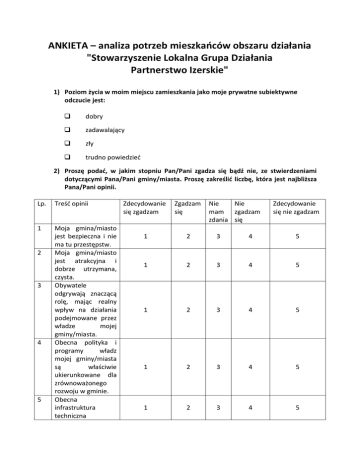 ANKIETA – analiza potrzeb mieszkańców obszaru działania "Stowarzyszenie Lokalna Grupa Działania Partnerstwo Izerskie" 1) Poziom życia w moim miejscu zamieszkania jako moje prywatne subiektywne odczucie jest: dobry zadawalający zły trudno powiedzieć 2) Proszę podać, w jakim stopniu Pan/Pani zgadza się bądź nie, ze stwierdzeniami dotyczącymi Pana/Pani gminy/miasta. Proszę zakreślić liczbę, która jest najbliższa Pana/Pani opinii. Lp. Treść opinii 1 Moja gmina/miasto jest bezpieczna i nie ma tu przestępstw. Moja gmina/miasto jest atrakcyjna i dobrze utrzymana, czysta. Obywatele odgrywają znaczącą rolę, mając realny wpływ na działania podejmowane przez władze mojej gminy/miasta. Obecna polityka i programy władz mojej gminy/miasta są właściwie ukierunkowane dla zrównoważonego rozwoju w gminie. Obecna infrastruktura techniczna 2 3 4 5 Zdecydowanie się zgadzam Zgadzam się Nie Nie mam zgadzam zdania się Zdecydowanie się nie zgadzam 1 2 3 4 5 1 2 3 4 5 1 2 3 4 5 1 2 3 4 5 1 2 3 4 5 6 7 8 9 (wodociągi/kanalizac ja/gazyfikacja/drogi) w mojej gminie/mieście jest na poziomie zadawalającym i nie wymaga natychmiastowych interwencji Obecna oferta kulturalna oferowana przez władze mojego miasta/gminy jest dla mnie wystarczająca i zapewnia moje potrzeby Obecna oferta uprawiania sportów (uwzględniając również infrastrukturę sportową) w moim mieście/gmina jest dla mnie wystarczająca i zapewnia moje potrzeby Poziom oferty edukacyjnej w moim mieście/gminie jest atrakcyjny i zapewnia potrzeby dzieci Oferta zajęć, programów skierowanych dla osób starszych 50+ w moim mieście i gminie jest ciekawa i zapewnia potrzeby osób w tym wieku 1 2 3 4 5 1 2 3 4 5 1 2 3 4 5 1 2 3 4 5 3) Proszę wymienić 5 najważniejszych spraw, które powinny zostać rozwiązane w Pana/Pani miejscu zamieszkania: (gdzie 1 jest najważniejsze a 5 najmniej ważne) a. Utrzymanie ulic (odśnieżanie, czystość, jakość dróg) ___ b. Kształcenie dorosłych (uniwersytety III wieku) ___ c. Programy pozaszkolnej edukacji dla młodzieży ___ d. Bezpieczeństwo publiczne ___ e. Programy kulturalne dla seniorów ___ f. Pomoc dla matek z małymi dziećmi i ułatwienie powrotu do pracy dla młodych matek ___ g. Rozwój infrastruktury i wyposażenia instytucji kultury ___ h. Możliwości rekreacyjne i turystyczne___ i. Zwiększenie infrastruktury sportowej ___ j. Parki i przestrzenie publiczne ___ k. Publiczność i jawność wydawania środków publicznych ___ l. Zwiększony wpływ społeczności w decyzjach publicznych dotyczących inwestycji infrastrukturalnych i przestrzeni publicznych ___ m. Sprawna zbiórka odpadów ___ n. Wodociągi i jakość wody ___ o. Sieci kanalizacyjne ___ p. Stan dróg ___ q. Możliwość rozwoju przedsiębiorców w regionie, tworzenie specjalnej oferty dla przedsiębiorców___ r. Możliwość rozwoju przedsiębiorców w regionie i stosowanie przyjaznych procedur rozwoju inwestycyjnego dla przedsiębiorców przez urzędników___ s. Inne (jakie?) _______________________________________ 4) Jaki typ wydarzeń, imprez kulturalnych powinien znaleźć się w ofercie kulturalnej Pana/Pani gminy/miasta? Można zaznaczyć tylko dwa typy. koncerty muzyczne, wystawy czasowe, okolicznościowe, spektakle teatralne, spotkania z ciekawymi ludźmi, pokazy filmowe, imprezy kulinarne (festyny, pikniki) aktywne formy edukacji kulturalnej i turystycznej jakimi są gry terenowe, questy inne (podaj jakie?)………………………………………………………………………………..………… 5) Jak Pan/Pani ocenia ofertę kulturalną (imprezy, zajęcia edukacyjno/artystyczno/rekreacyjne) świetlicy wiejskiej lub ośrodku kultury znajdującego się w Pani/Pana miejscu zamieszkania? bardzo urozmaicona, atrakcyjna, ciekawa w pełni zaspokaja moje potrzeby kulturalne prawie nic się nie dzieje w ogóle się nic nie dzieje nie mam wiedzy co się dzieje w tych obiektach nie dotyczy, w moim miejscu zamieszkania nie ma takich obiektów 6) W ostatnim roku najbardziej wspominam następujące wydarzenie kulturalne jakie odbyło się w moim miejscu zamieszkania w którym wzięłam/wziąłem udział. Proszę o krótki opis: ……………………………………………………………………………………………………………………. ……………………………………………………………………………………………………………………………… nie brałem/brałam udziału w żadnym wydarzeniu kulturalnym w ostatnim roku organizowanym w mojej miejscowości 7) Jak Pan/Pani ocenia ofertę rekreacyjno – turystyczną (rajdy rowerowe, piesze, noridc walking, spływy kajakowe i inne) ośrodka kultury i/lub sportu w miejscu zamieszkania? bardzo urozmaicona, atrakcyjna, ciekawa w pełni zaspokaja moje potrzeby kulturalne prawie nic się nie dzieje w ogóle się nic nie dzieje nie dotyczy 8) W ostatnim roku najbardziej wspominam następujące wydarzenie rekreacyjnoturystyczne jakie odbyło się w moim miejscu zamieszkania lub gminie w którym wzięłam/wziąłem udział. Proszę o krótki opis: ……………………………………………………………………………………………………………………. ……………………………………………………………………………………………………………………………… nie brałem/brałam udziału w żadnym wydarzeniu rekreacyjno-turystycznym w ostatnim roku organizowanym w mojej miejscowości/gminie 9) Jak Pan/Pani ocenia działalność biblioteki (imprezy, konkursy, zajęcia edukacyjno/artystyczno/rekreacyjne, spotkania literackie) w miejscu zamieszkania lub w mieście/gminie? bardzo urozmaicona, atrakcyjna, ciekawa w pełni zaspokaja moje potrzeby kulturalne prawie nic się nie dzieje w ogóle się nic nie dzieje nie dotyczy 10) W ostatnim roku najbardziej wspominam następujące wydarzenie organizowane przez bibliotekę jakie 