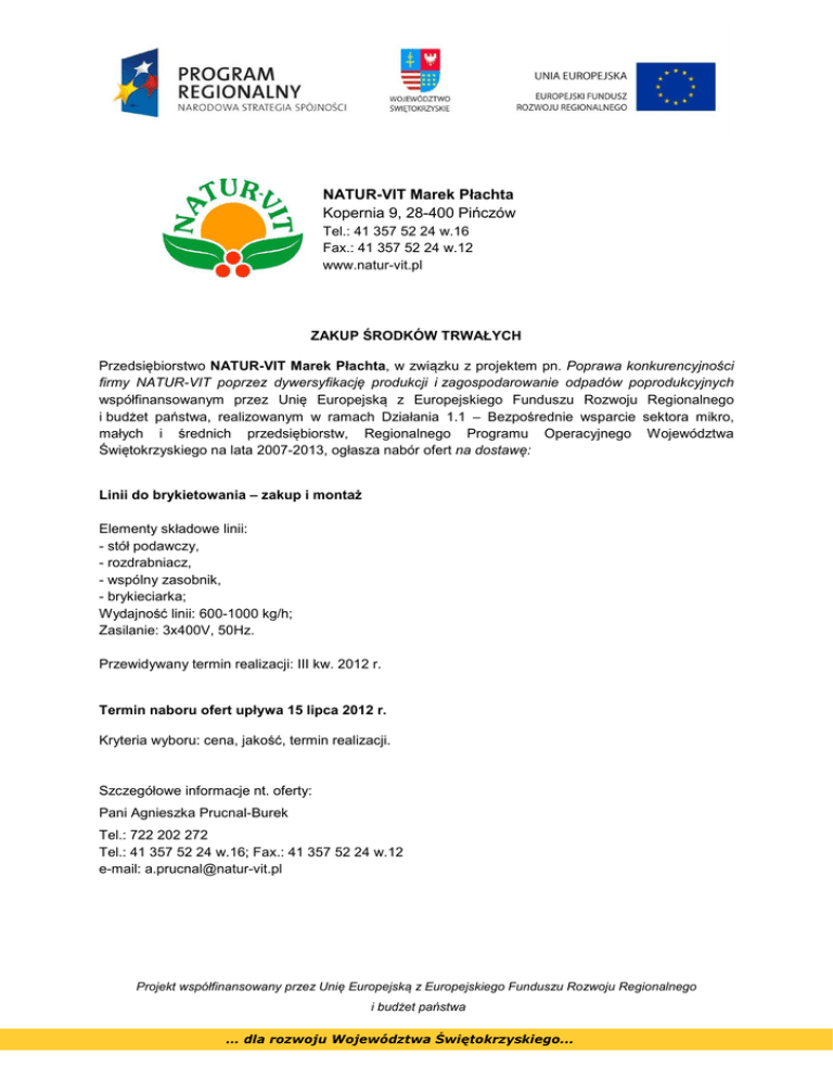 NATUR-VIT Marek Płachta Kopernia 9, 28-400 Pińczów Tel.: 41 357 52 24 w.16 Fax.: 41 357 52 24 w.12 www.natur-vit.pl ZAKUP ŚRODKÓW TRWAŁYCH Przedsiębiorstwo NATUR-VIT Marek Płachta, w związku z projektem pn. Poprawa konkurencyjności firmy NATUR-VIT poprzez dywersyfikację produkcji i zagospodarowanie odpadów poprodukcyjnych współfinansowanym przez Unię Europejską z Europejskiego Funduszu Rozwoju Regionalnego i budżet państwa, realizowanym w ramach Działania 1.1 – Bezpośrednie wsparcie sektora mikro, małych i średnich przedsiębiorstw, Regionalnego Programu Operacyjnego Województwa Świętokrzyskiego na lata 2007-2013, ogłasza nabór ofert na dostawę: Linii do brykietowania – zakup i montaż Elementy składowe linii: - stół podawczy, - rozdrabniacz, - wspólny zasobnik, - brykieciarka; Wydajność linii: 600-1000 kg/h; Zasilanie: 3x400V, 50Hz. Przewidywany termin realizacji: III kw. 2012 r. Termin naboru ofert upływa 15 lipca 2012 r. Kryteria wyboru: cena, jakość, termin realizacji. Szczegółowe informacje nt. oferty: Pani Agnieszka Prucnal-Burek Tel.: 722 202 272 Tel.: 41 357 52 24 w.16; Fax.: 41 357 52 24 w.12 e-mail: [email protected] Projekt współfinansowany przez Unię Europejską z Europejskiego Funduszu Rozwoju Regionalnego i budżet państwa … dla rozwoju Województwa Świętokrzyskiego...